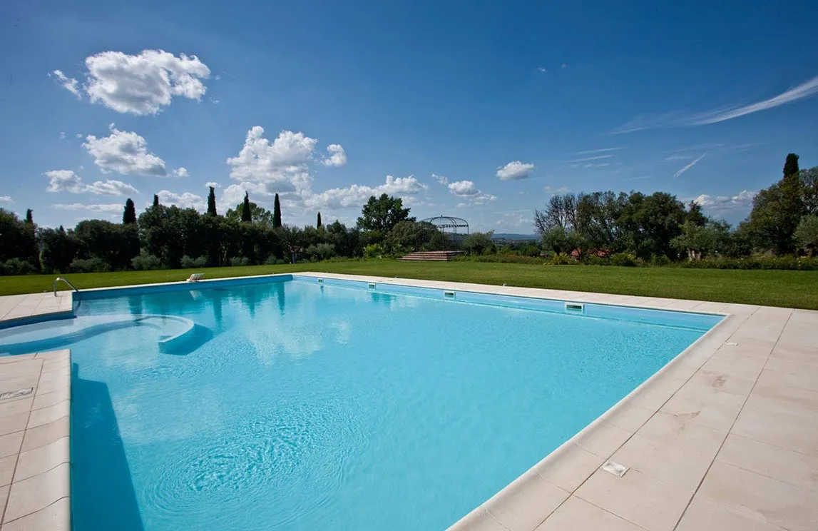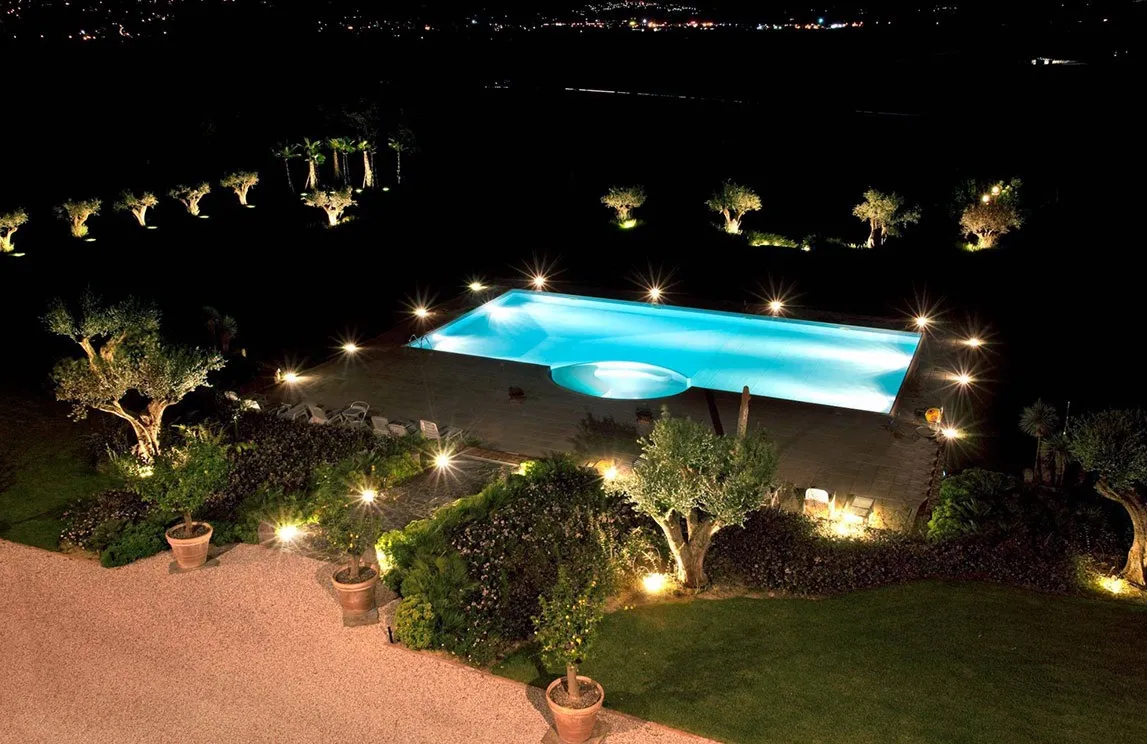 We installed a high-performance Toro® irrigation system using rainwater recovery tanks, alongside a dramatic LED lighting design featuring recessed lights for trees and “spike” lights for pathways. The skimmer-style pool is bordered by Carrara Marble. The landscape was further enhanced by dry-stone walls made of tuff, offering a classic “split-stone” aesthetic. Completing the work are powder-coated wrought-iron gazebos and high-end, strictly “Made in Italy” outdoor furniture.