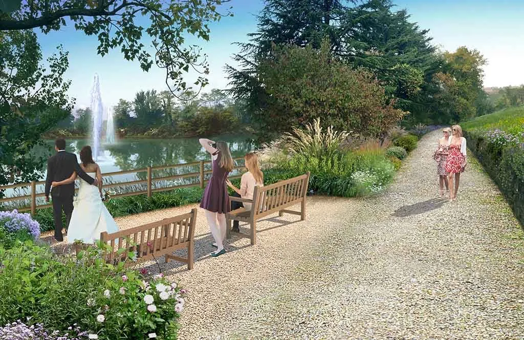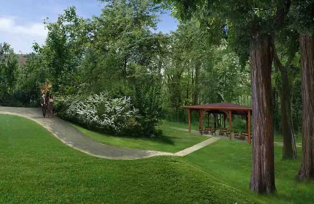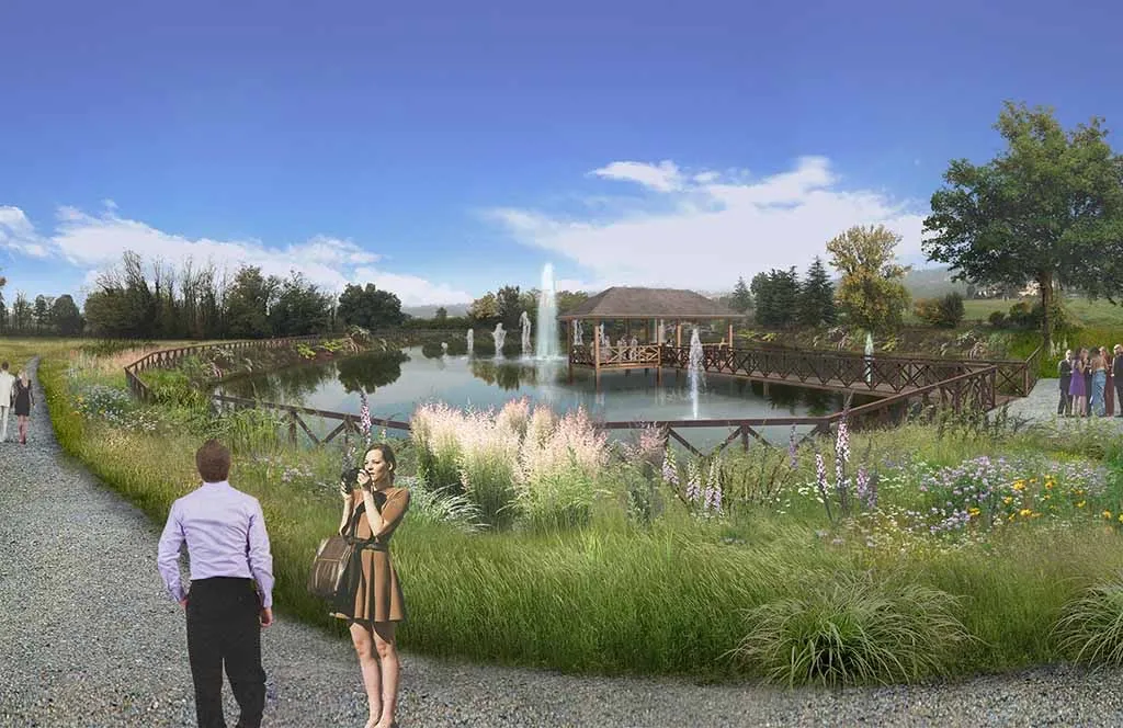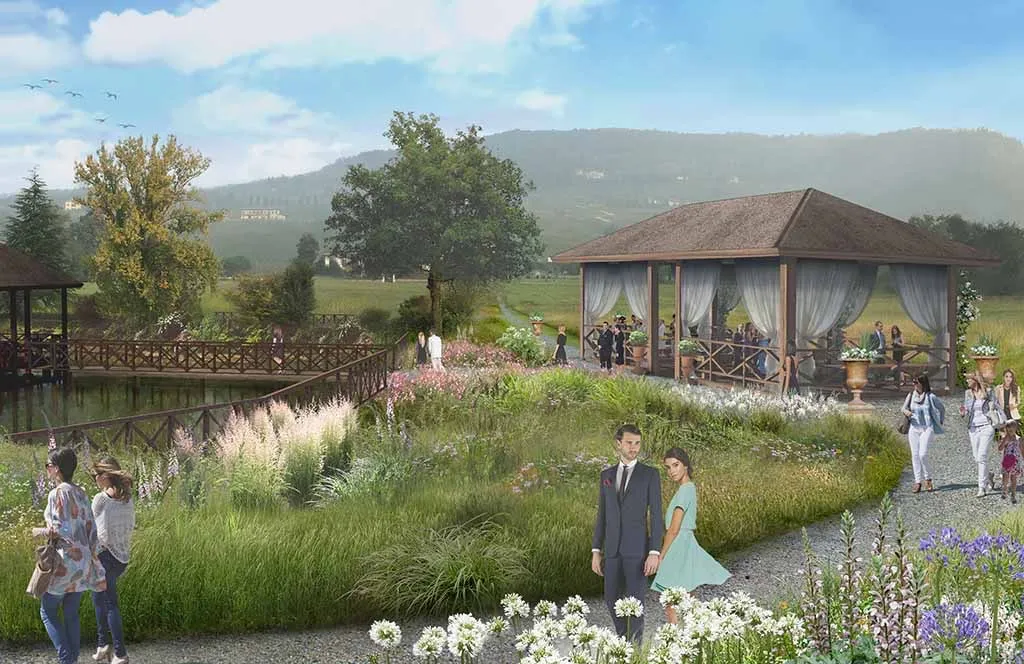 A detailed park design for an 18th-century villa destined to become a premier events venue. The park is rich in detail, featuring artificial lakes with waterfalls, ceremonial structures, functional play areas, nature trails, and relaxation zones—a unique, elegant, and romantic setting perfect for any special occasion.