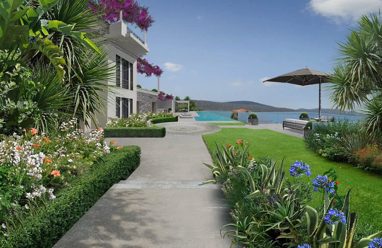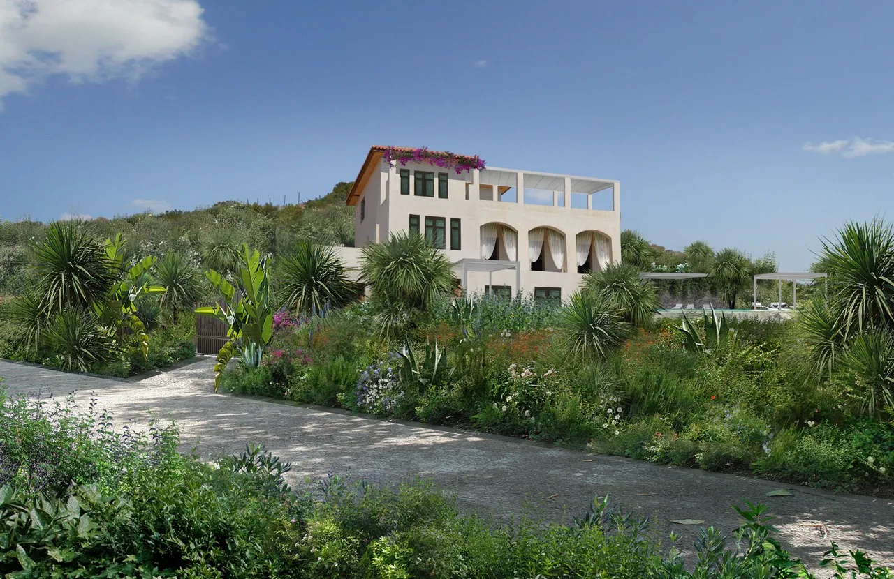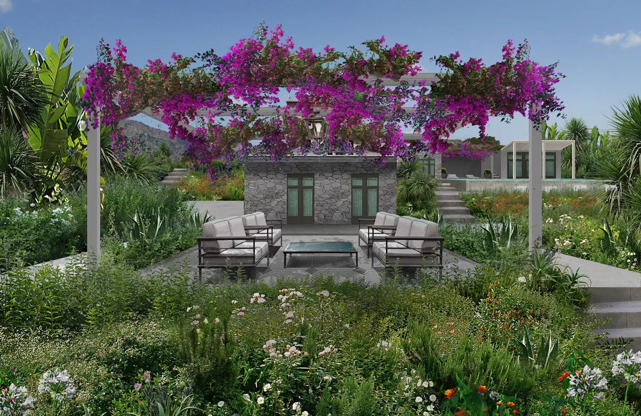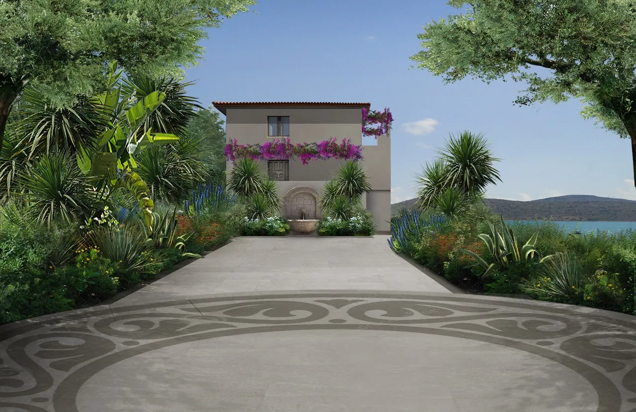 The art of Ancient Greece interpreted through the style of Spazio Verde. A detailed and lush landscape design for a complex of villas on the island of Crete.