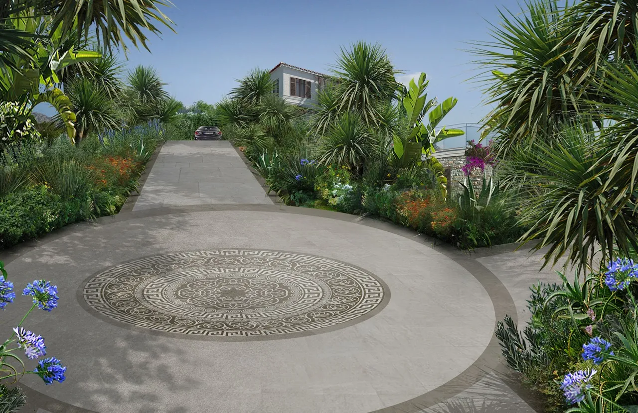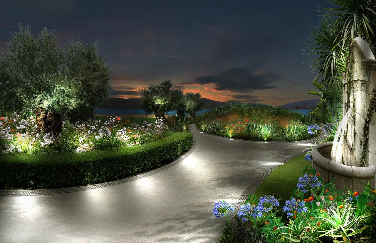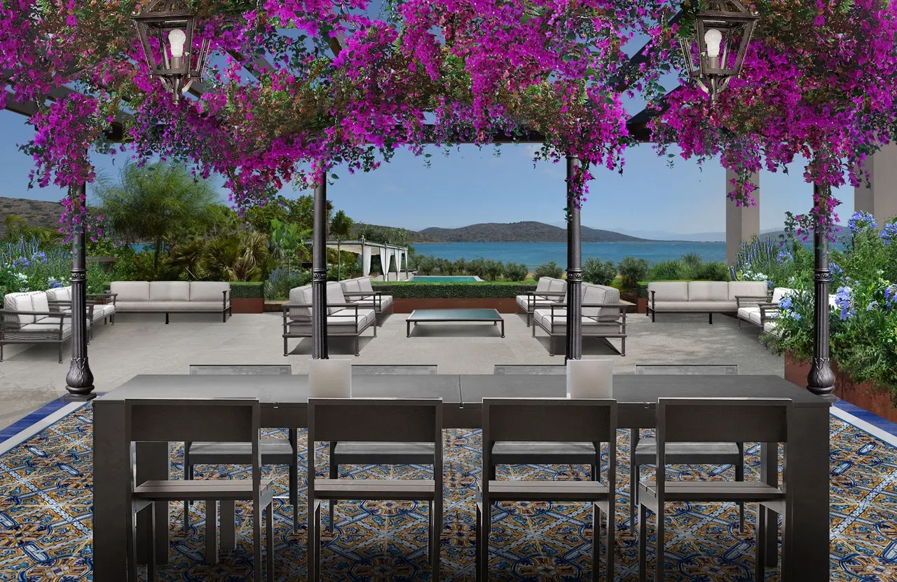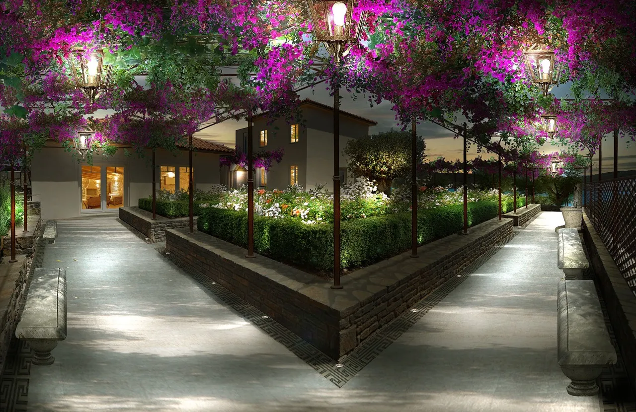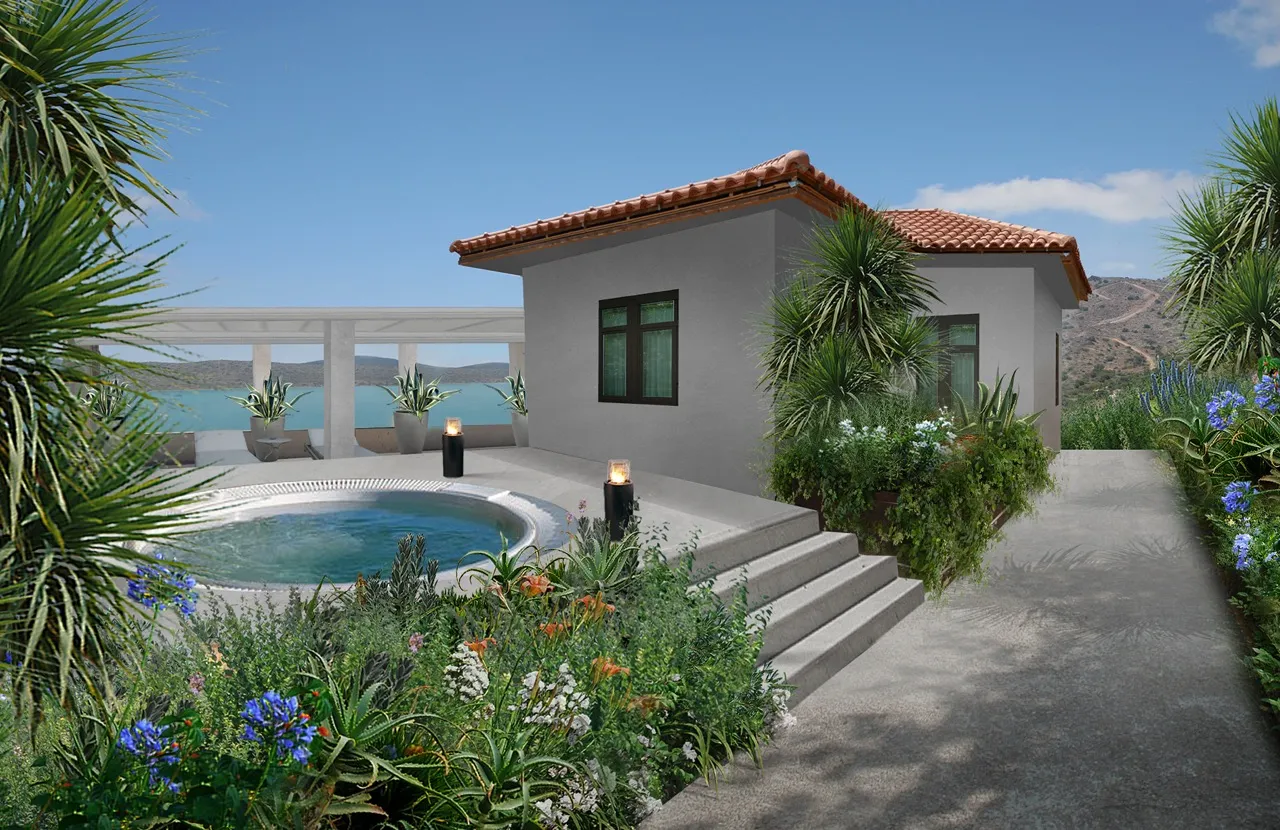 The art of Ancient Greece interpreted through the style of Spazio Verde. A detailed and lush landscape design for a complex of villas on the island of Crete.