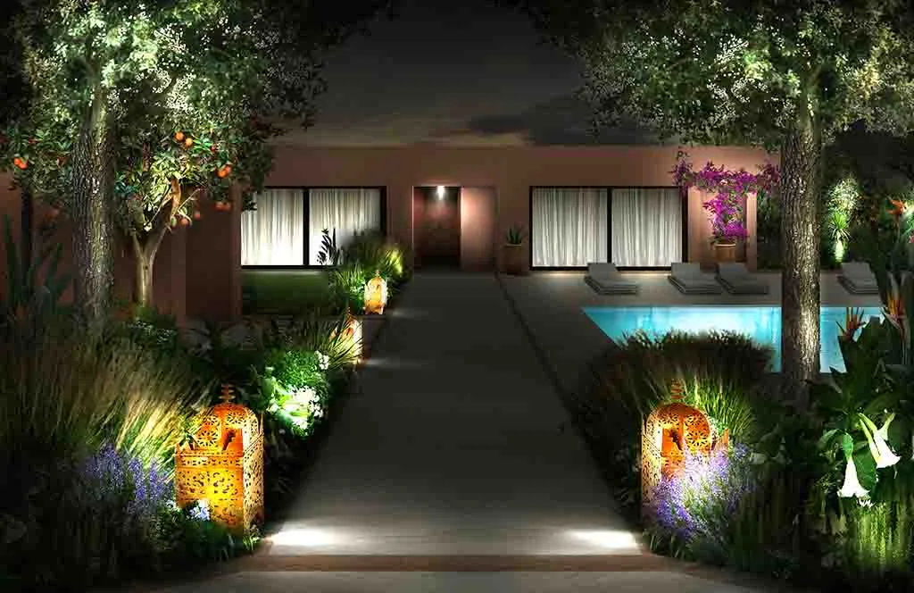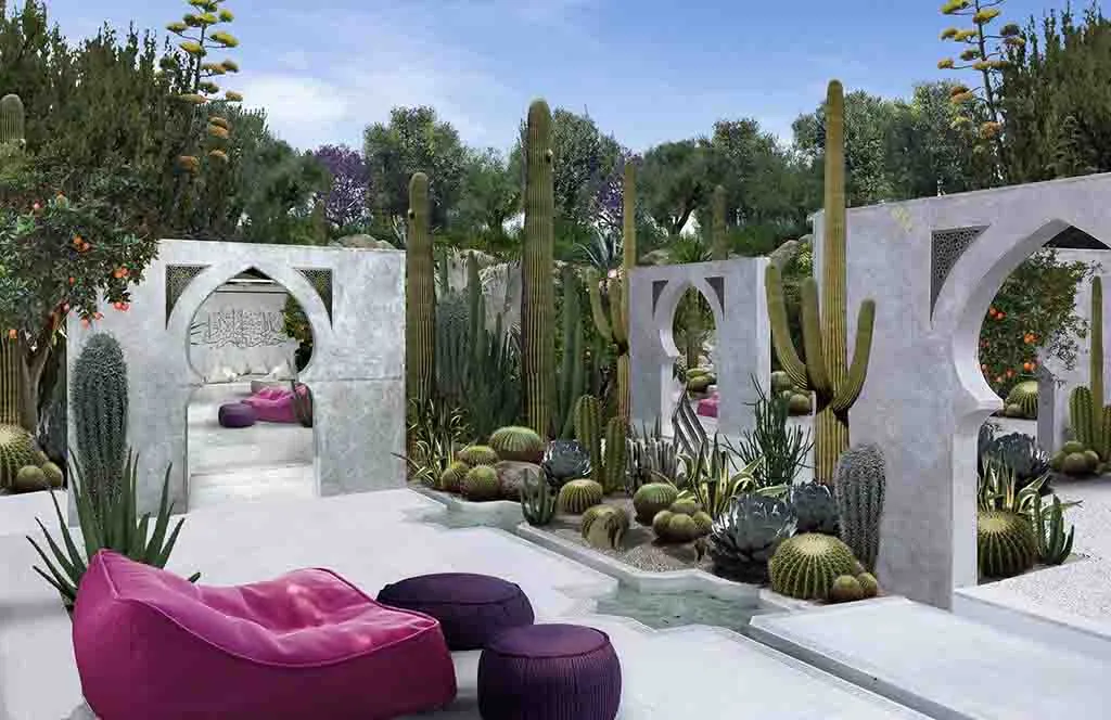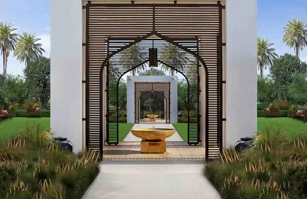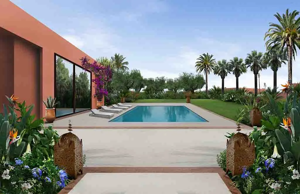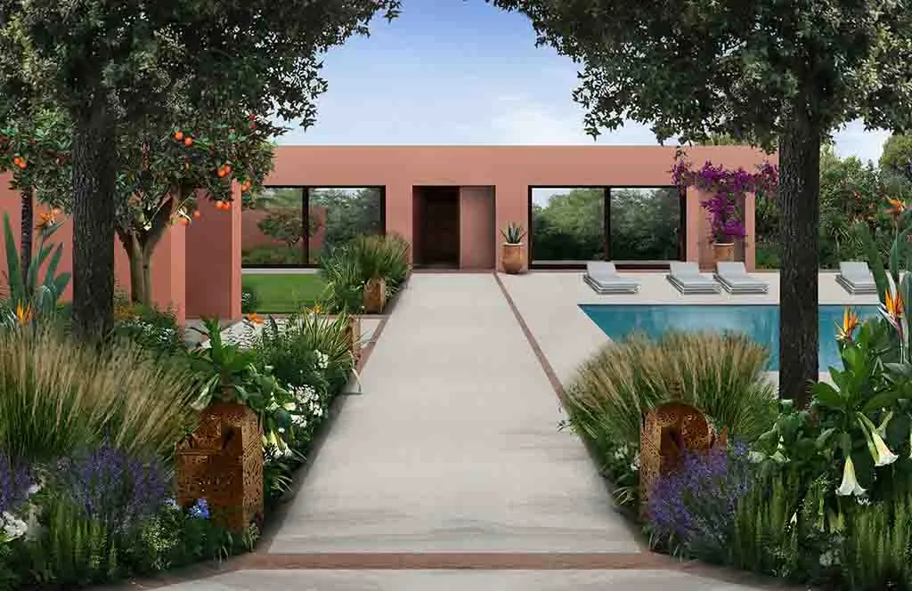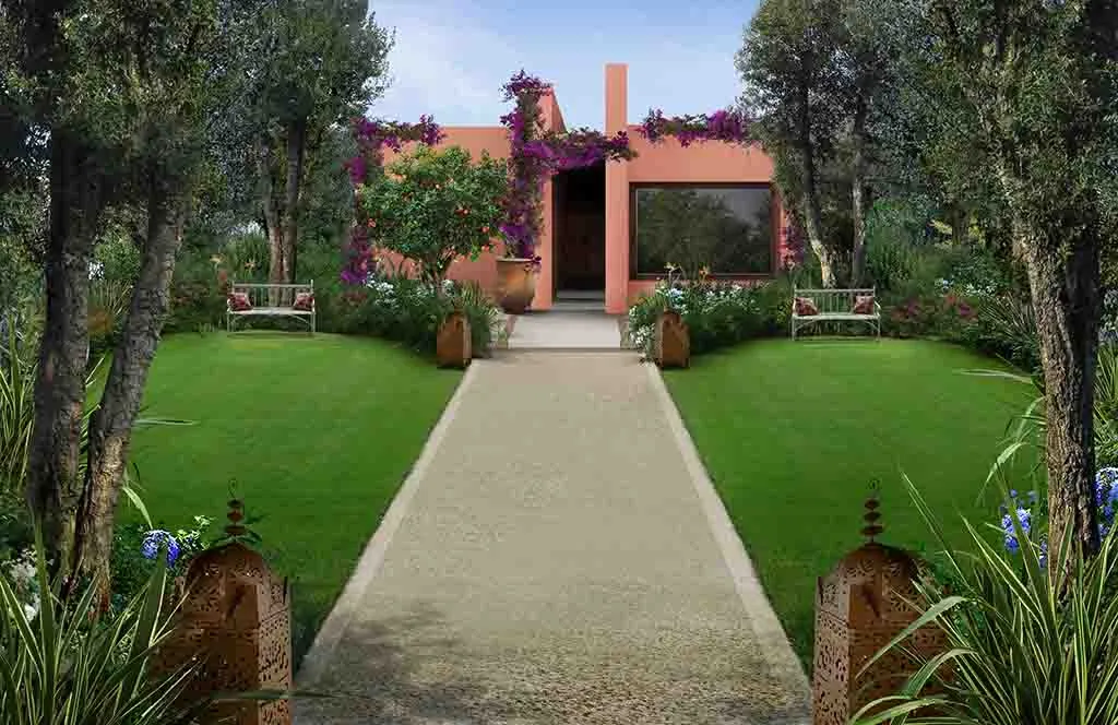 Romance in Marrakech: the design of a luxurious Guest House where the intricate paving details, architectural trellises, and bespoke furnishings create a truly characteristic and unparalleled atmosphere.