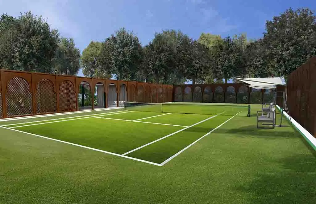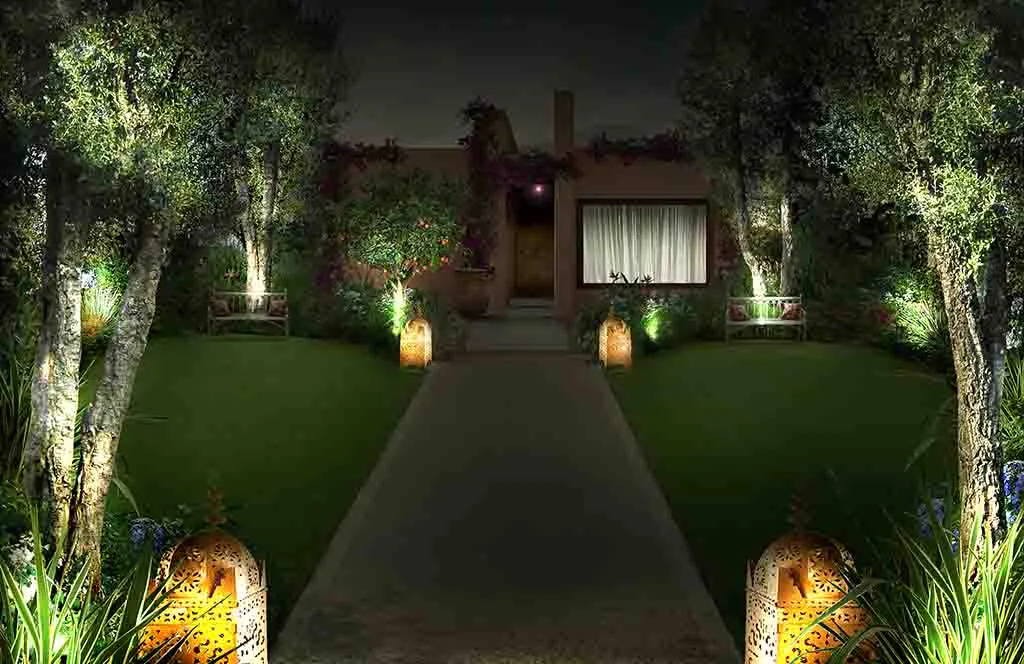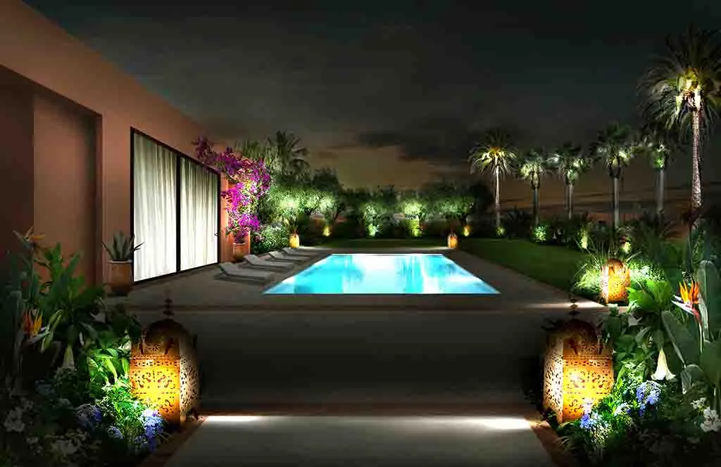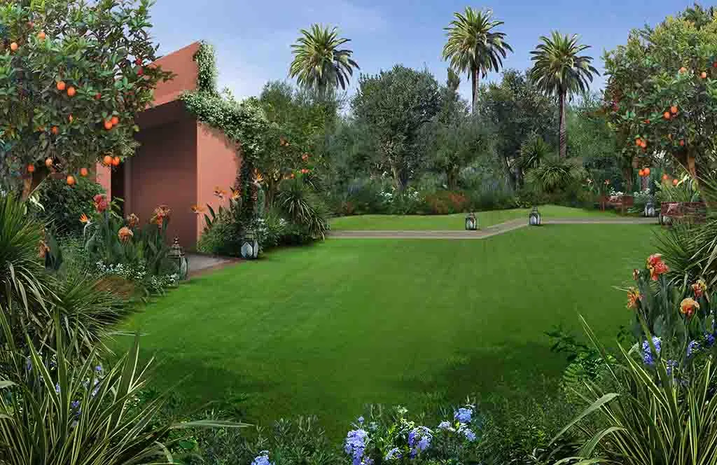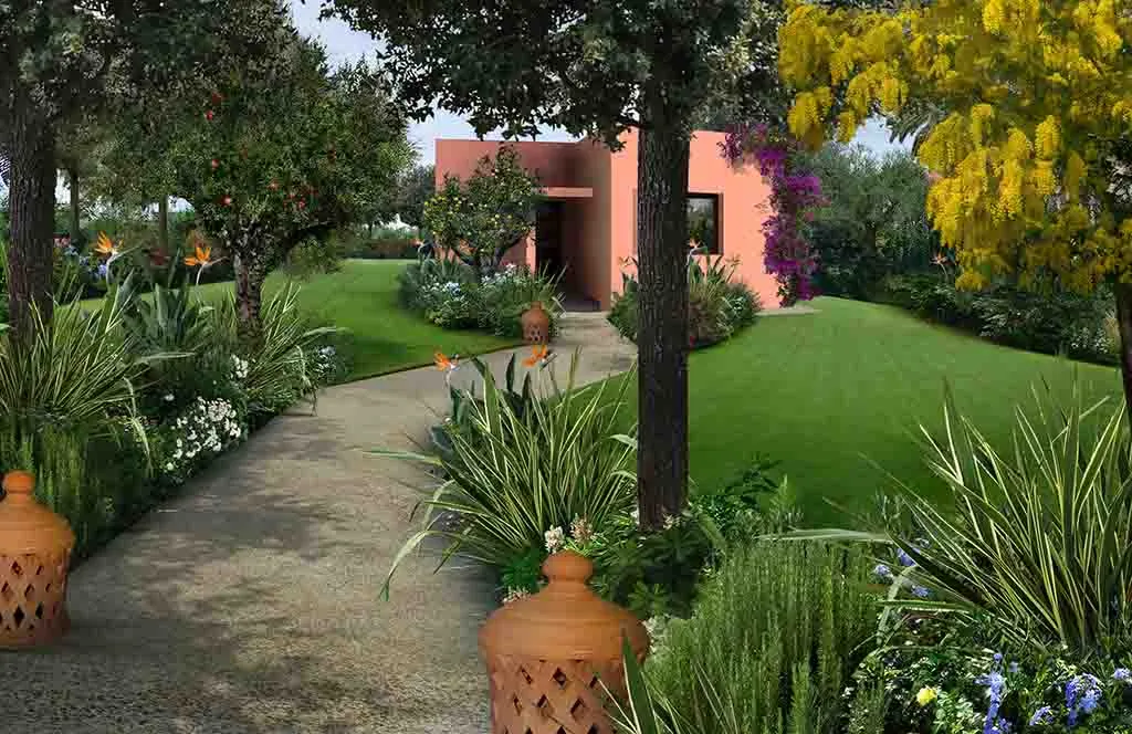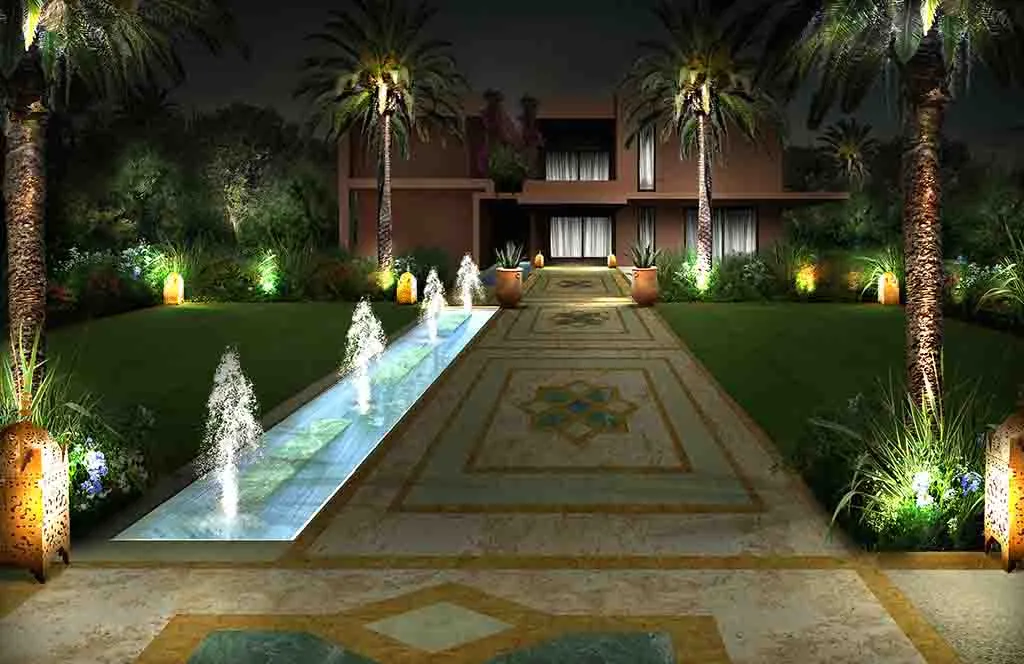 Romance in Marrakech: the design of a luxurious Guest House where the intricate paving details, architectural trellises, and bespoke furnishings create a truly characteristic and unparalleled atmosphere.