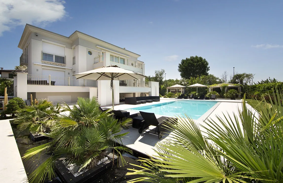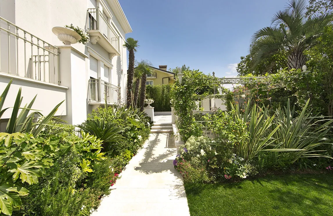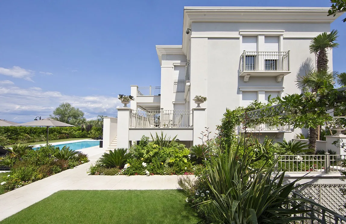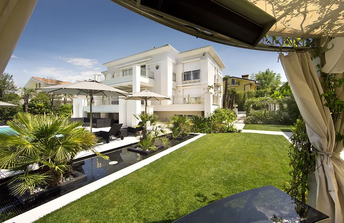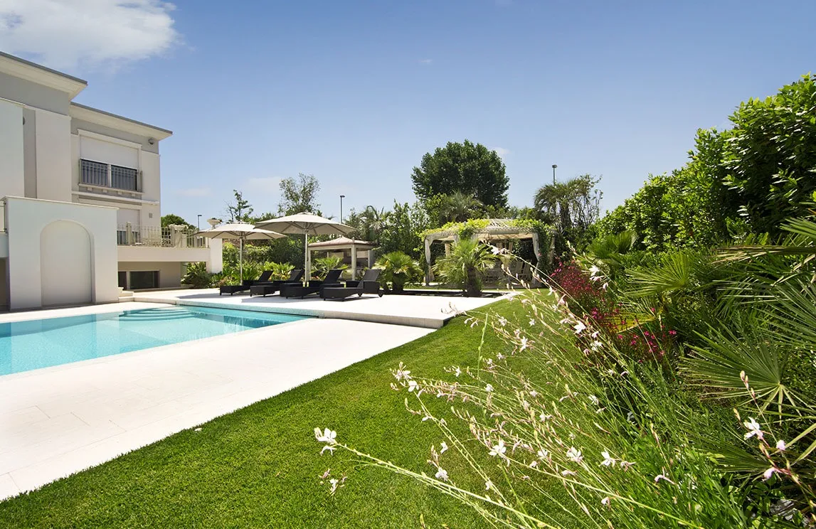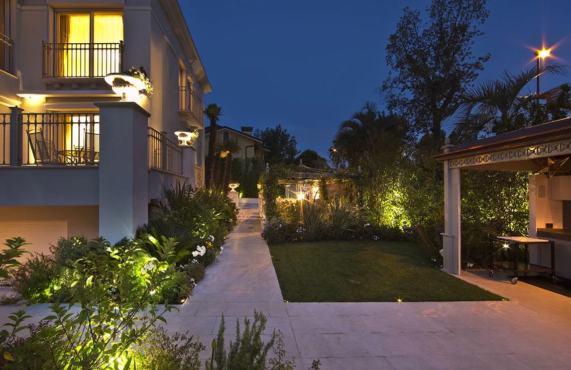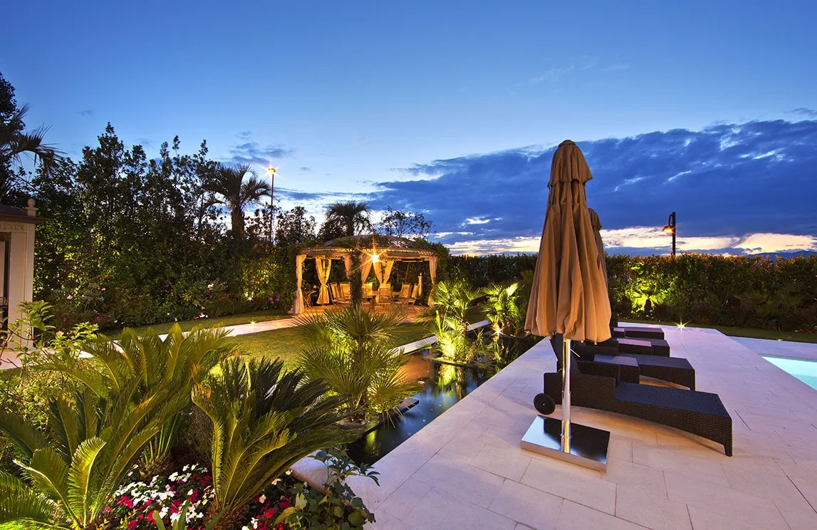 The project is completed by an outdoor kitchen and high-end furnishings, pergolas, and a gazebo (serving as a cover for the external kitchen). From a technical standpoint, the intervention utilized premium water-saving materials and drainage systems for the recovery of rainwater and surface runoff. The lighting design features dramatic low-consumption LED technology alongside functional service lighting. Additional high-tech features include a mist cooling system with aromatic vaporizers, heating lamps, and a distributed sound system throughout the entire property.