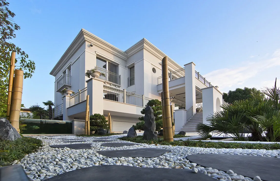 The focal points of this project include an infinity pool with an automated electric slatted cover and integrated whirlpool, pedestrian paths in Carrara marble, and spectacular mosaic-lined fountains with built-in planters. The entrance features a fountain with a mirror-pool and waterfall, alongside a purified pond for a collection of Japanese Koi carp, complemented by a dedicated Zen garden corner.