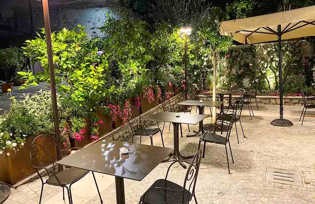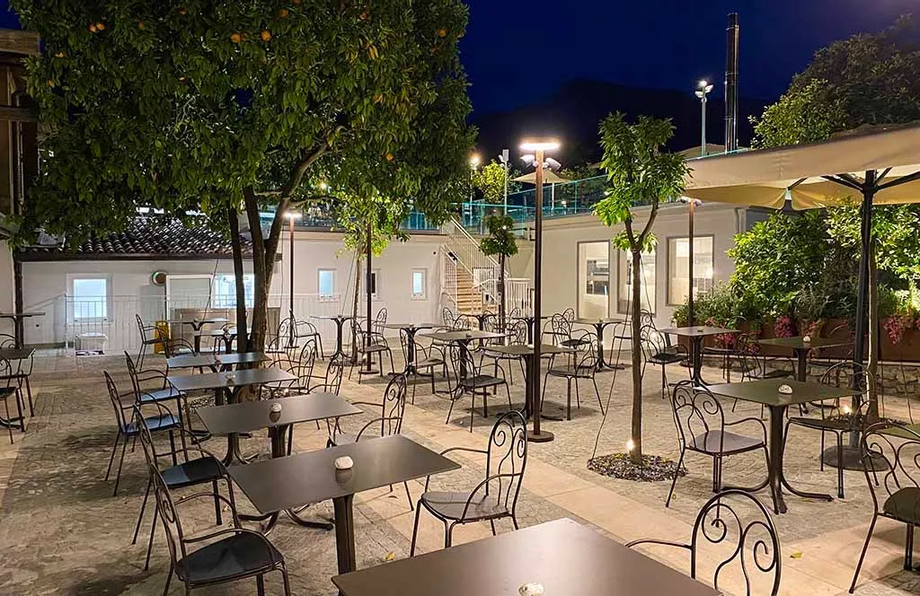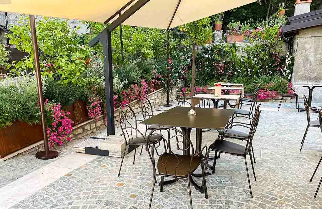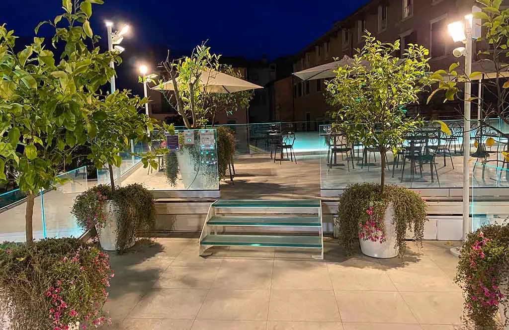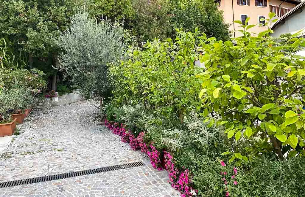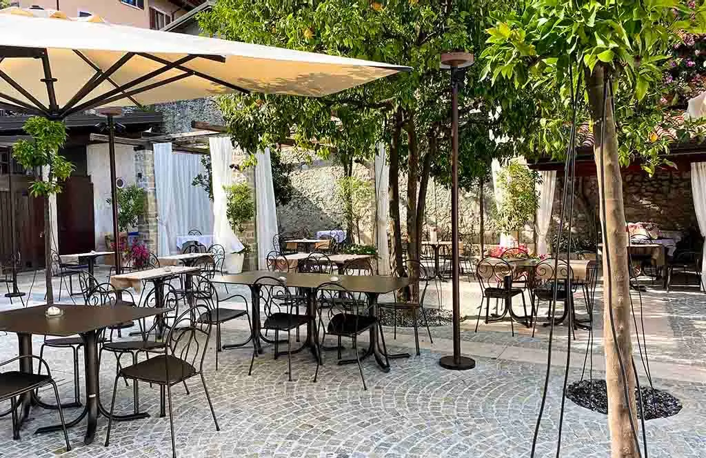 The creation of the outdoor green area for a renowned restaurant, located on the lakefront of a characteristic historic center on Lake Garda. Featuring internal courtyards and terraces with panoramic views, the atmosphere is defined by citrus trees and planters filled with Mediterranean flowers and palms.