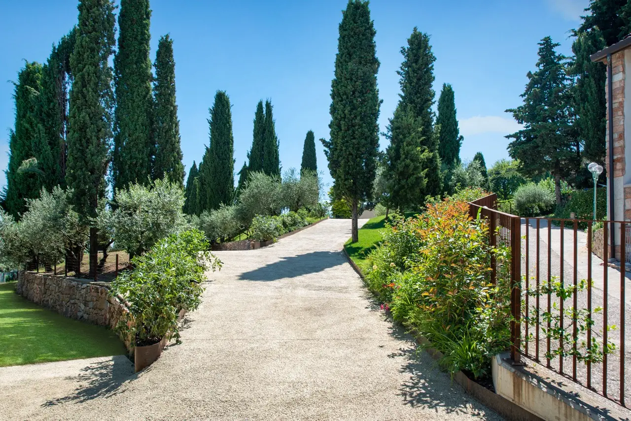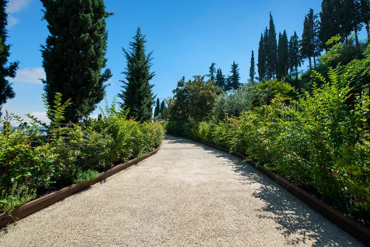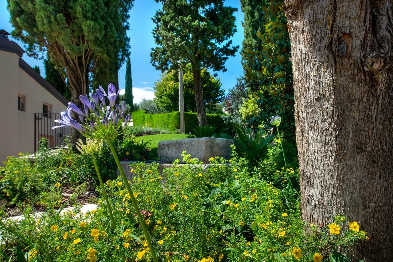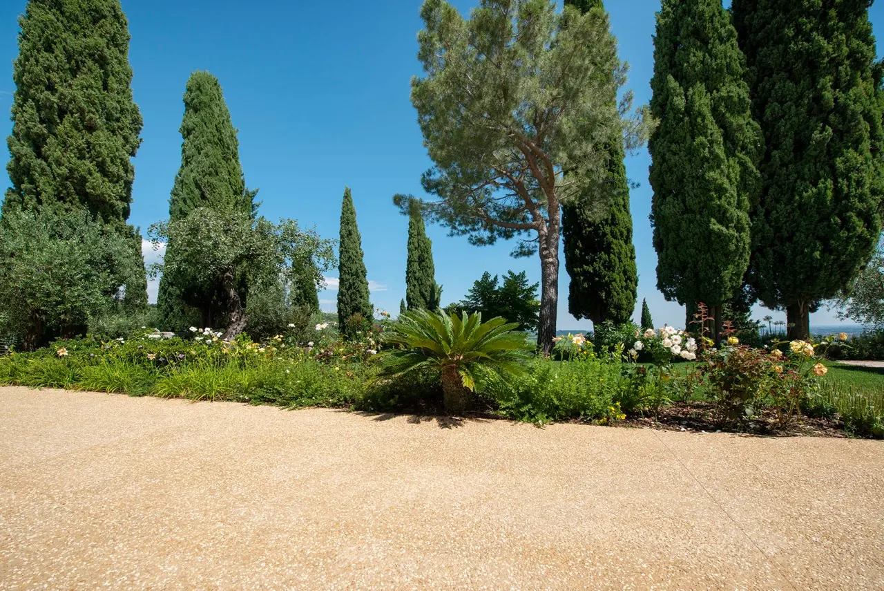 The garden, curated with meticulous attention to detail, is a true botanical paradise. Stone paths wind through centuries-old olive trees, blooming roses, fragrant lavender, and soaring cypresses, creating evocative and intimate corners where guests can stroll, meditate, or simply unwind.