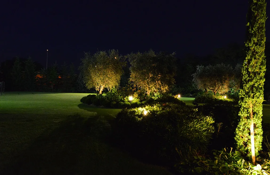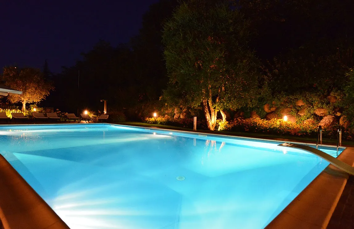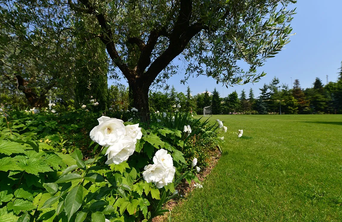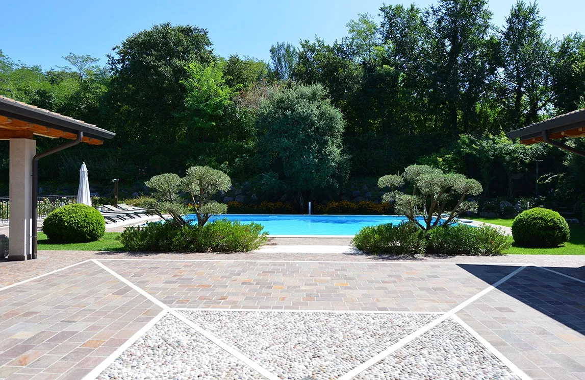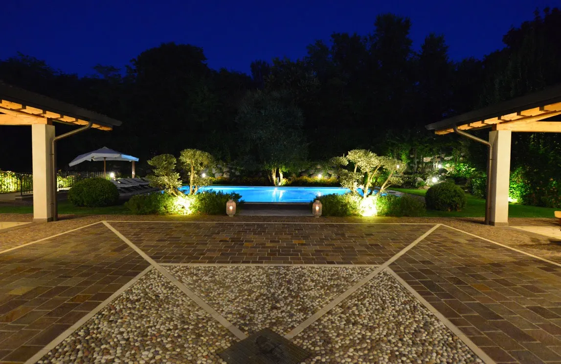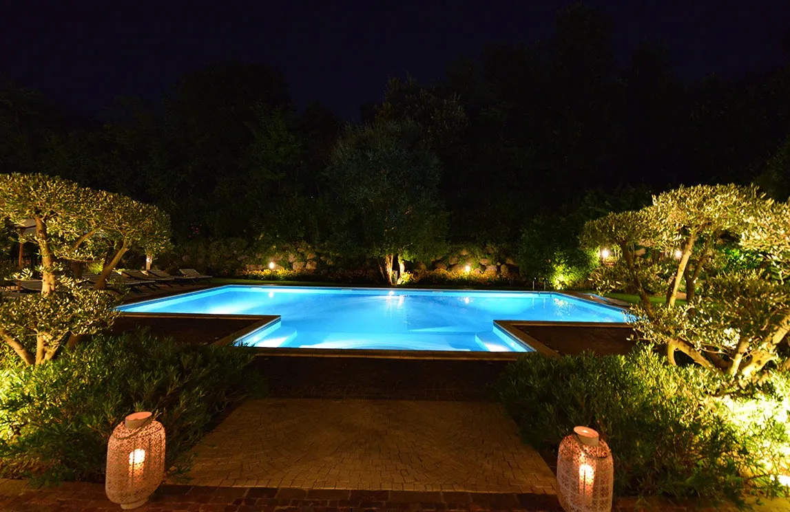 The project features a smart-home integrated Toro® irrigation system and a domotic-controlled lighting system, including “matchstick” spot lights and underwater pool lights. Pedestrian paths were paved in porphyry, while the salt-filtration pool area was finished in Botticino marble. Unique features include a Paving Green driveable lawn, a natural grass soccer pitch, and the stabilization of embankments using cyclopean boulders to create “green reefs.”