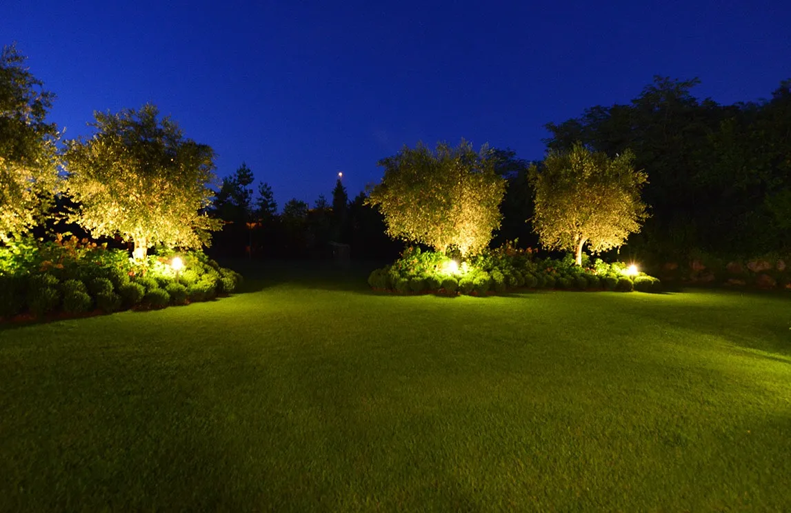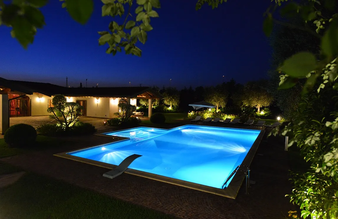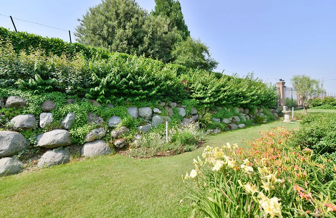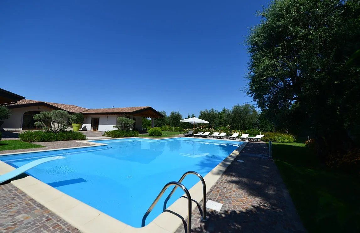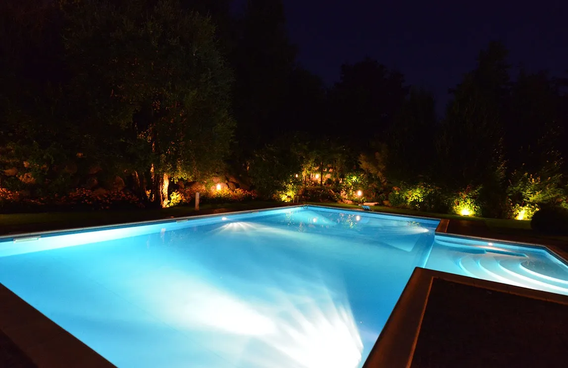 The project features a smart-home integrated Toro® irrigation system and a domotic-controlled lighting system, including “matchstick” spot lights and underwater pool lights. Pedestrian paths were paved in porphyry, while the salt-filtration pool area was finished in Botticino marble. Unique features include a Paving Green driveable lawn, a natural grass soccer pitch, and the stabilization of embankments using cyclopean boulders to create “green reefs.”