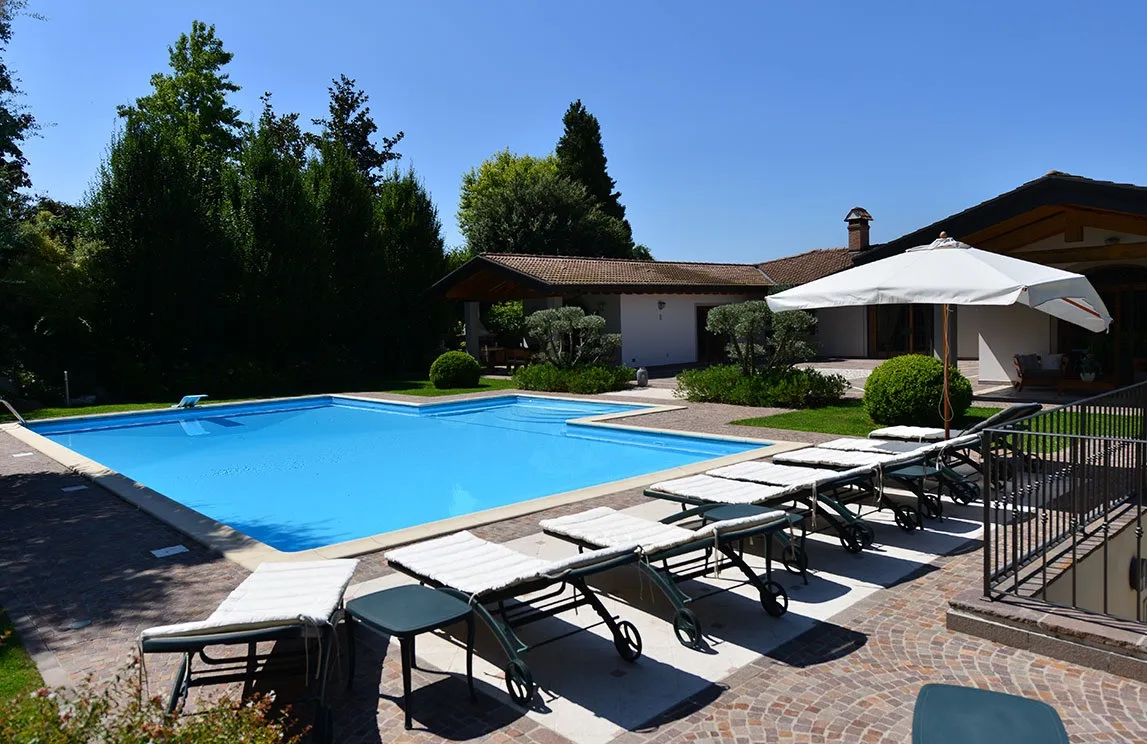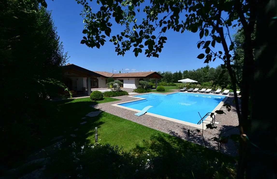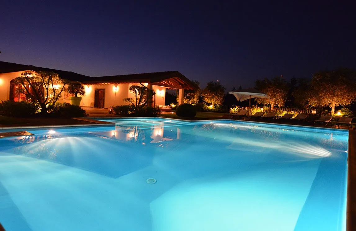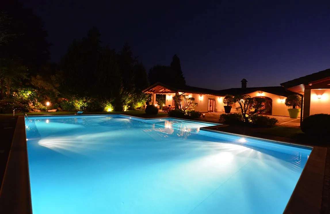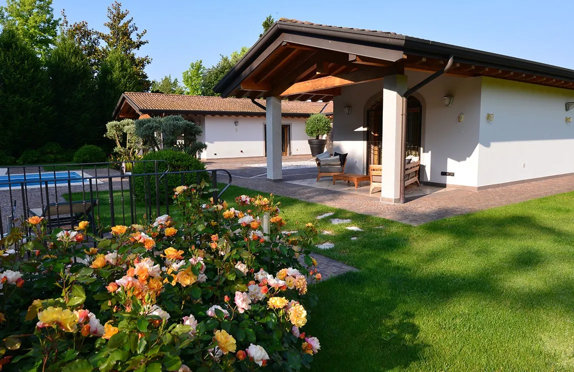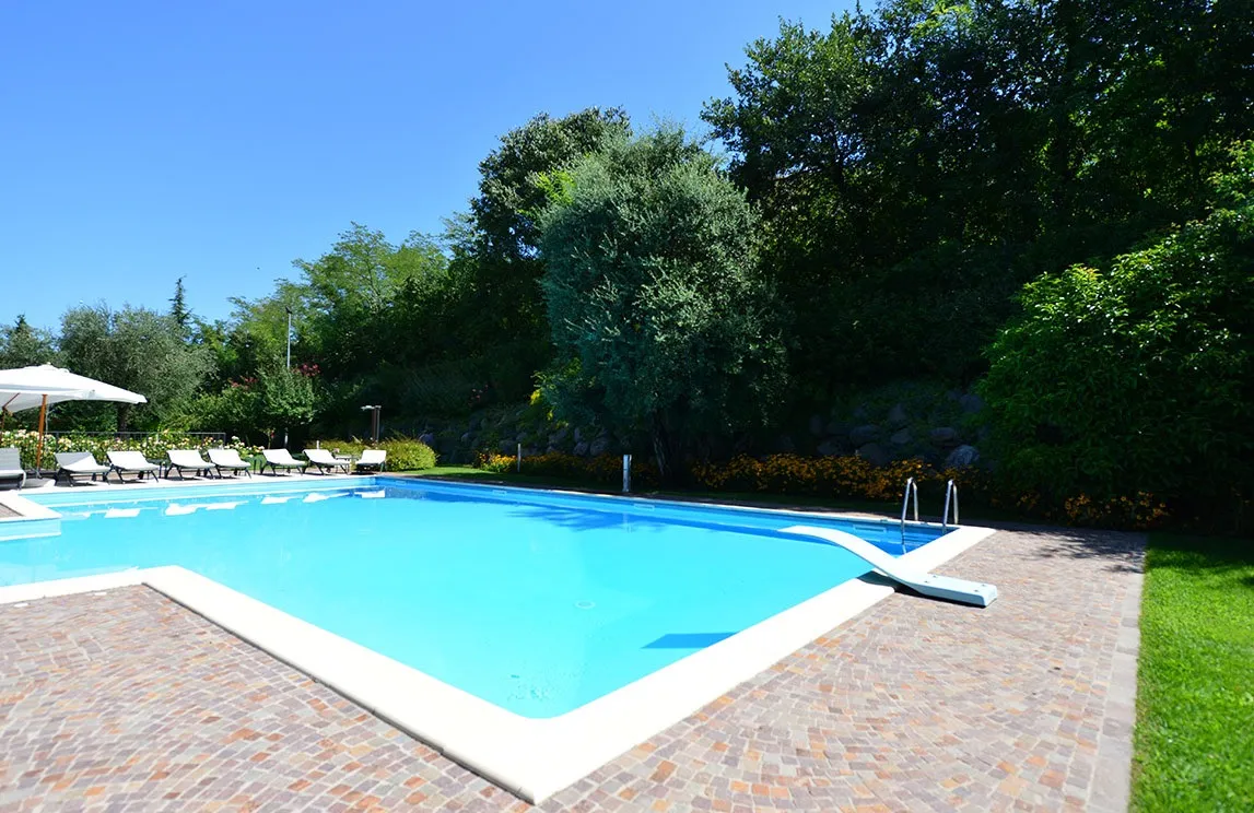 The project features a smart-home integrated Toro® irrigation system and a domotic-controlled lighting system, including “matchstick” spot lights and underwater pool lights. Pedestrian paths were paved in porphyry, while the salt-filtration pool area was finished in Botticino marble. Unique features include a Paving Green driveable lawn, a natural grass soccer pitch, and the stabilization of embankments using cyclopean boulders to create “green reefs.”