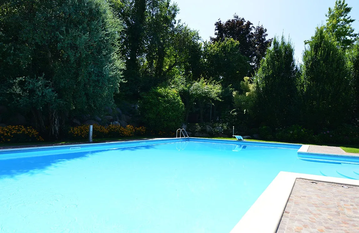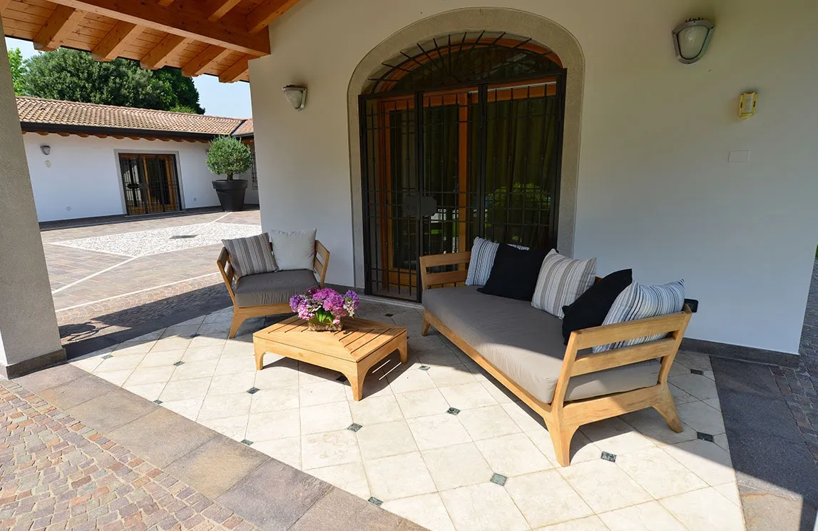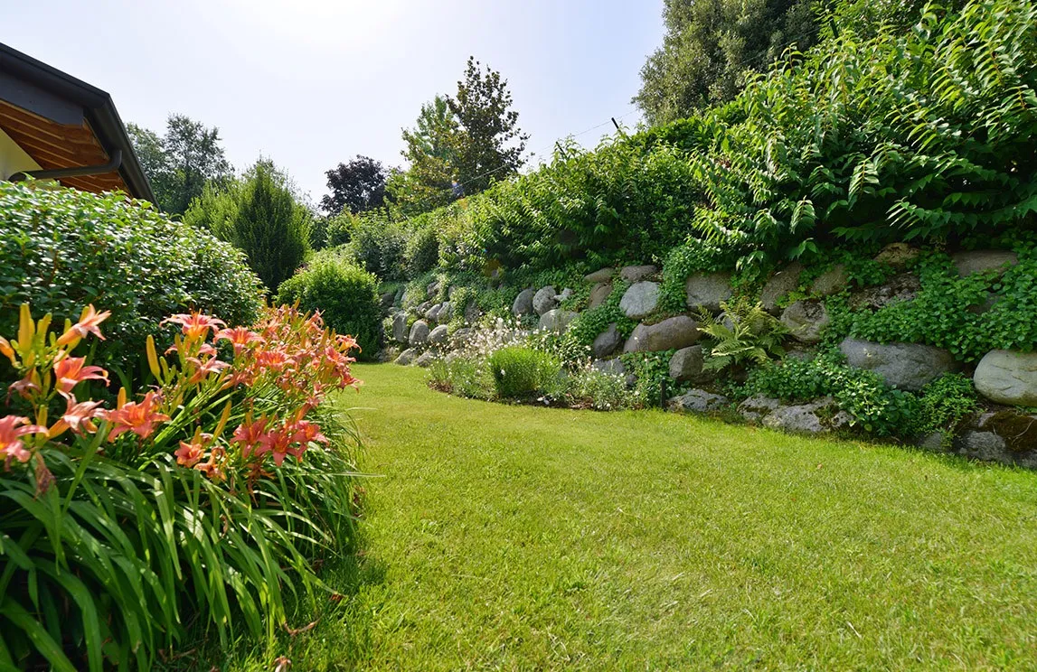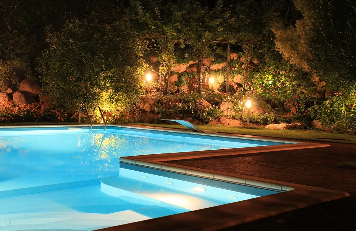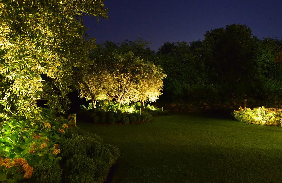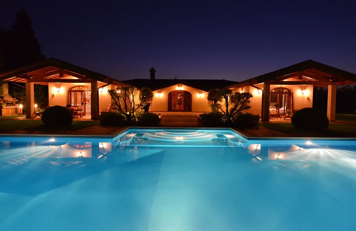 The project features a smart-home integrated Toro® irrigation system and a domotic-controlled lighting system, including “matchstick” spot lights and underwater pool lights. Pedestrian paths were paved in porphyry, while the salt-filtration pool area was finished in Botticino marble. Unique features include a Paving Green driveable lawn, a natural grass soccer pitch, and the stabilization of embankments using cyclopean boulders to create “green reefs.”