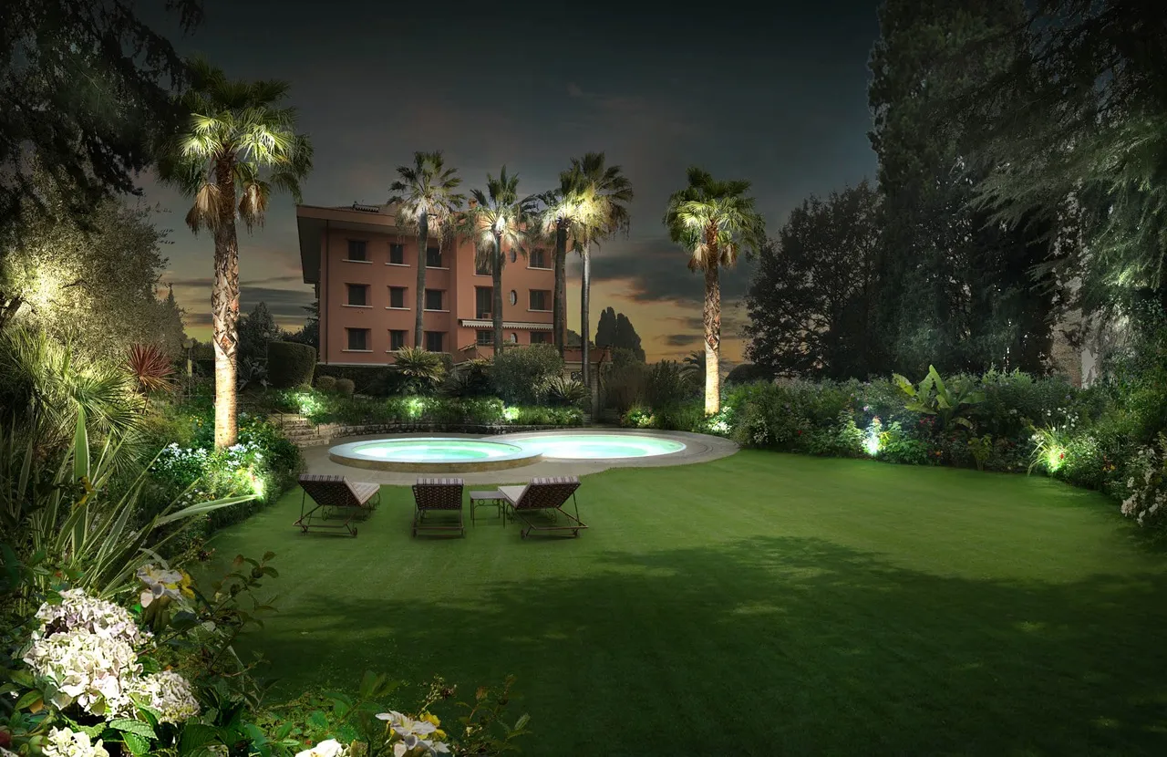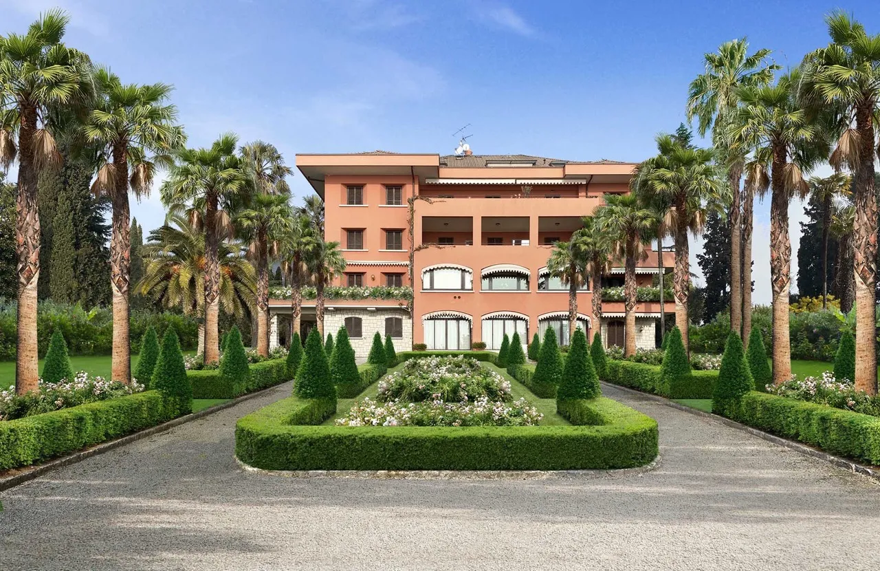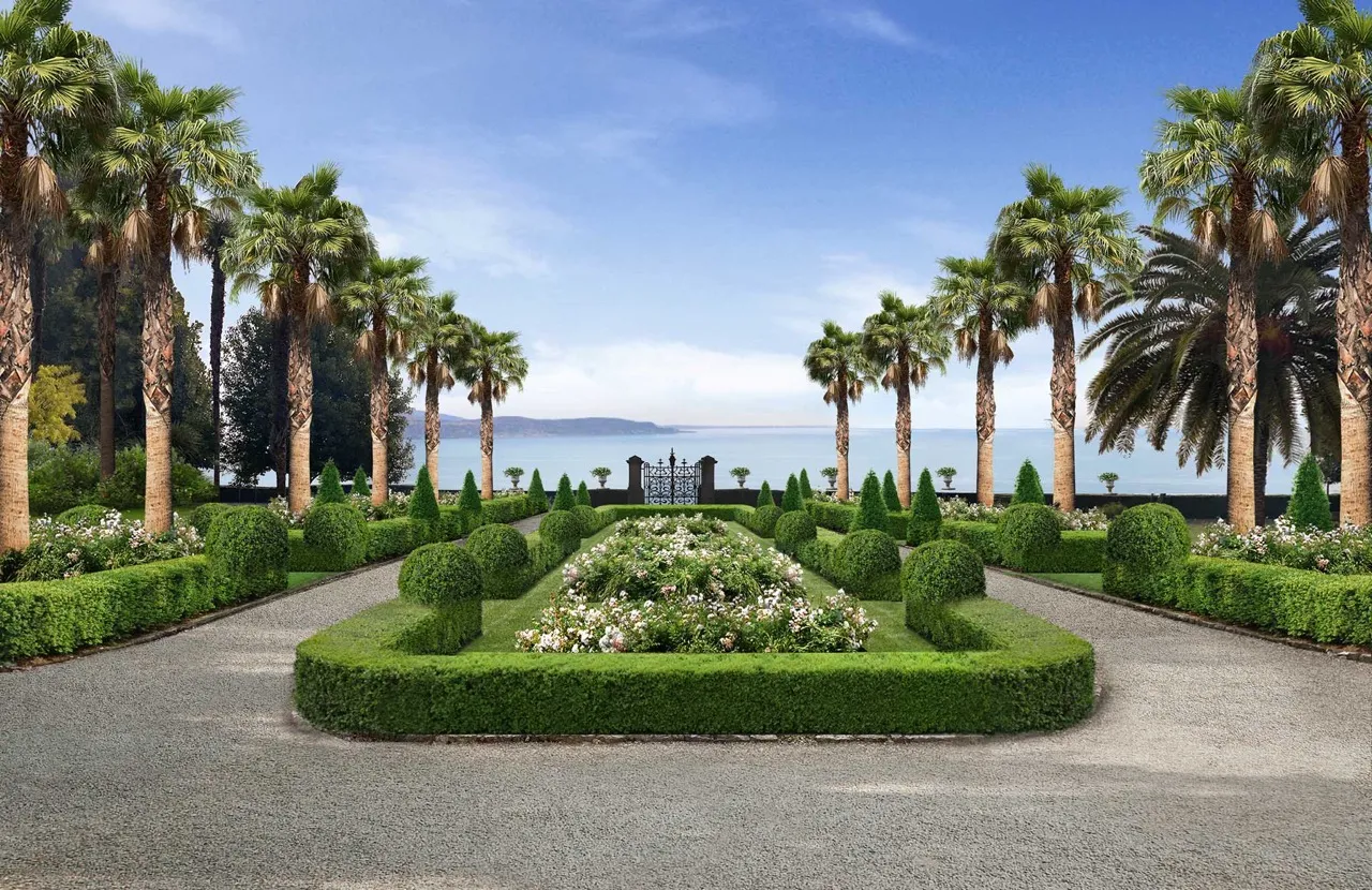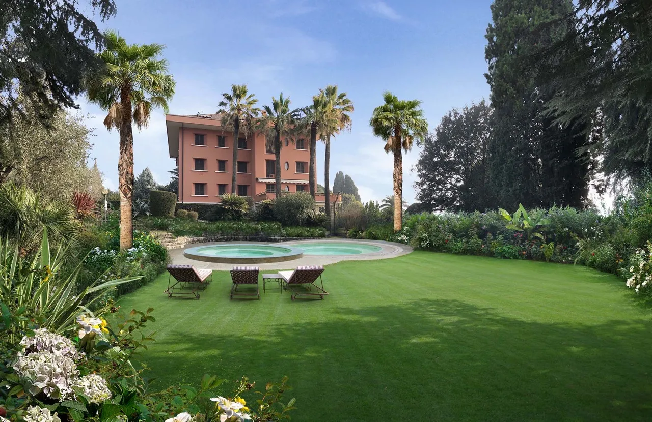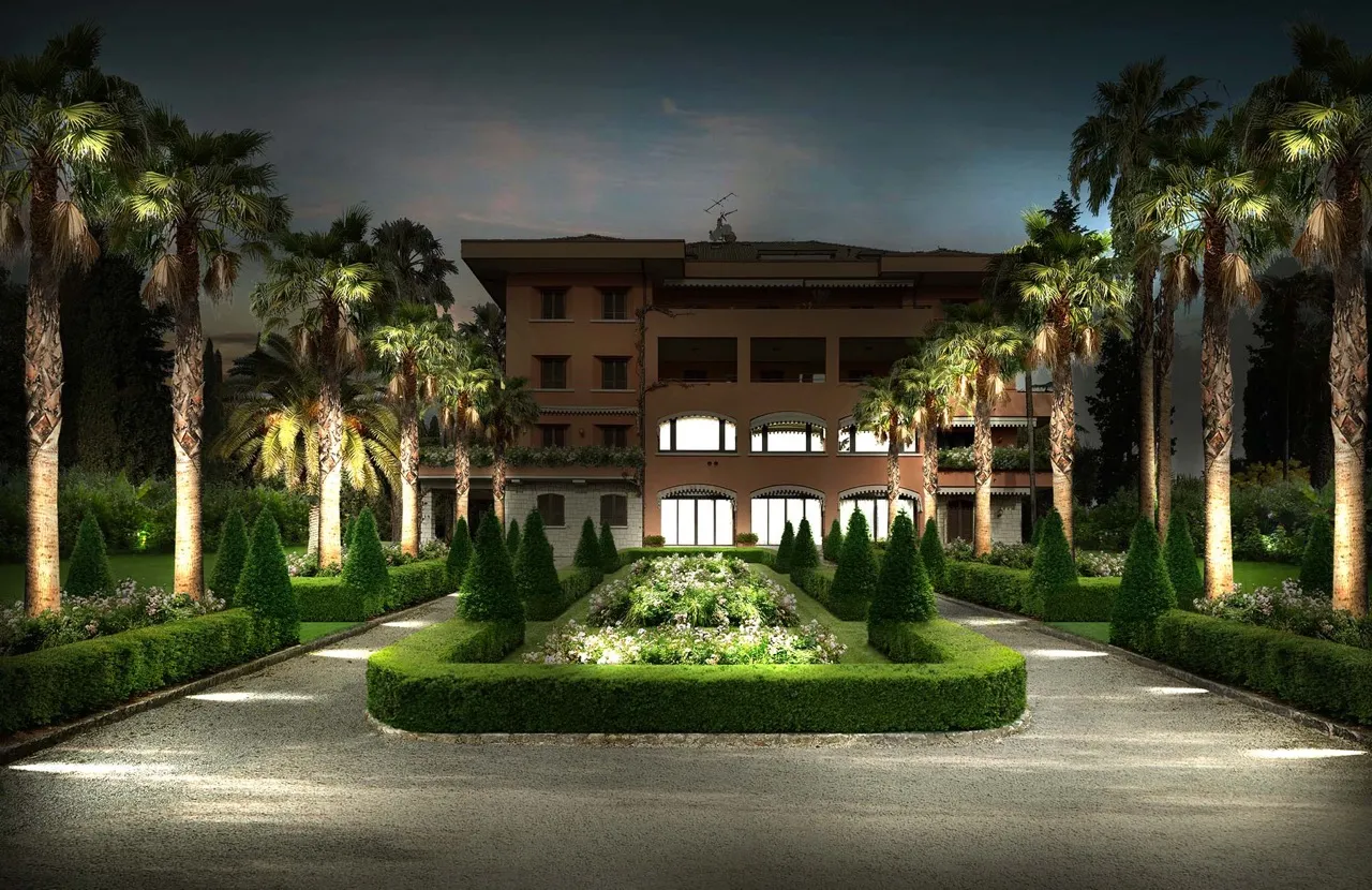 The importance of landscape design in the redevelopment and renovation of a historic residential complex on Lake Garda. An elegant Italianate garden featuring specimen palm trees that frame this magnificent setting.