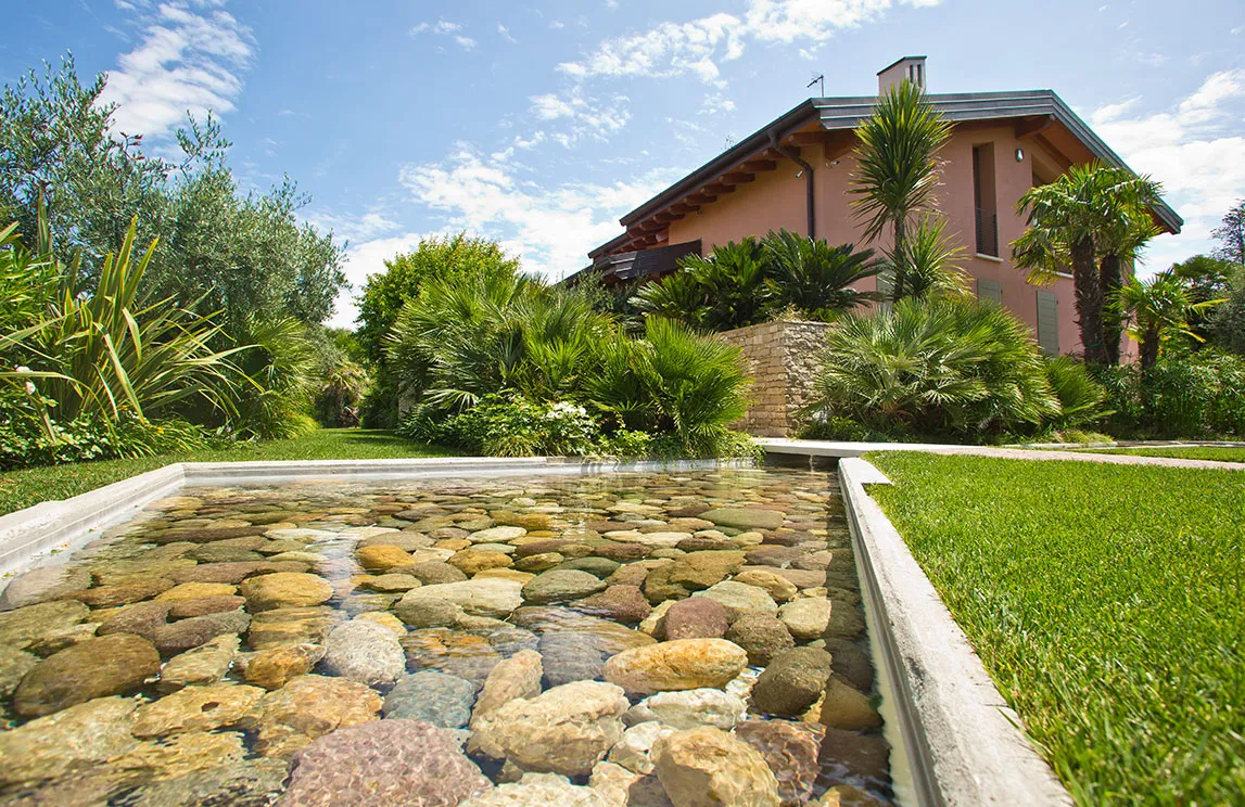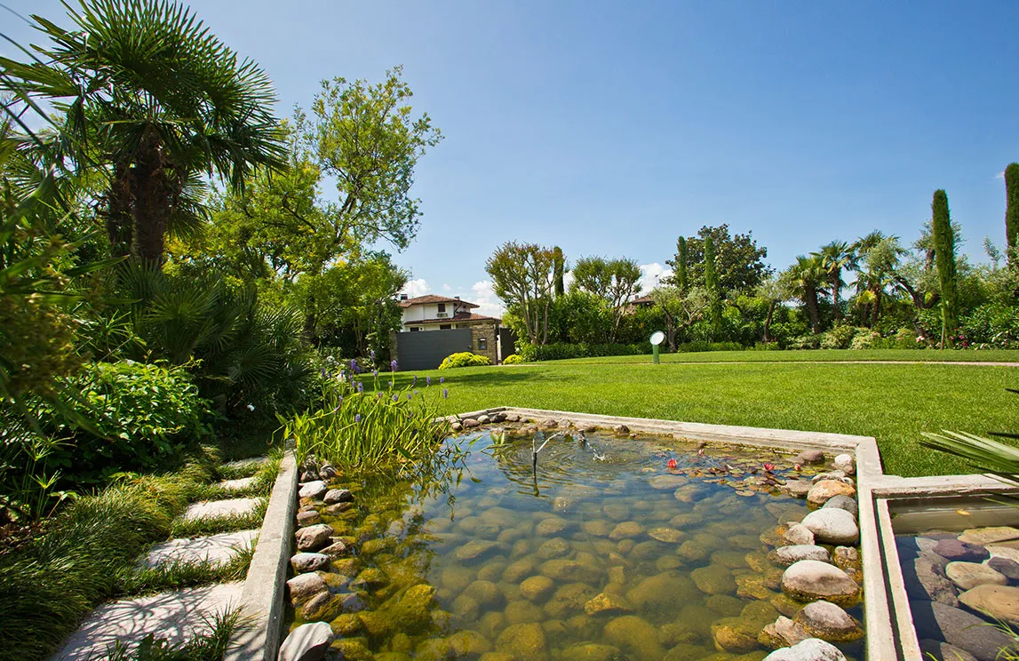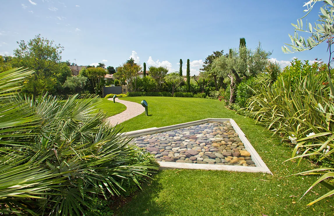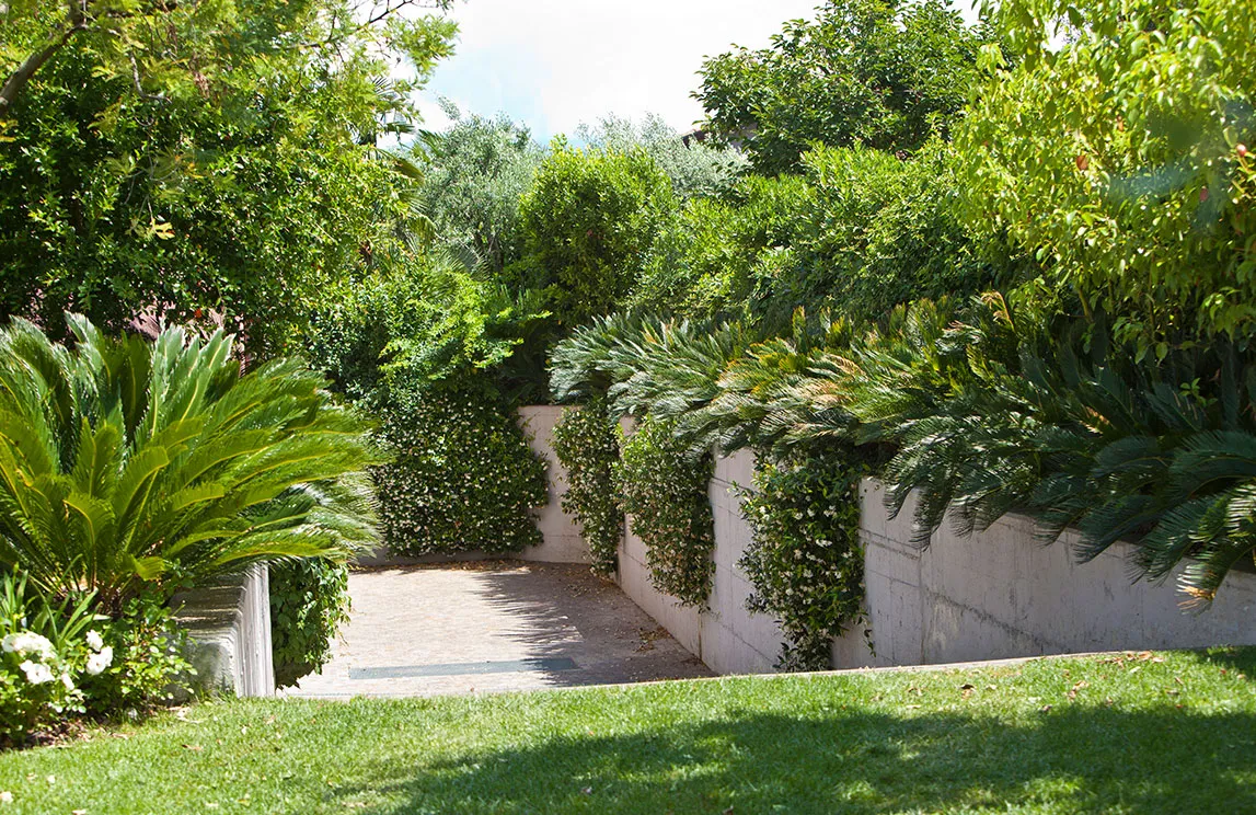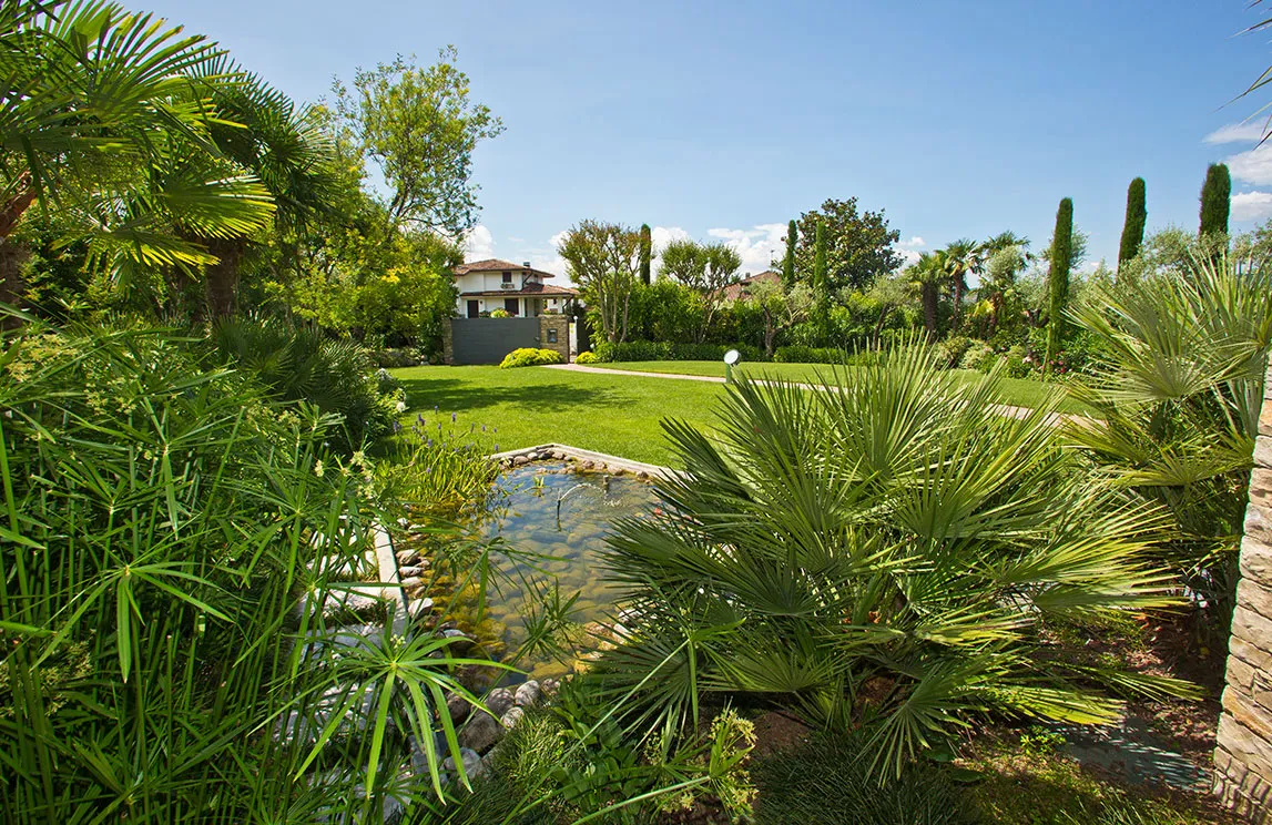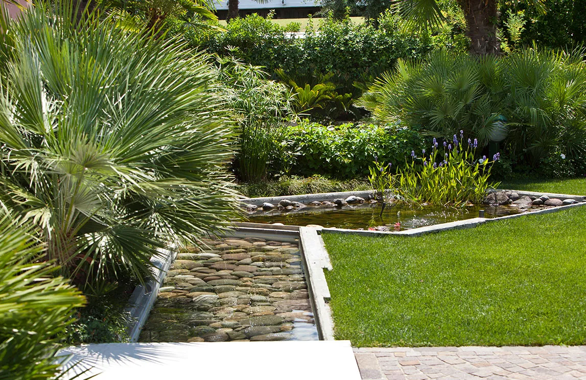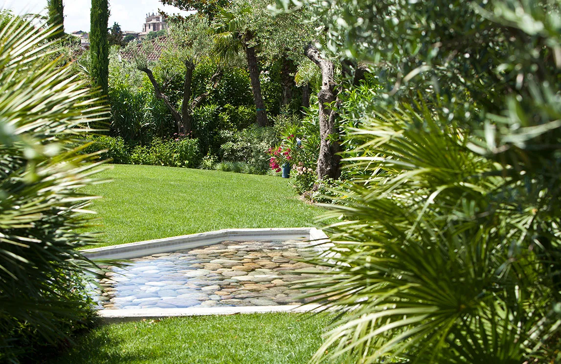 Italy is rich in private residences used as summer retreats. For one of these homes, Spazio Verde designed and realized a magnificent garden, planting centuries-old olive trees, seven different varieties of palms, endemic species, Mediterranean blooms, and aquatic plants.