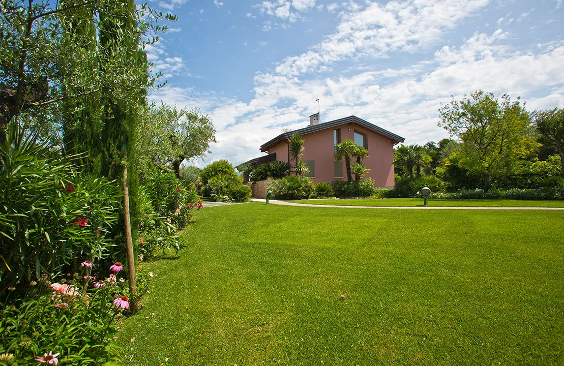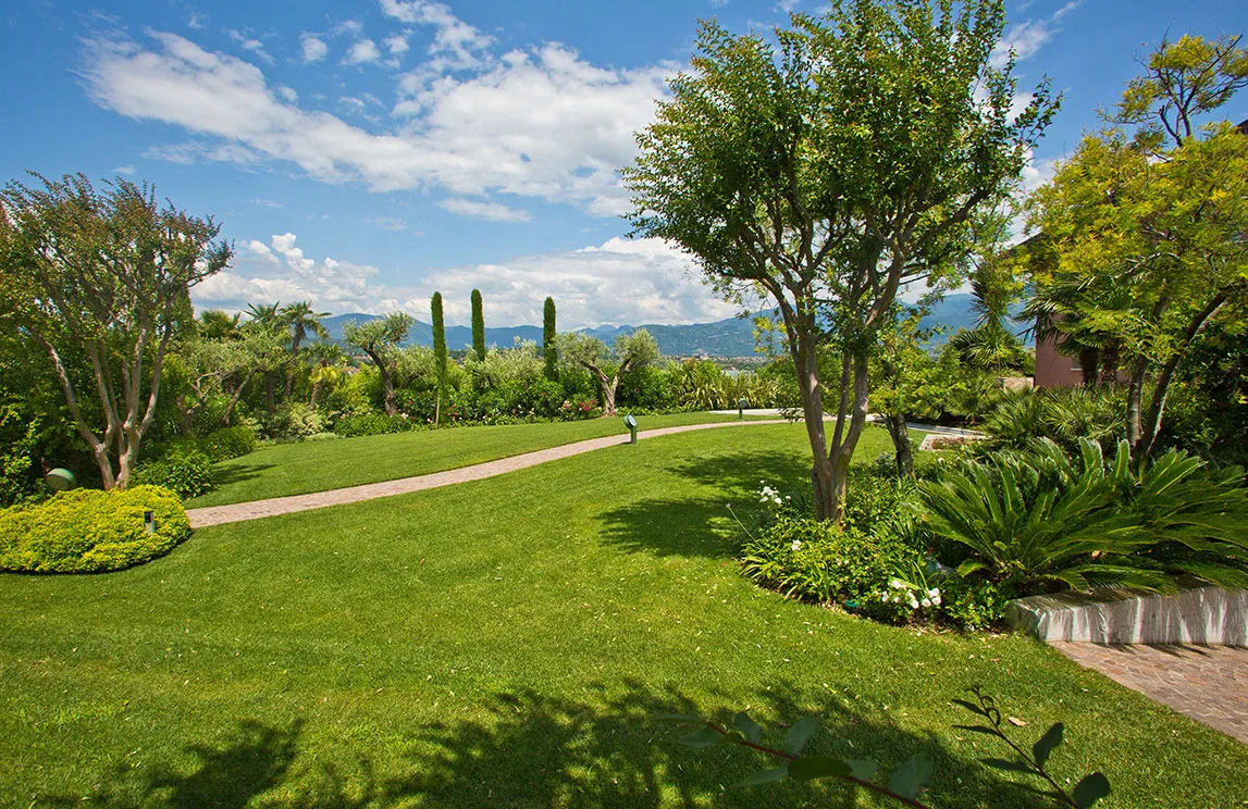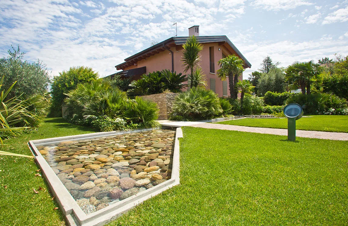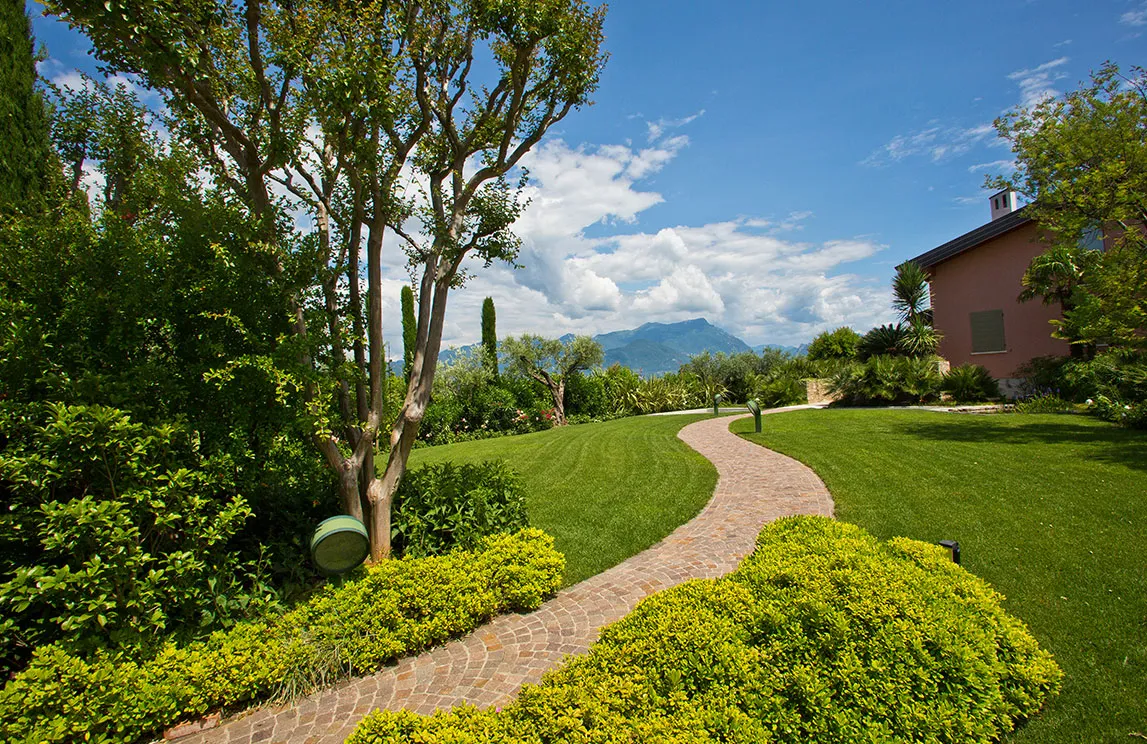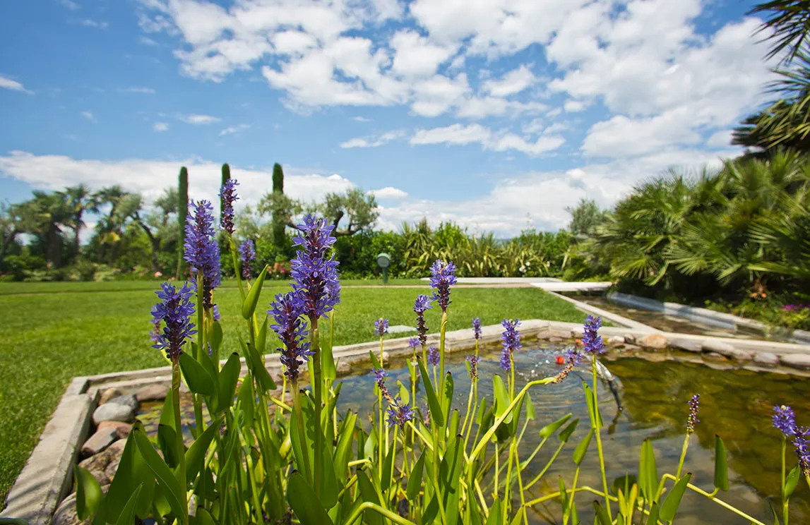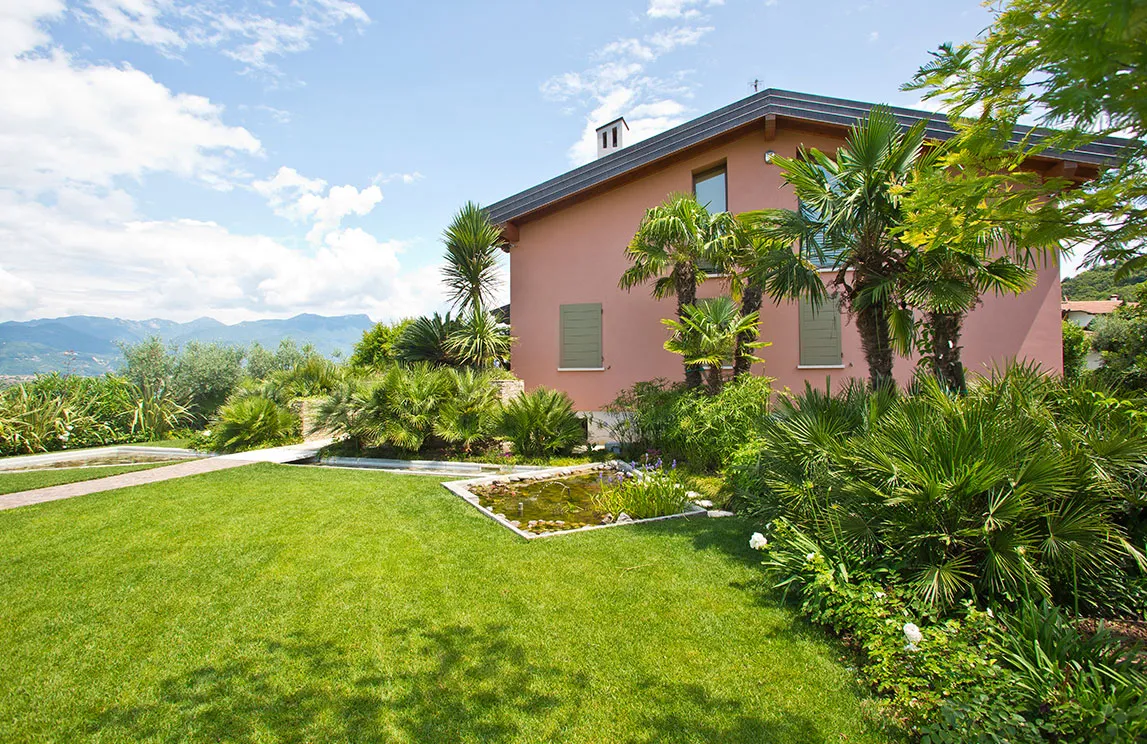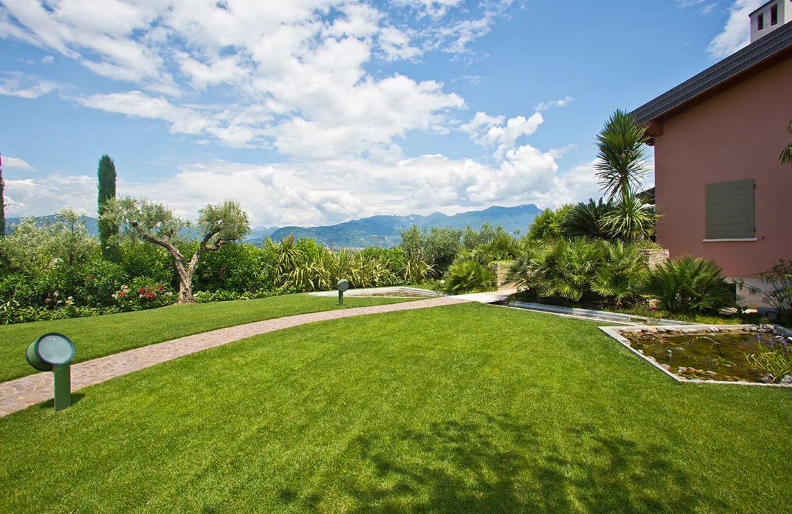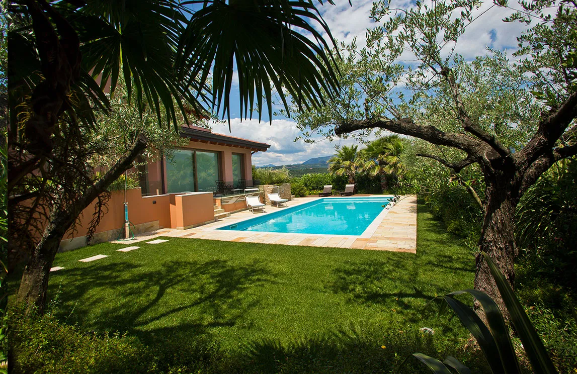 Italy is rich in private residences used as summer retreats. For one of these homes, Spazio Verde designed and realized a magnificent garden, planting centuries-old olive trees, seven different varieties of palms, endemic species, Mediterranean blooms, and aquatic plants.
