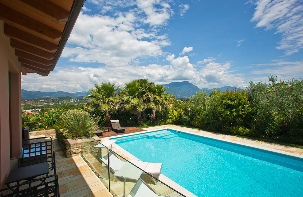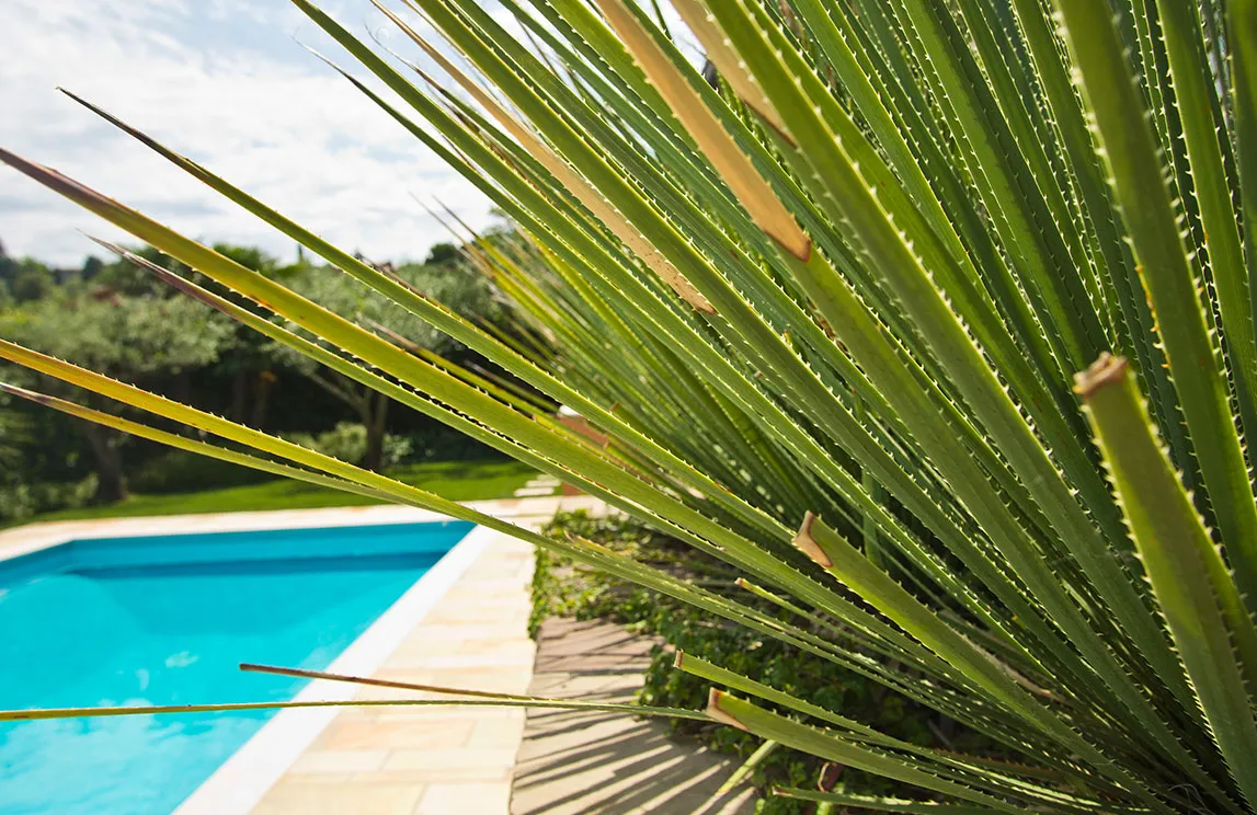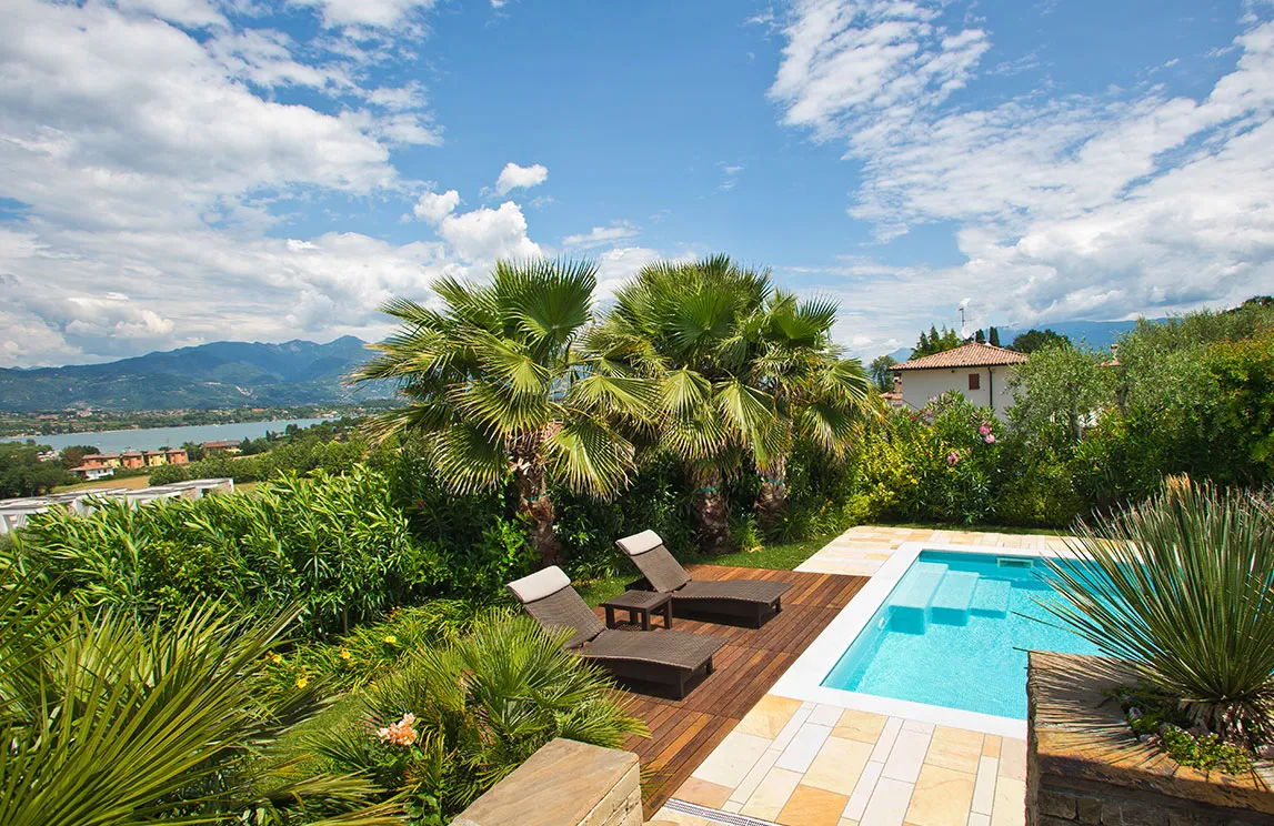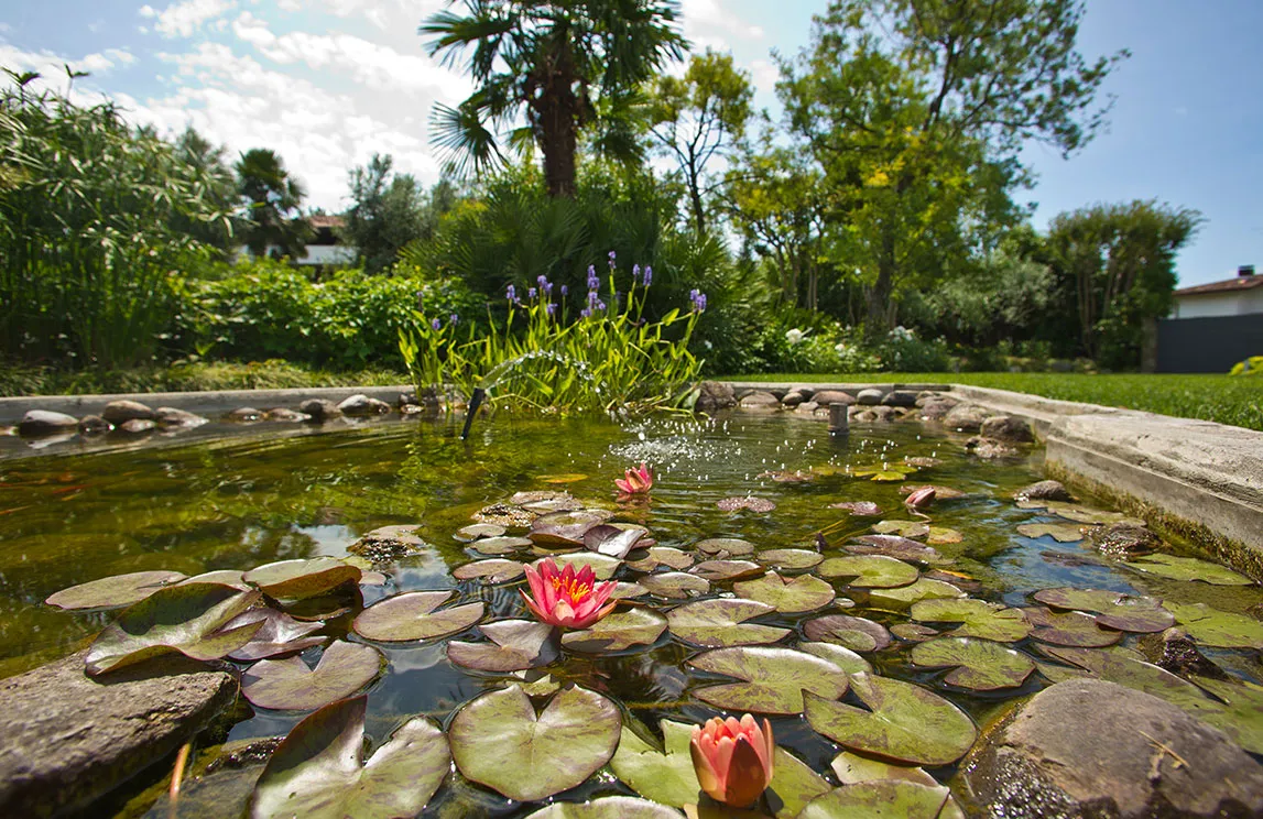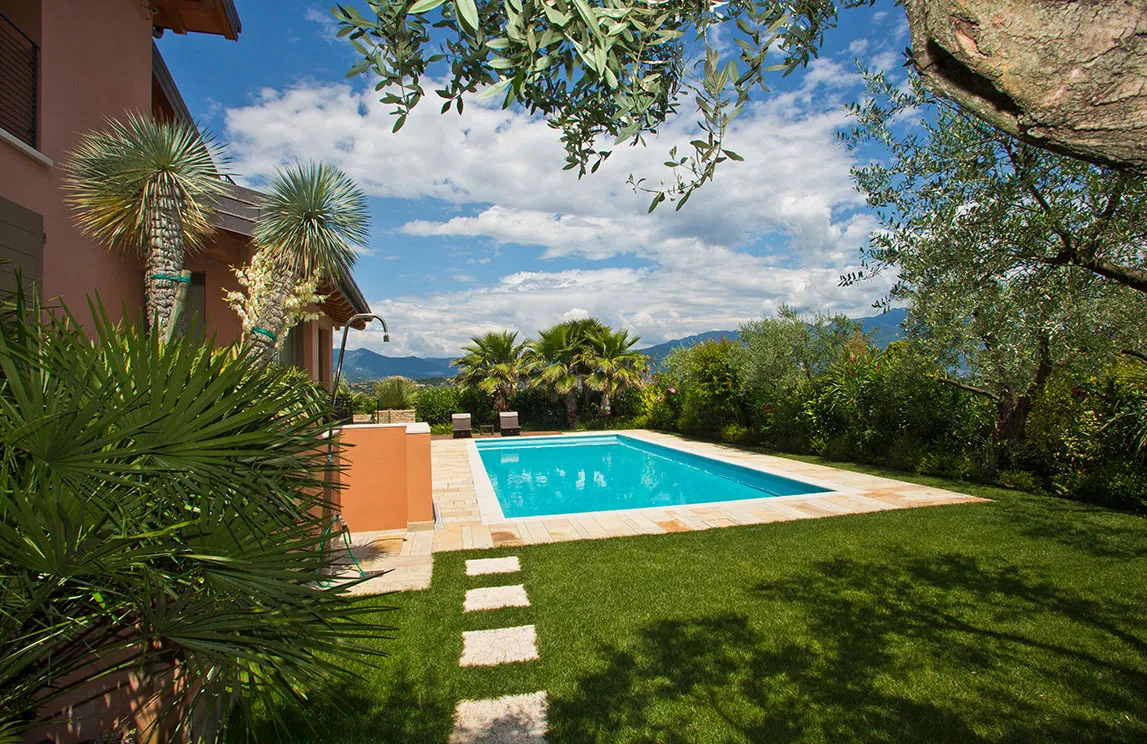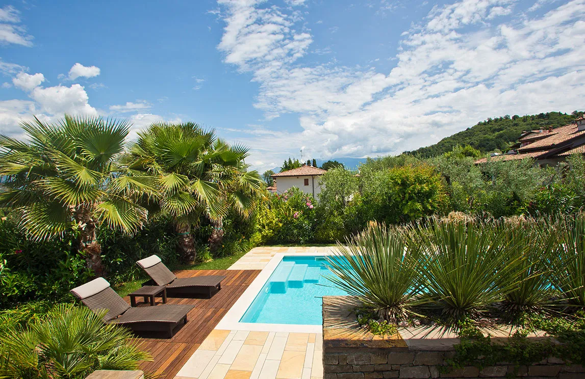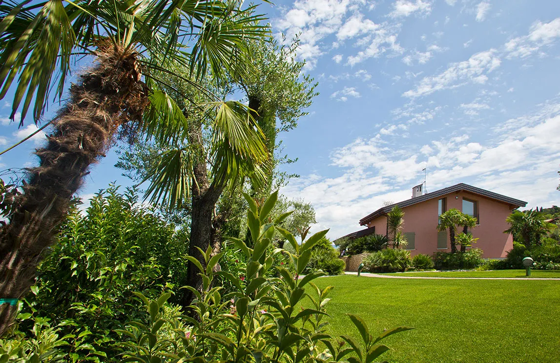 Italy is rich in private residences used as summer retreats. For one of these homes, Spazio Verde designed and realized a magnificent garden, planting centuries-old olive trees, seven different varieties of palms, endemic species, Mediterranean blooms, and aquatic plants.