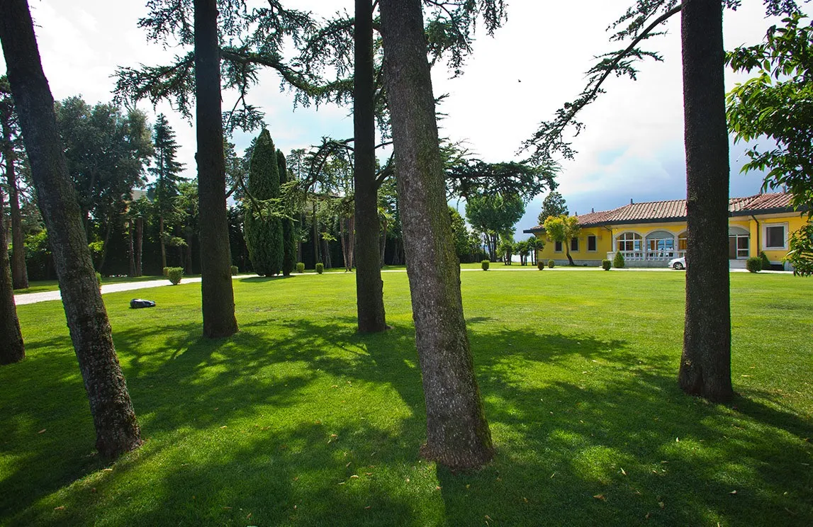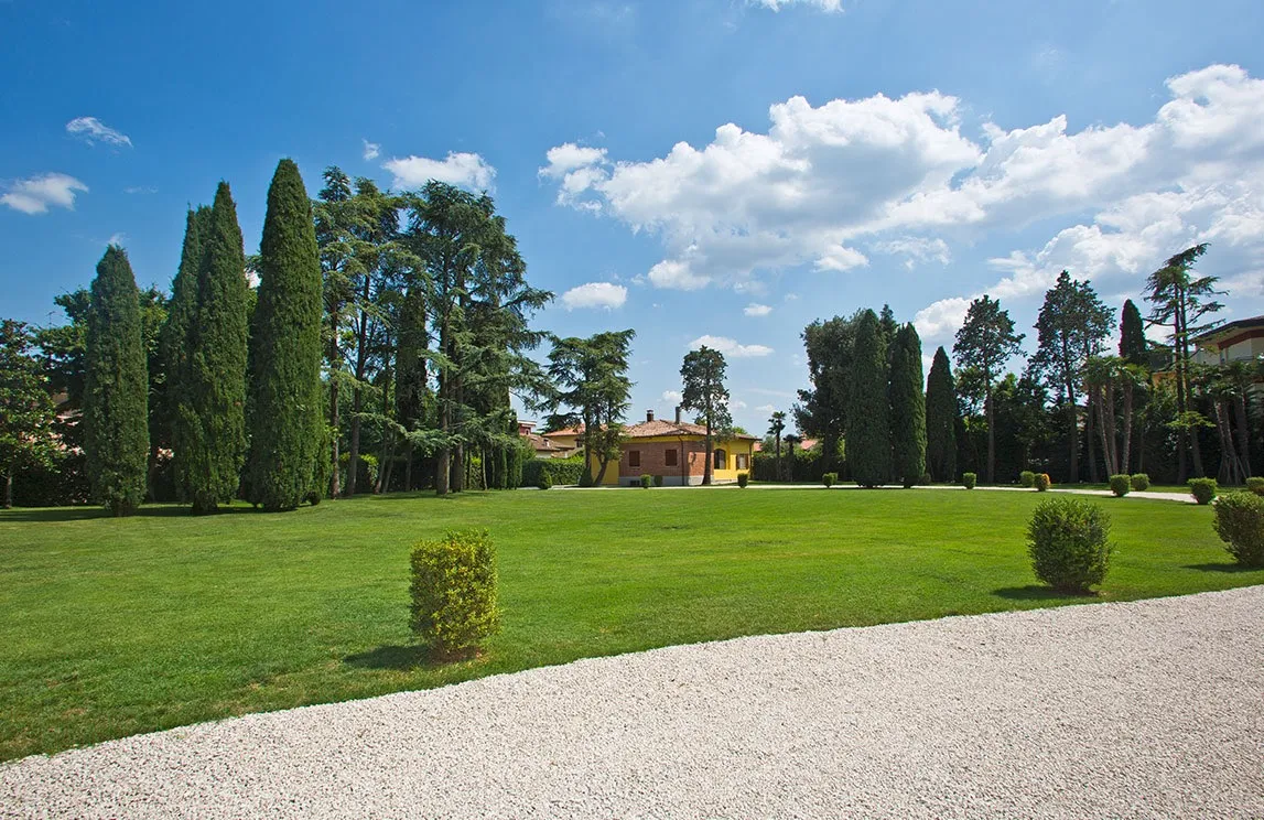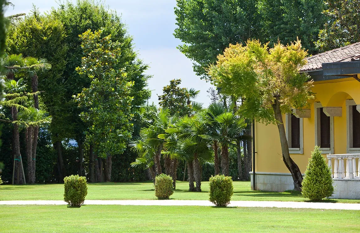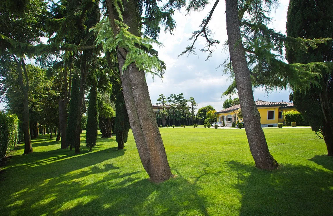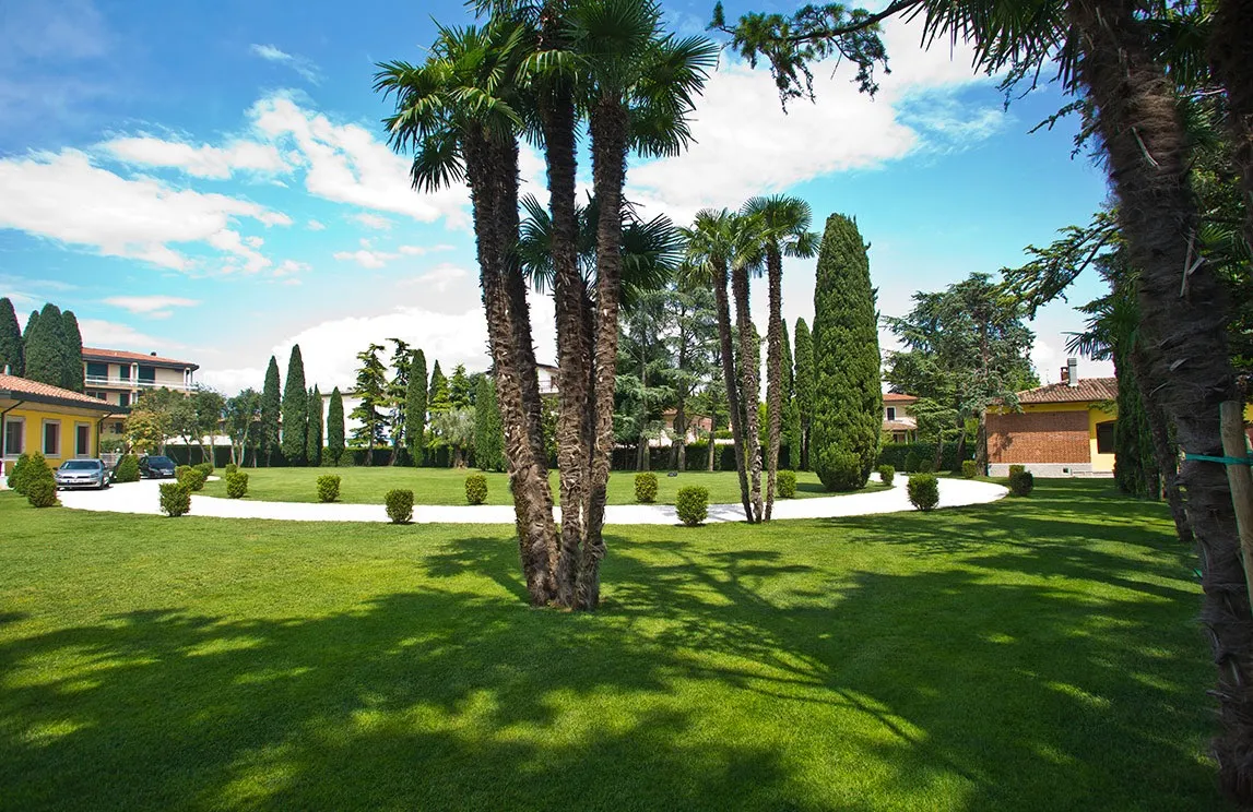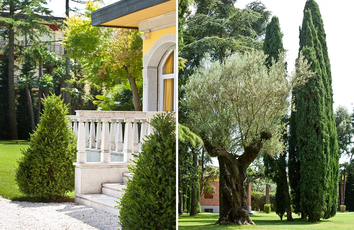 In this setting, Spazio Verde created a villa garden by planting quintessential local species: topiary Buxus for a formal style and cypresses. To add an exotic touch, we planted groups of Chamaerops Excelsa (Trachycarpus Fortunei) palms, known for their bright green fan-shaped leaves and yellow-cream blooms. We installed a high-performance irrigation system for maximum water savings and recessed LED spotlights for the dramatic lighting of centuries-old tall trees. Finally, a surface drainage system was implemented to improve permeability and reduce the waterlogging typical of lakeside terrains.