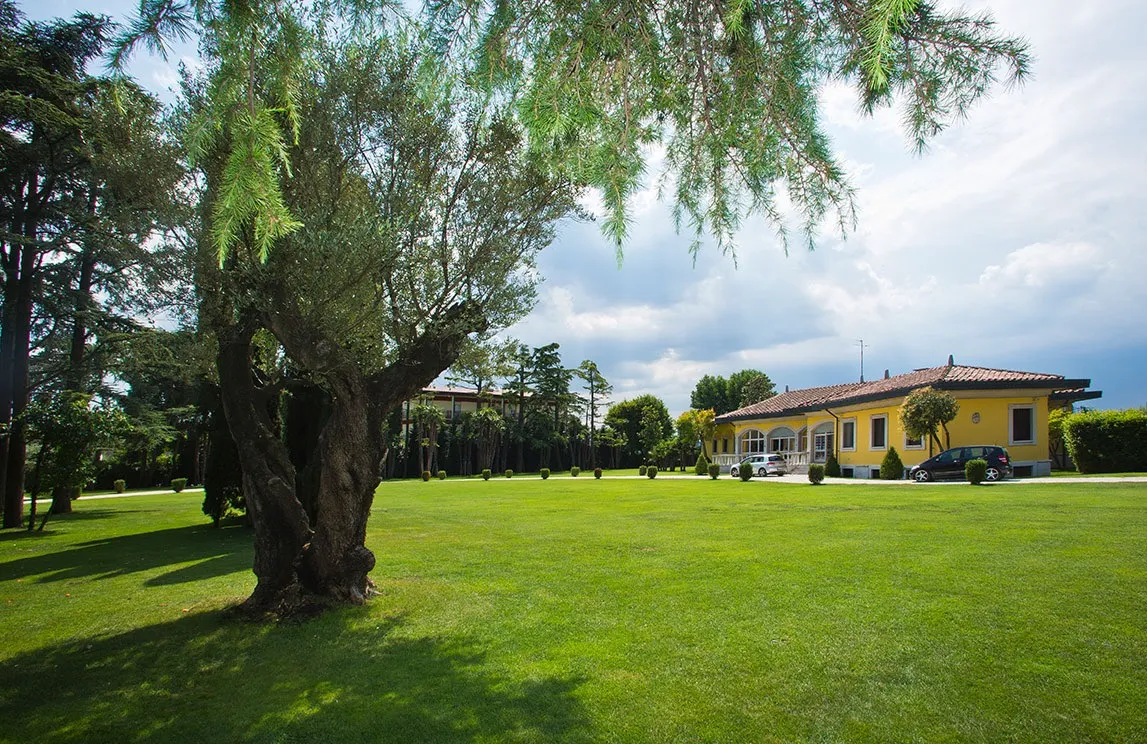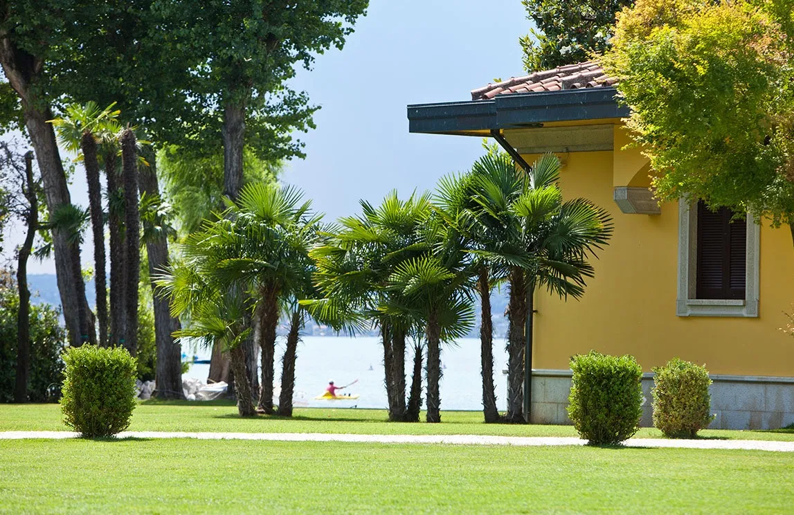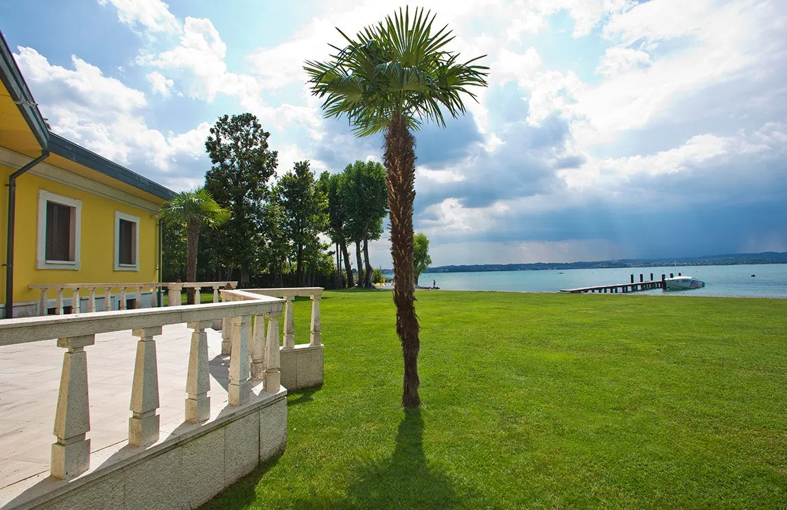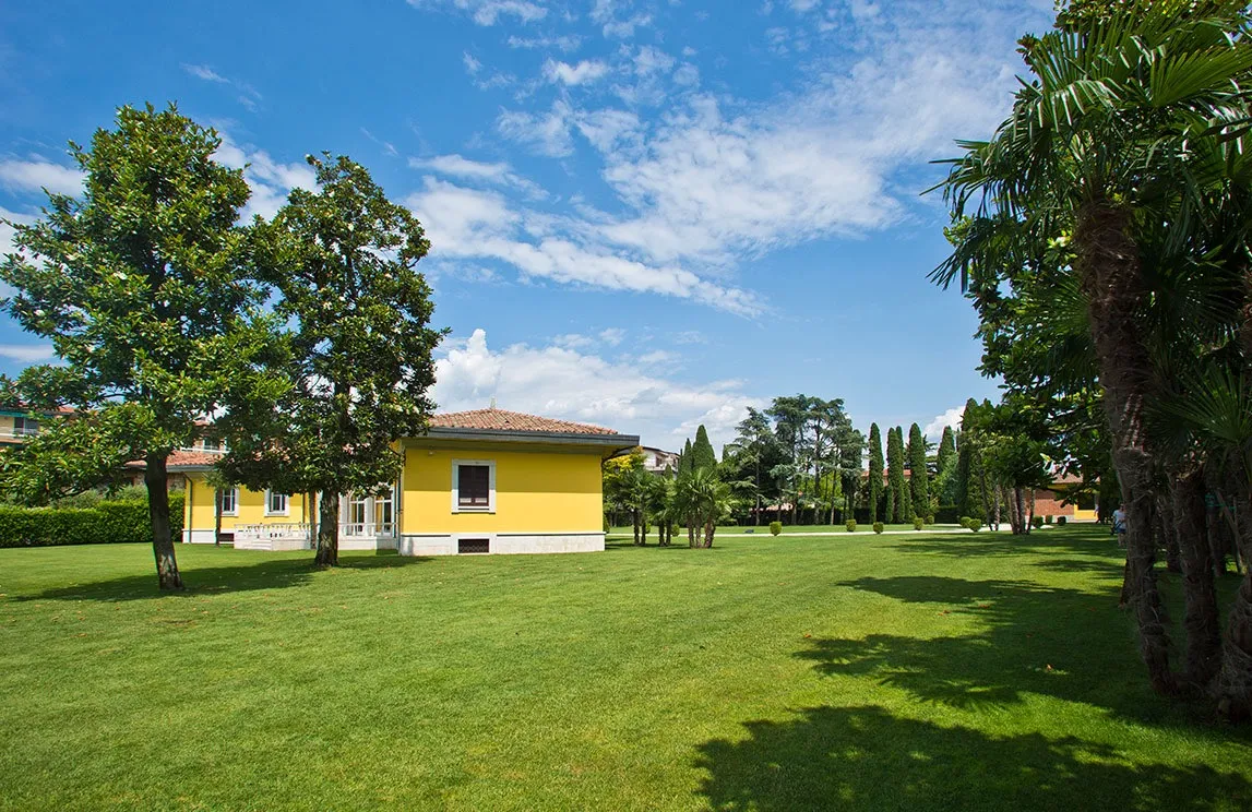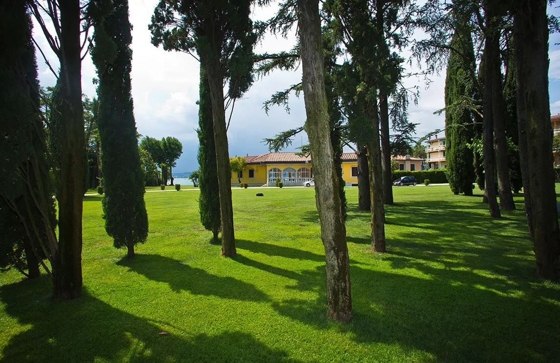 In this setting, Spazio Verde created a villa garden by planting quintessential local species: topiary Buxus for a formal style and cypresses. To add an exotic touch, we planted groups of Chamaerops Excelsa (Trachycarpus Fortunei) palms, known for their bright green fan-shaped leaves and yellow-cream blooms. We installed a high-performance irrigation system for maximum water savings and recessed LED spotlights for the dramatic lighting of centuries-old tall trees. Finally, a surface drainage system was implemented to improve permeability and reduce the waterlogging typical of lakeside terrains.