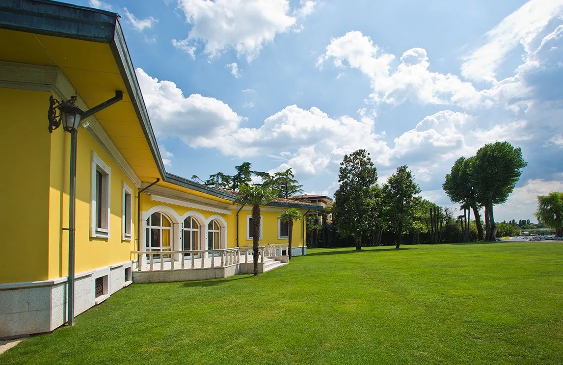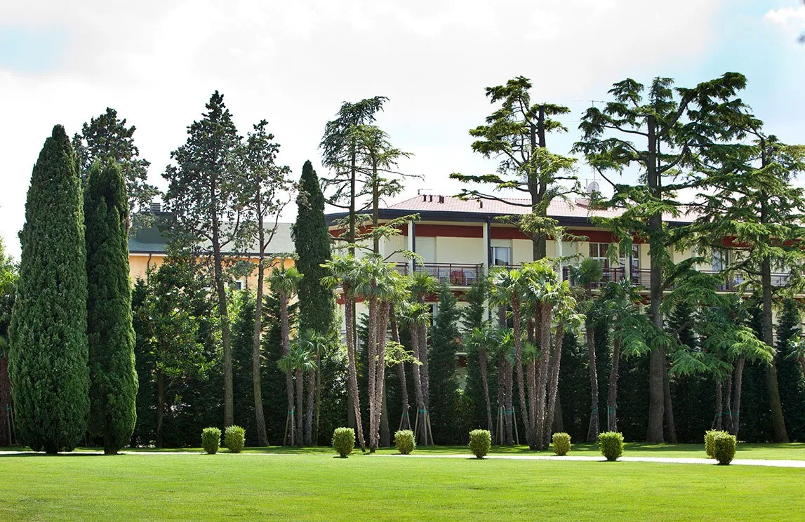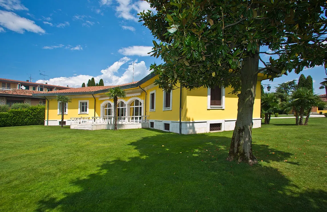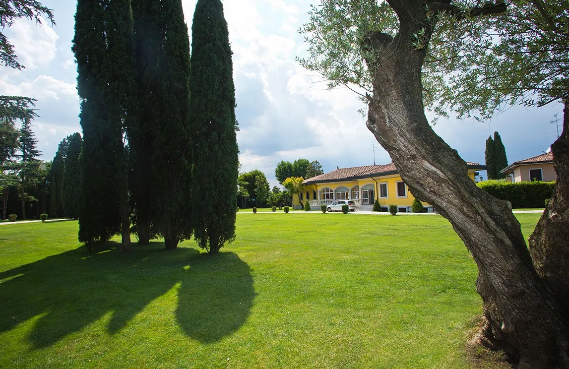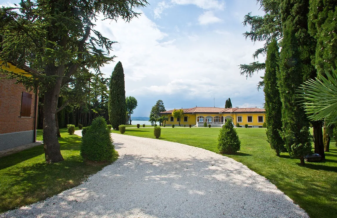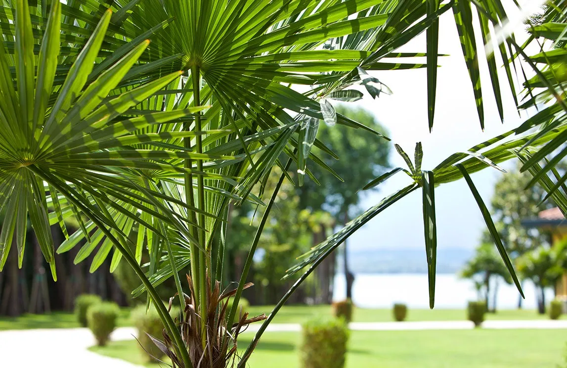 In this setting, Spazio Verde created a villa garden by planting quintessential local species: topiary Buxus for a formal style and cypresses. To add an exotic touch, we planted groups of Chamaerops Excelsa (Trachycarpus Fortunei) palms, known for their bright green fan-shaped leaves and yellow-cream blooms. We installed a high-performance irrigation system for maximum water savings and recessed LED spotlights for the dramatic lighting of centuries-old tall trees. Finally, a surface drainage system was implemented to improve permeability and reduce the waterlogging typical of lakeside terrains.