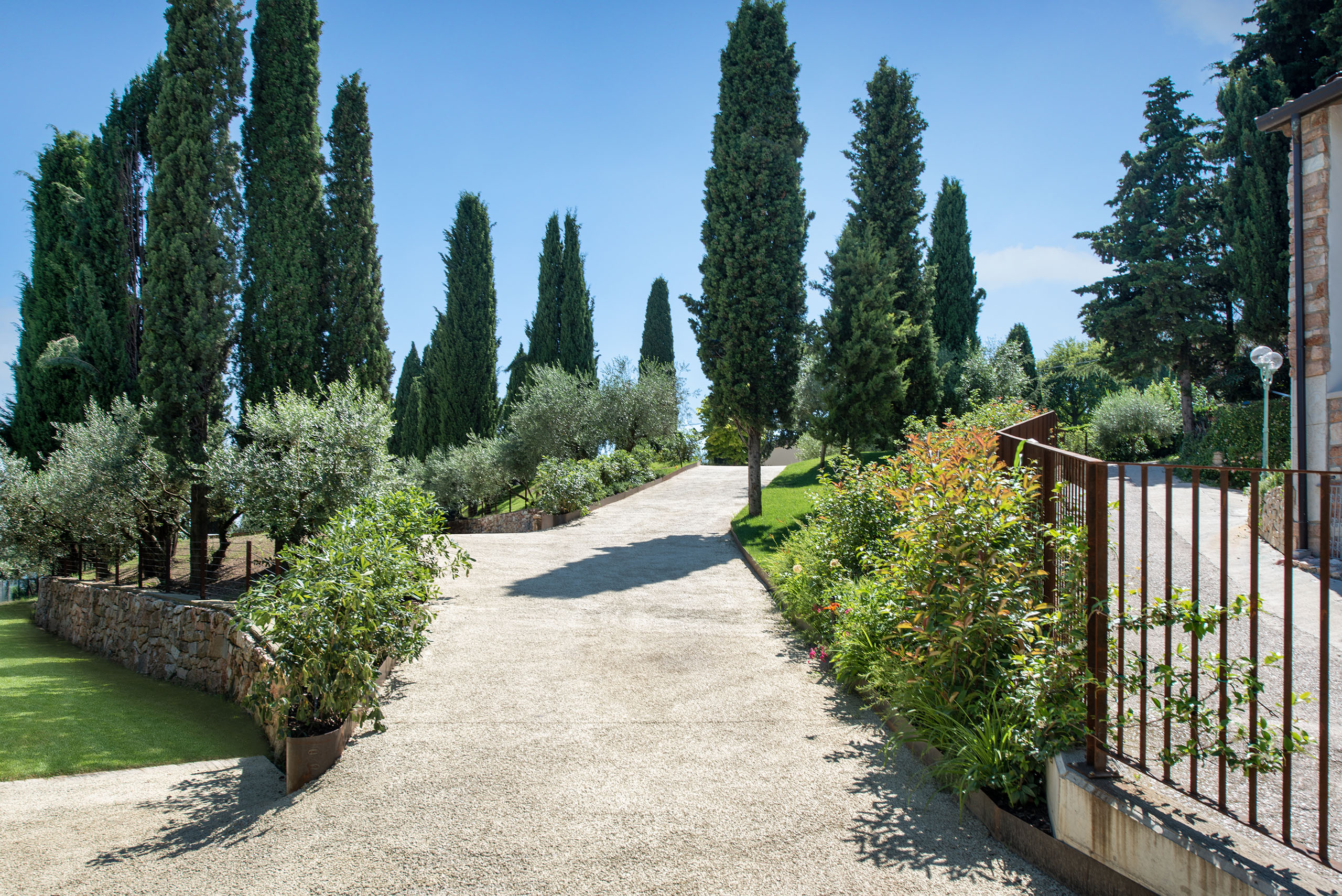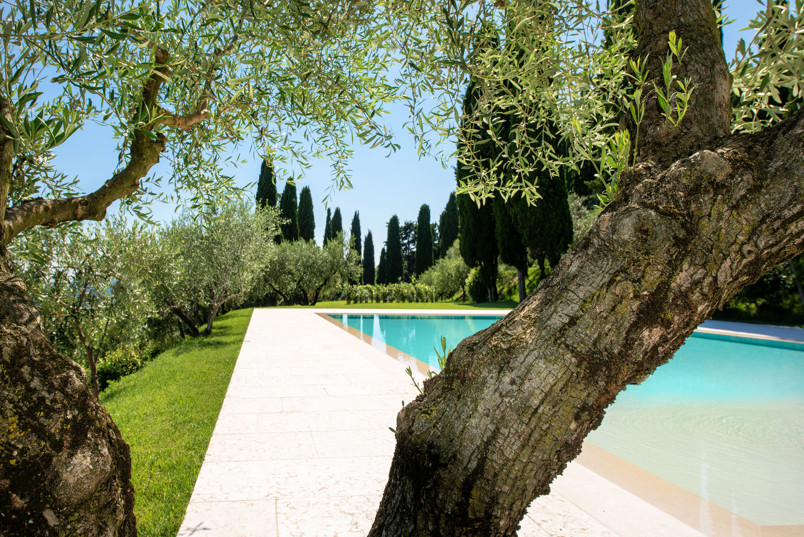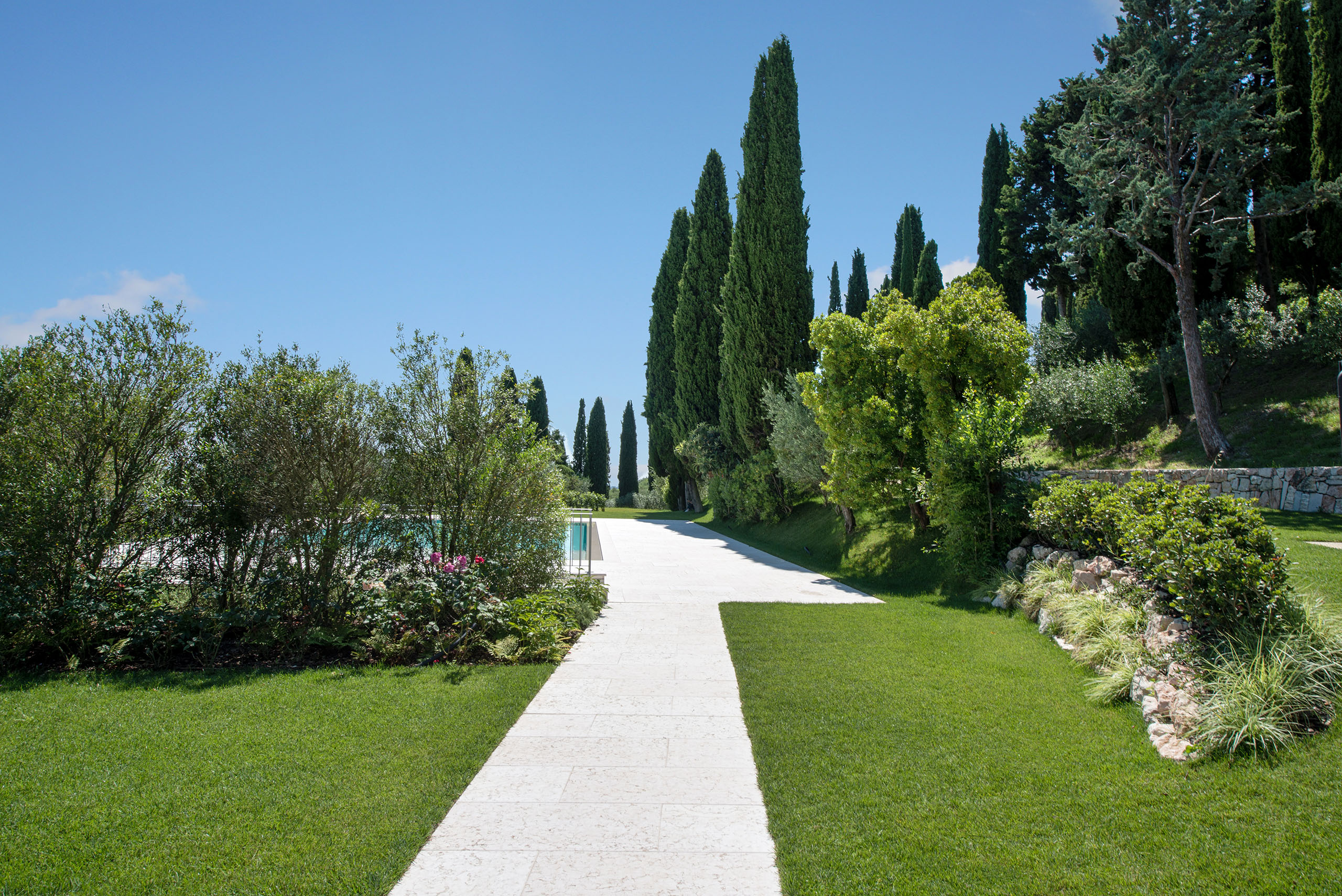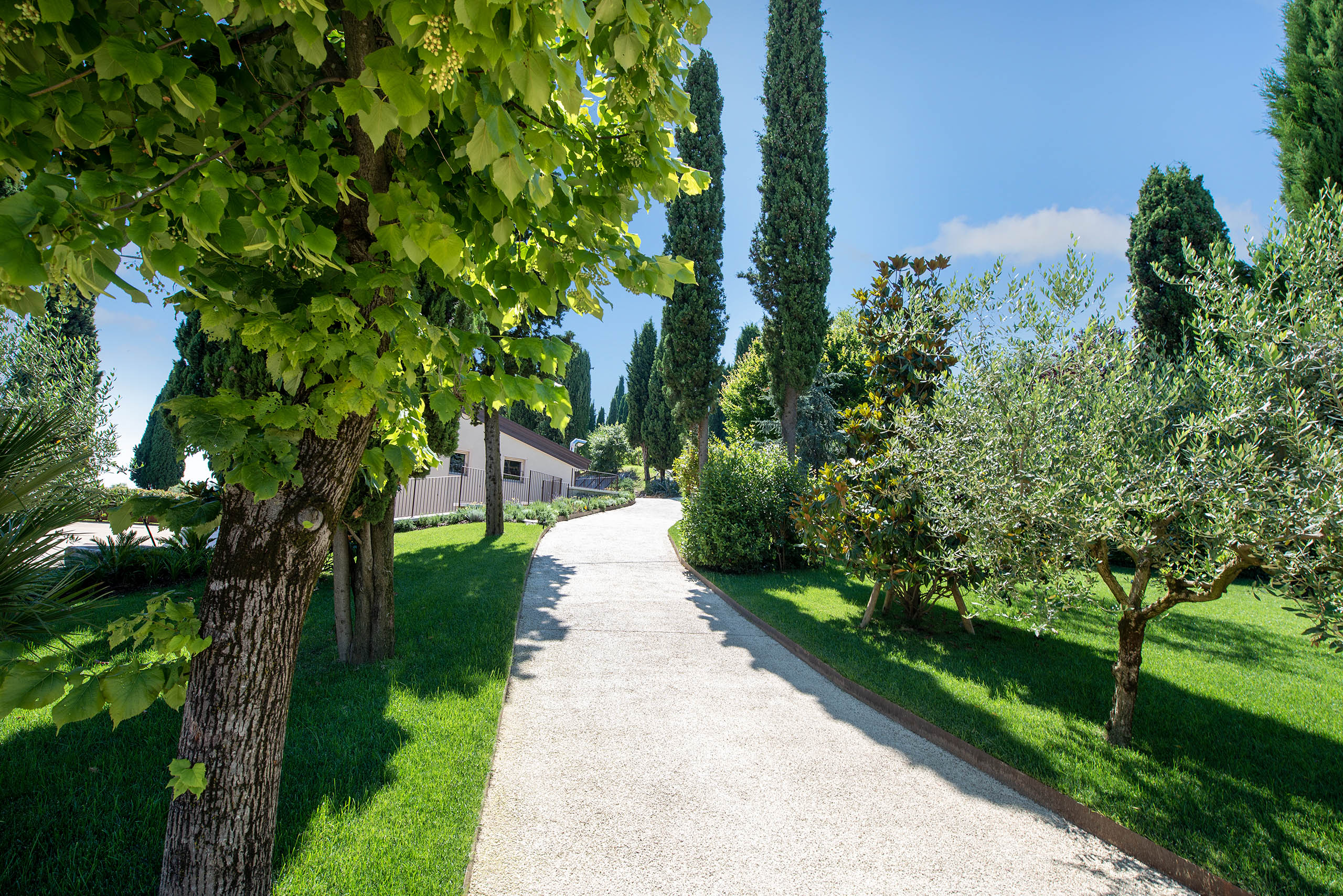 The meticulously tended garden is a true botanical paradise. Stone paths wind through centuries-old olive trees, blooming roses, fragrant lavenders, and towering cypress trees, creating enchanting and intimate corners where guests can stroll, meditate, or simply relax.