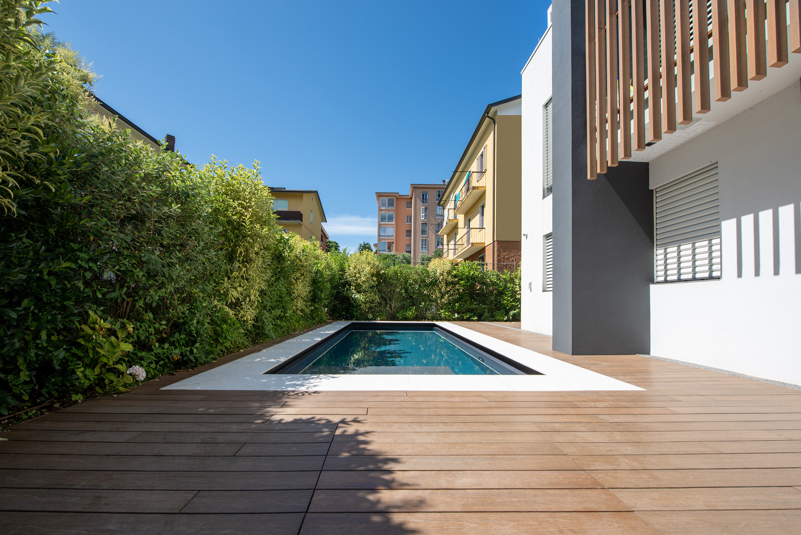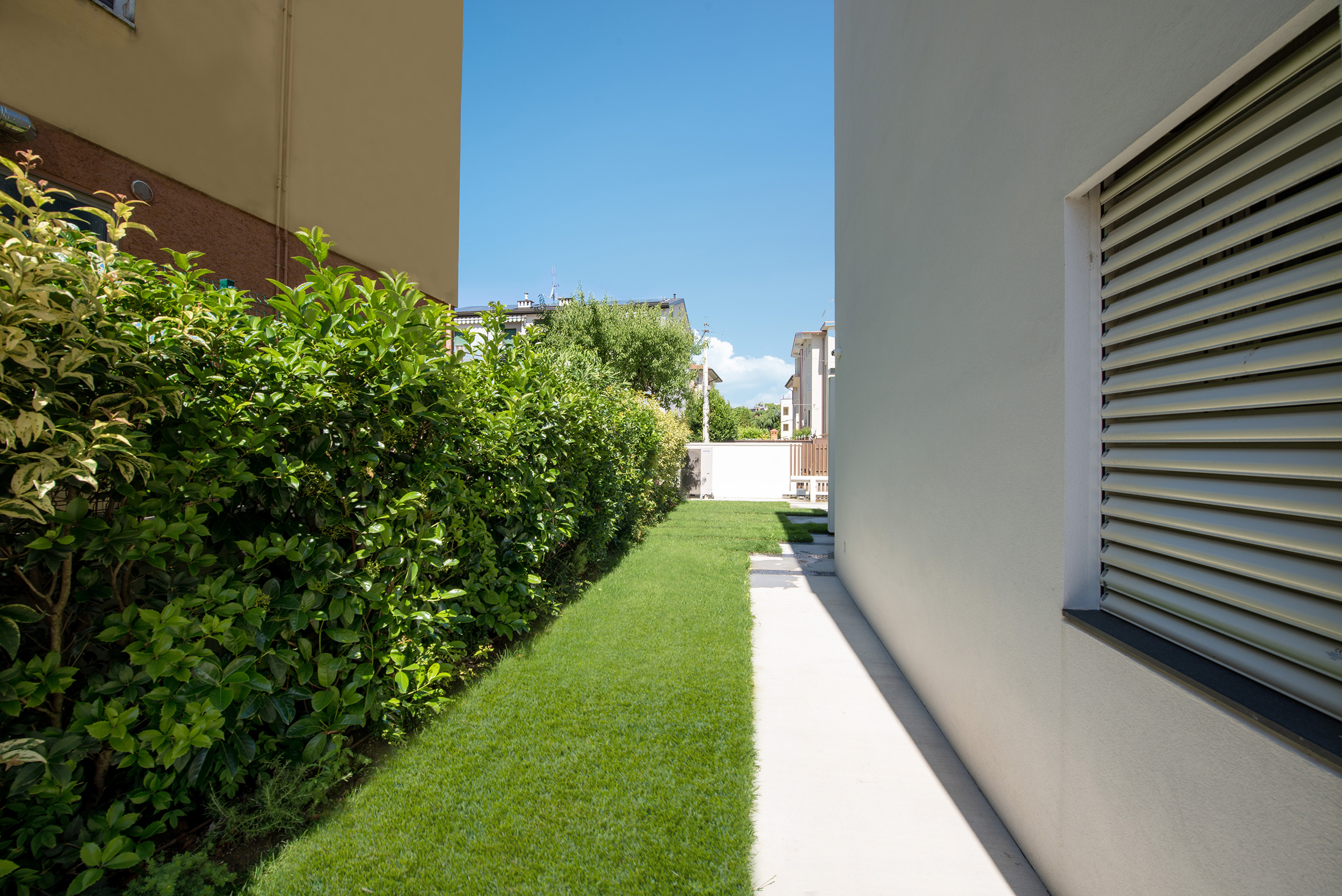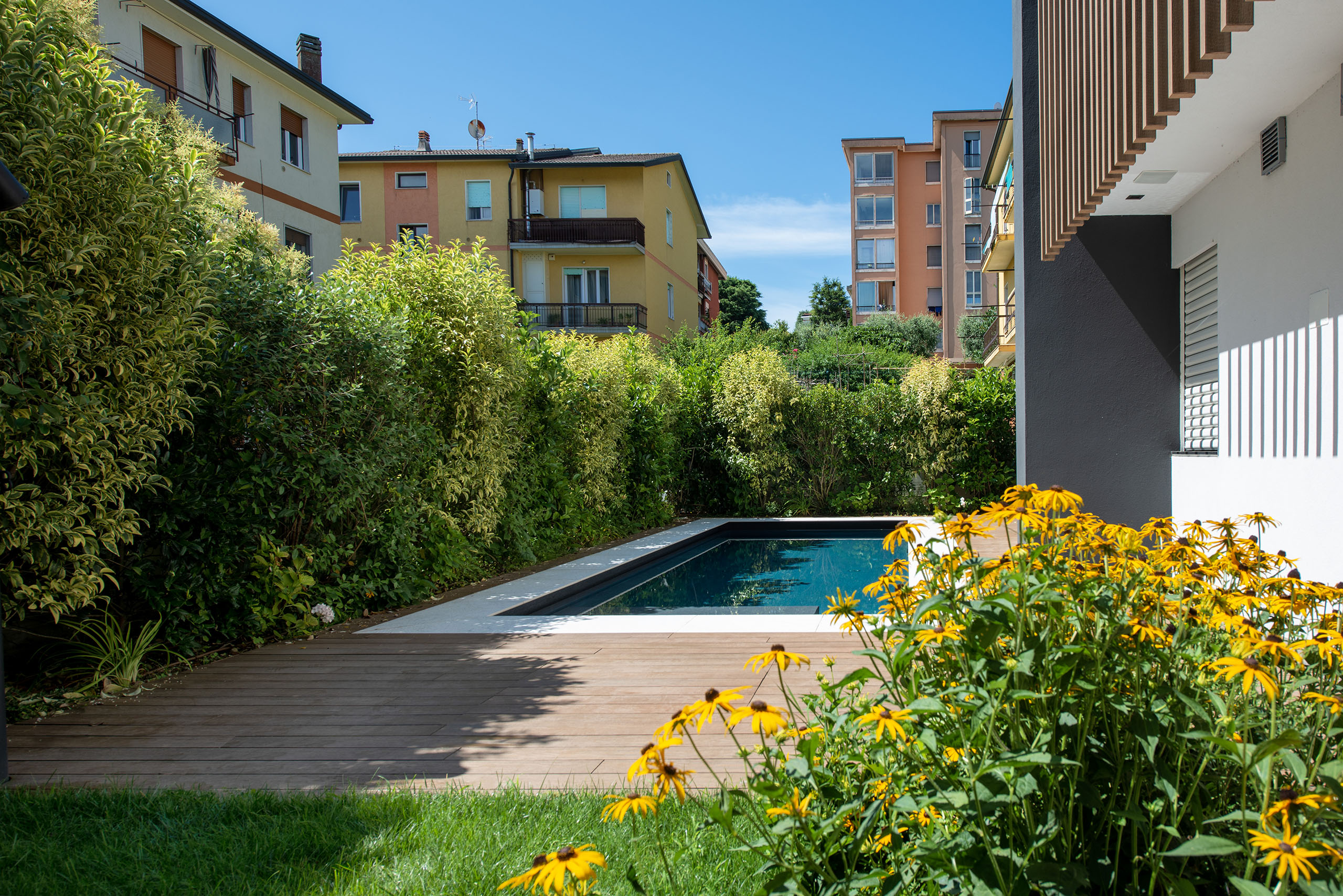 The garden of this modern villa, located in the heart of the historic center, represents a perfect balance between contemporary design and respect for the surrounding environment. The green space elegantly extends around the villa, offering an oasis of tranquility and beauty in an urban setting.