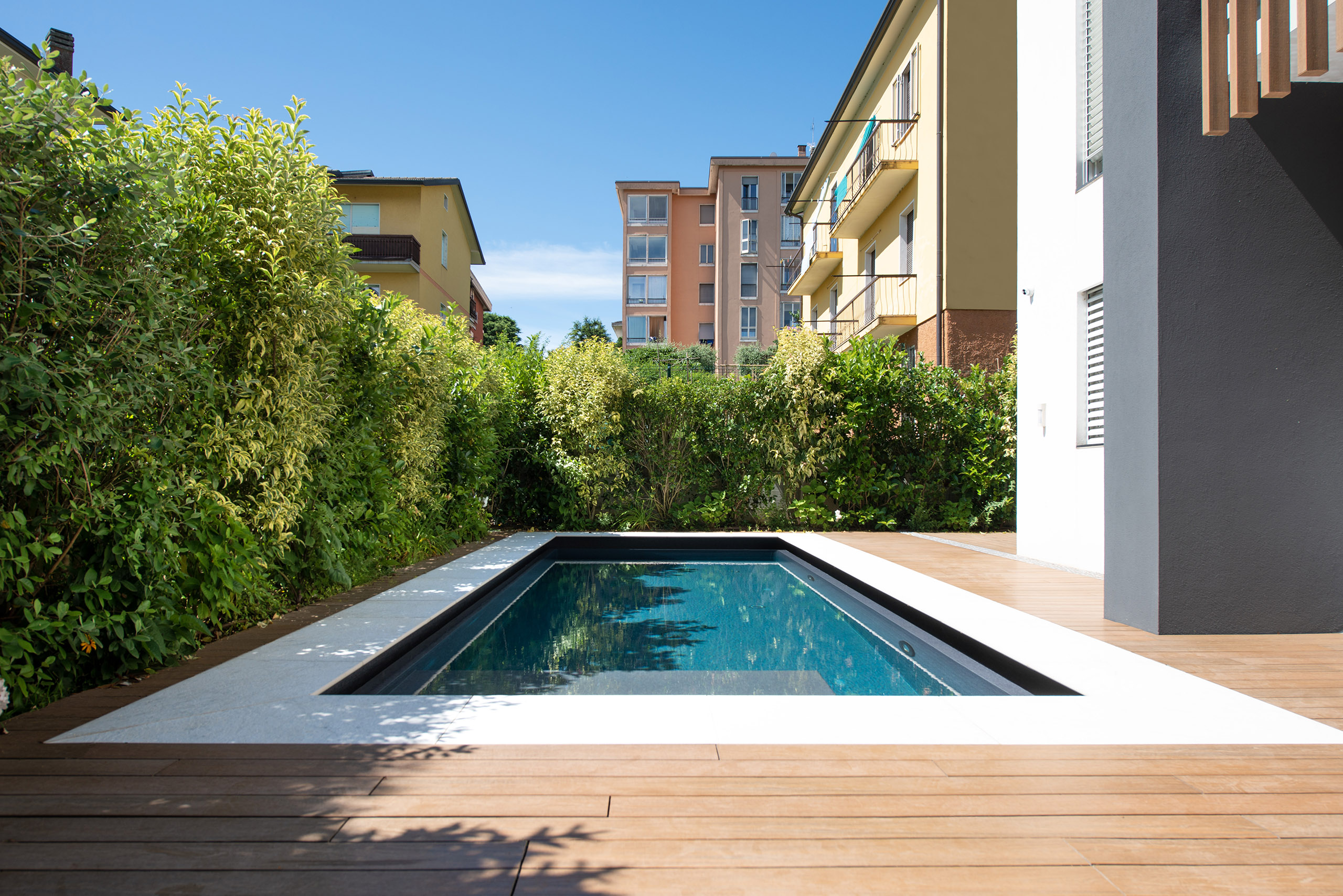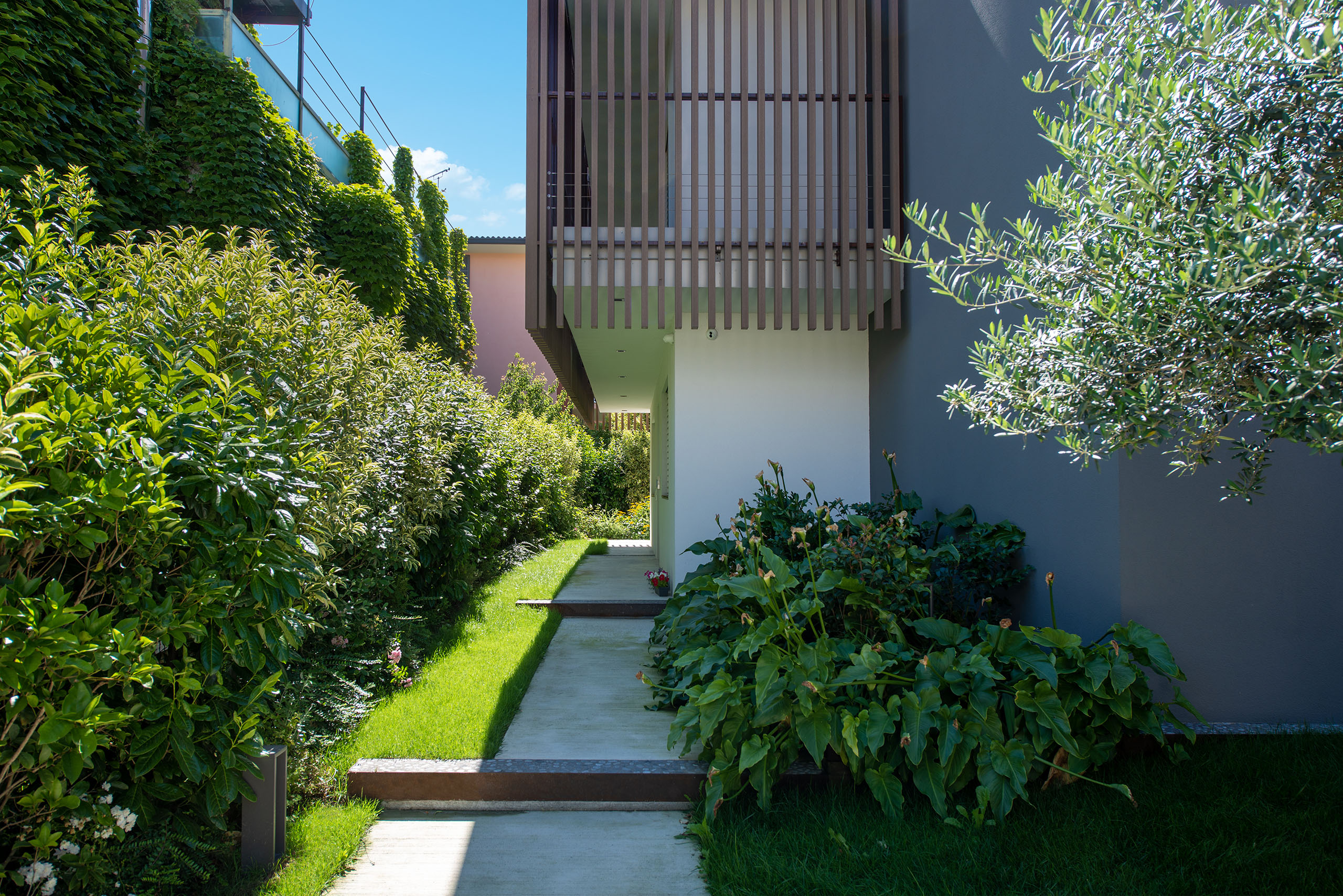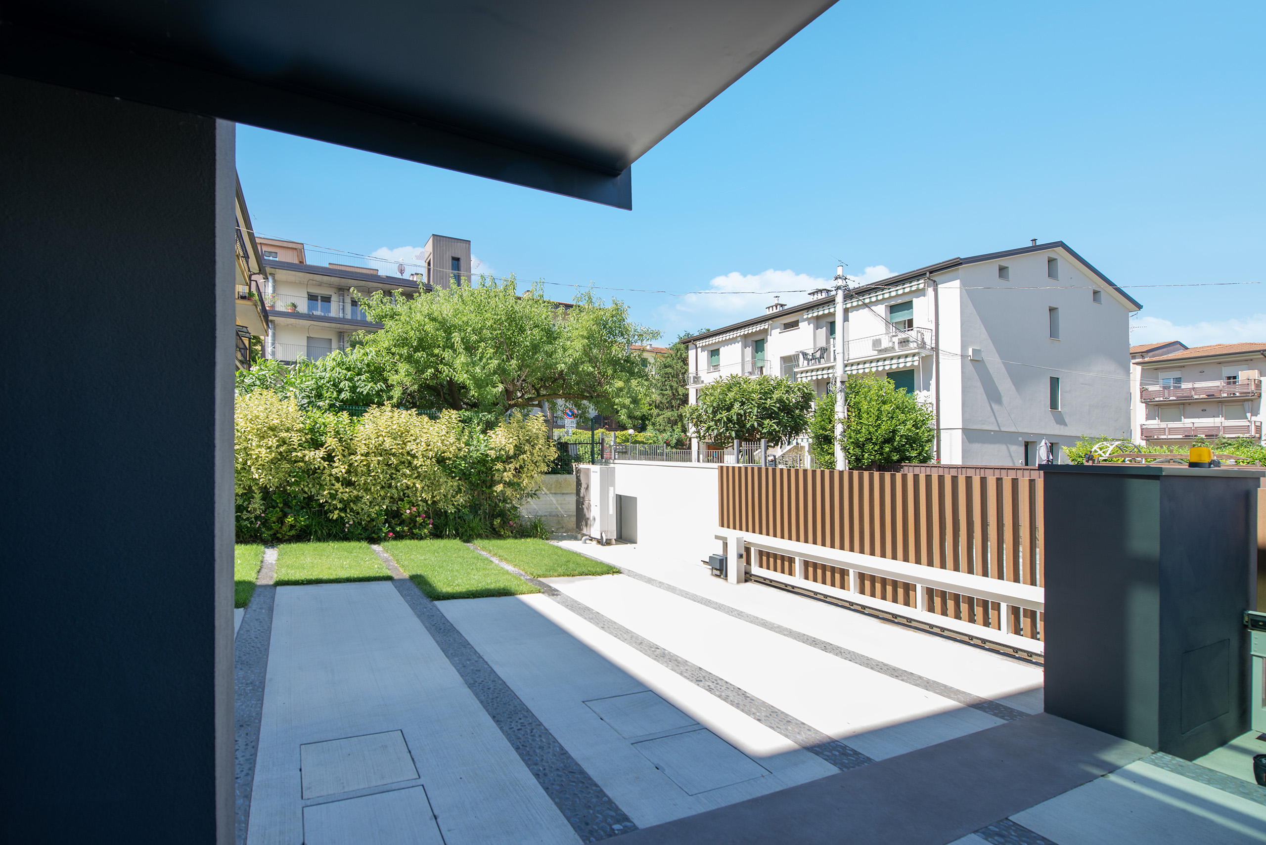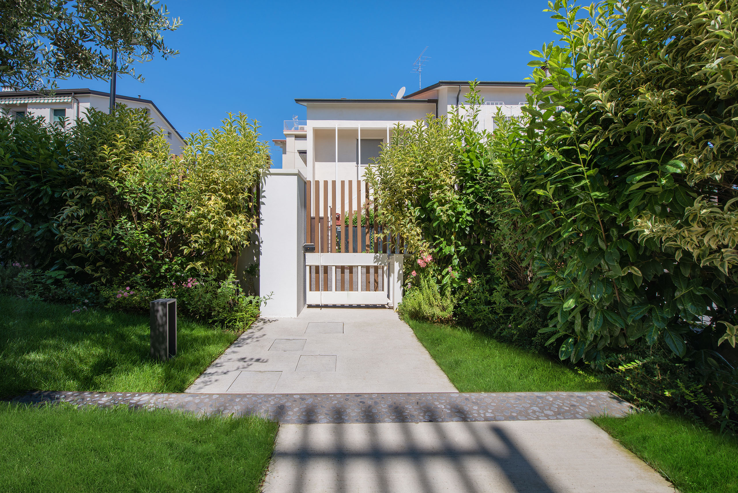 The garden of this modern villa, located in the heart of the historic center, represents a perfect balance between contemporary design and respect for the surrounding environment. The green space elegantly extends around the villa, offering an oasis of tranquility and beauty in an urban setting.