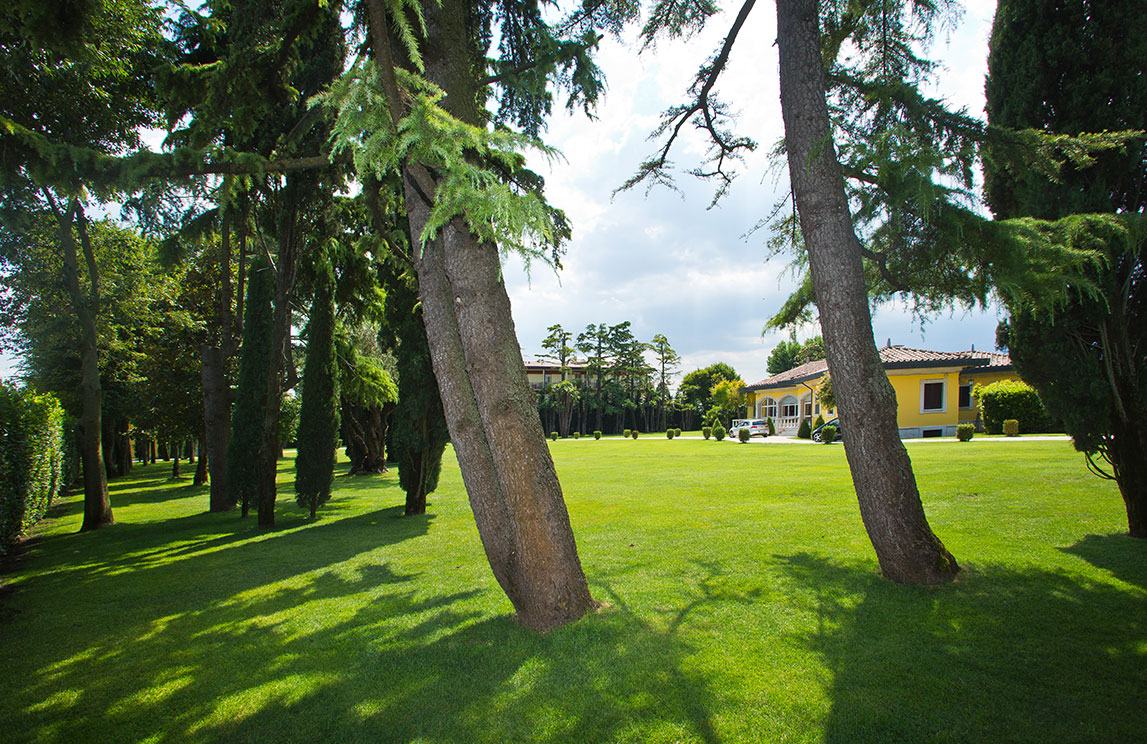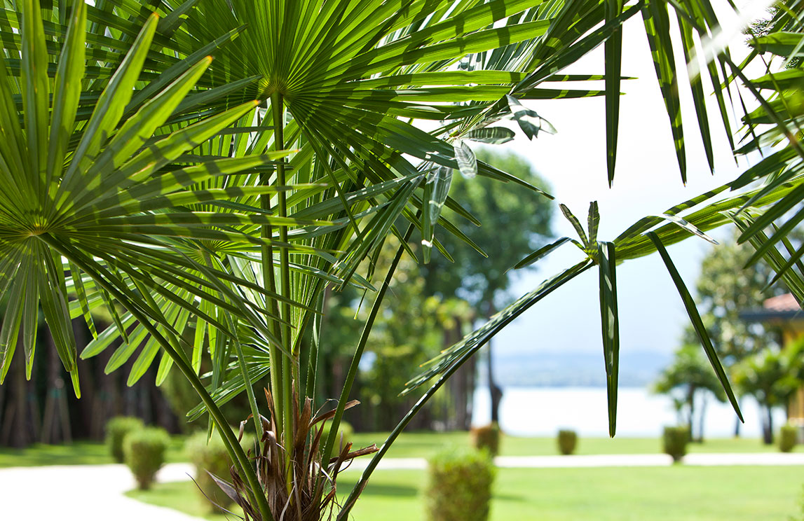 In this context, Spazio Verde created a villa garden planted with typical plants for the Garda area, including sculpted, formal boxwood and cypress trees. To add an exotic touch, groups of chamaerops excelsa (or trachycarpus fortunei) palms, from the Far East, were planted, characterized by branchless stems covered with thickly intertwined brown fibres. Every year, new, large, well-defined, bright green fan leaves develop from the top of the trunk. In June, the palm is covered with long, cream-yellow panicles, and then clusters of blue-black fruit.