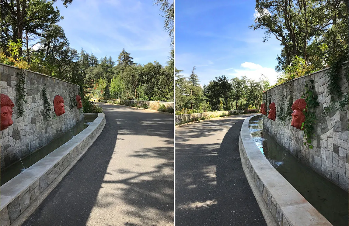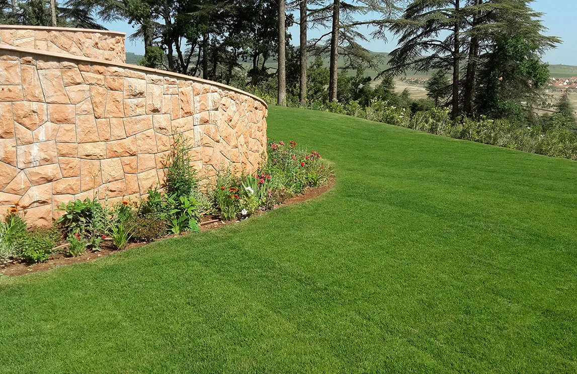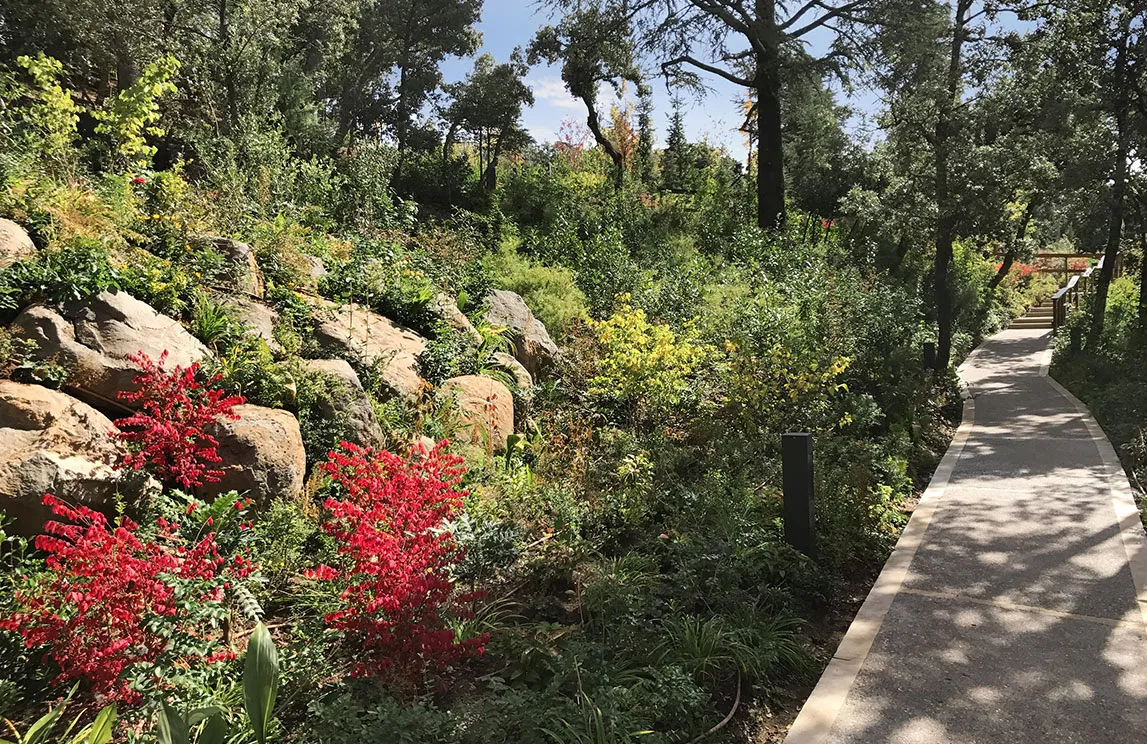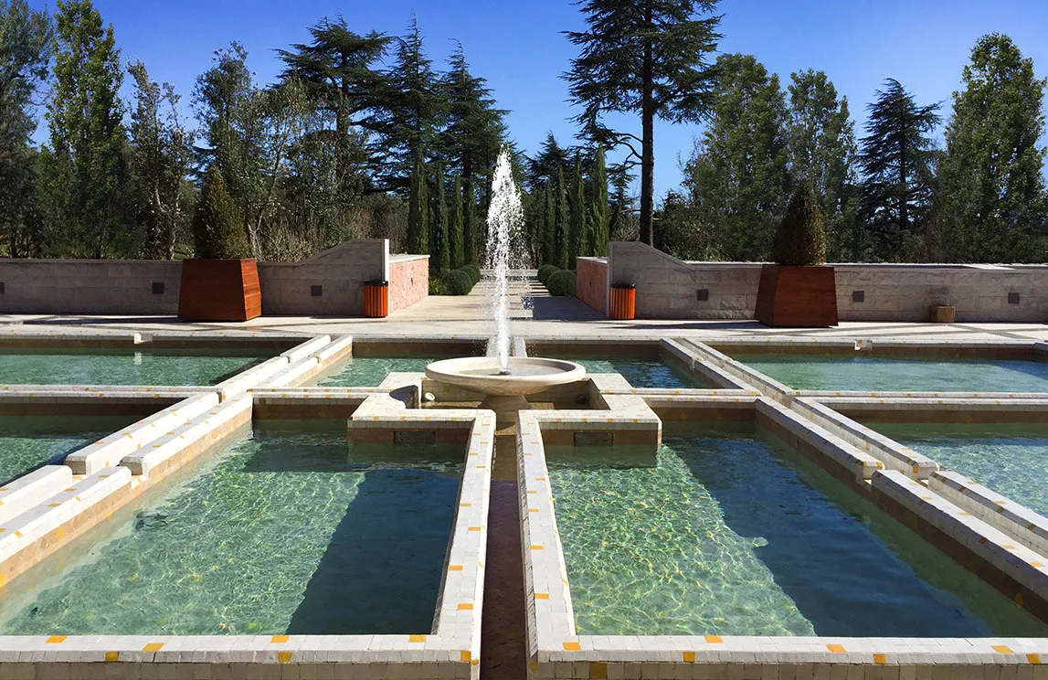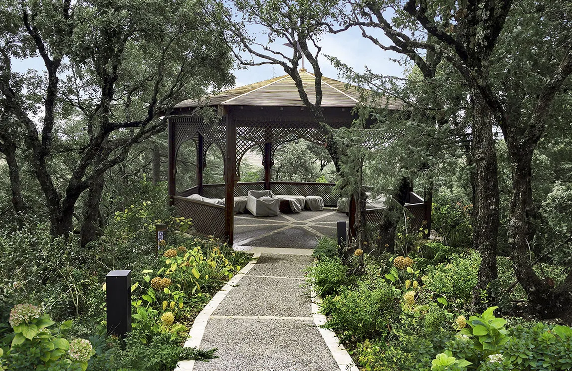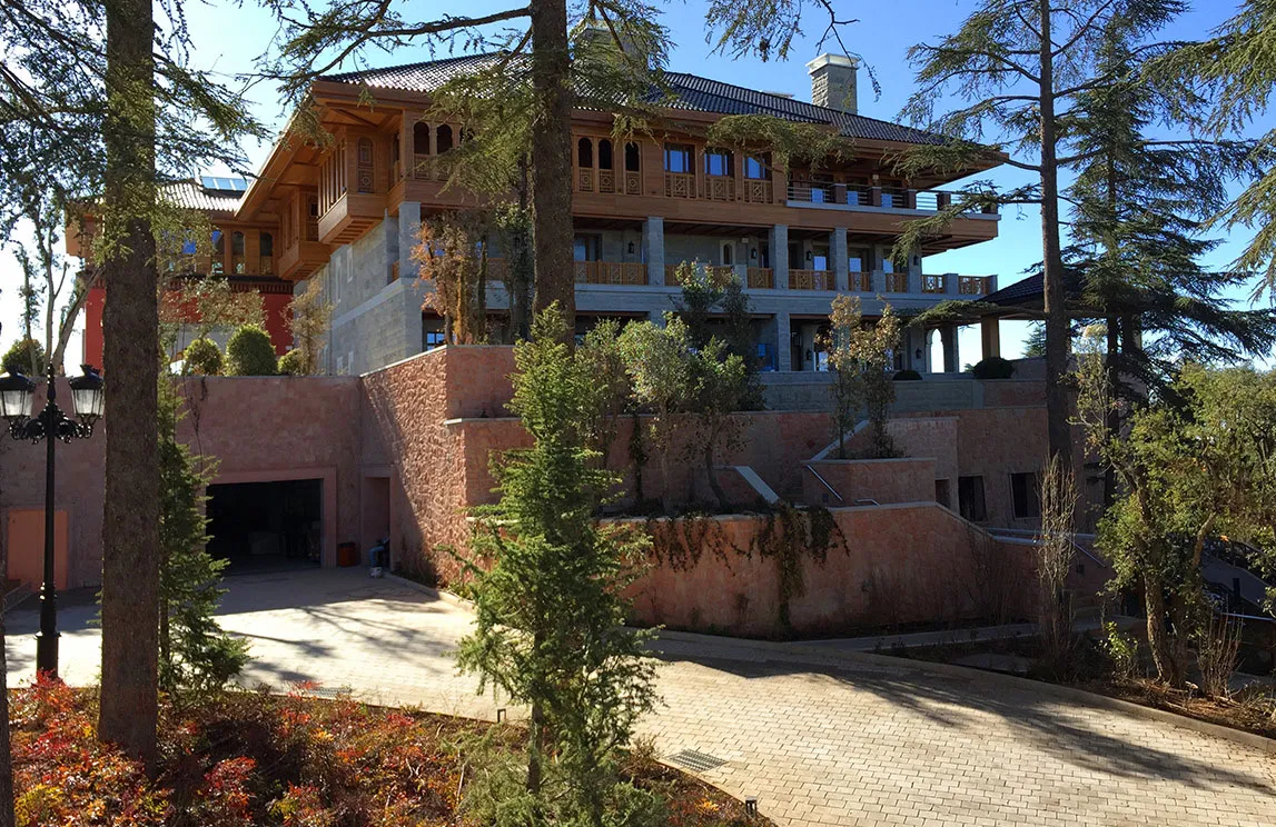 Degne di un parco collocato in uno scenario da Mille e una notte sono la piscina a cascata rivestita in marmo di Bisazza, la fontana situata all’ingresso del palazzo principale rivestita in mosaico e componenti in alabastro, la fontana lungo la strada rivestita in marmo con 17 teste di leone realizzate con stampo esclusivo in cotto dell’Impruneta, il campo da tennis realizzato in resina sintetica, alcune opere di ingegneria naturalistica – fra cui le terre armate a sostegno dei pendii con massi ciclopici, l’eliporto, il rivestimento dei muri di contenimento con pietra locale, i drenaggi superficiali – i marmi e i graniti utilizzati per le pavimentazioni all’esterno degli edifici – provenienti dall’Arabia Saudita – e i percorsi pedonali all’interno della foresta, realizzati in calcestruzzo architettonico. Contribuiscono al fascino di questo mix di Oriente e Occidente gli arredi da esterno rigorosamente made in Italy.