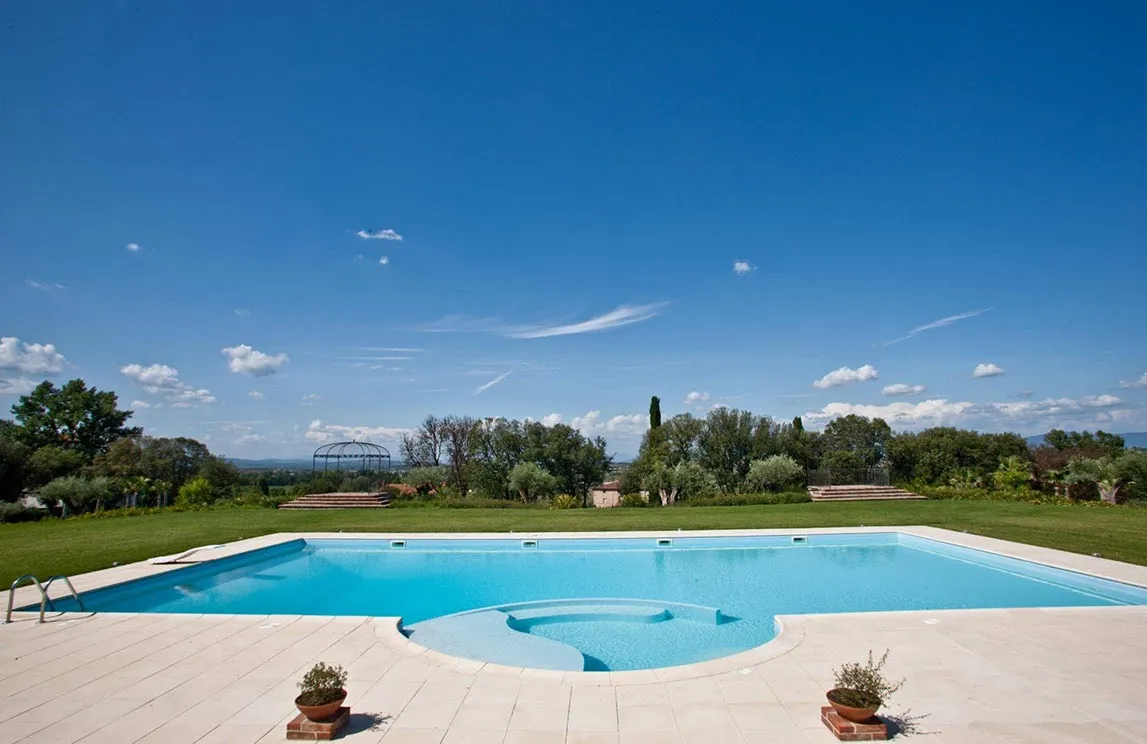 La piscina è a skimmer, con sistema di filtrazione a cloro, e le pavimentazioni a essa adiacenti sono in Marmo di Carrara.