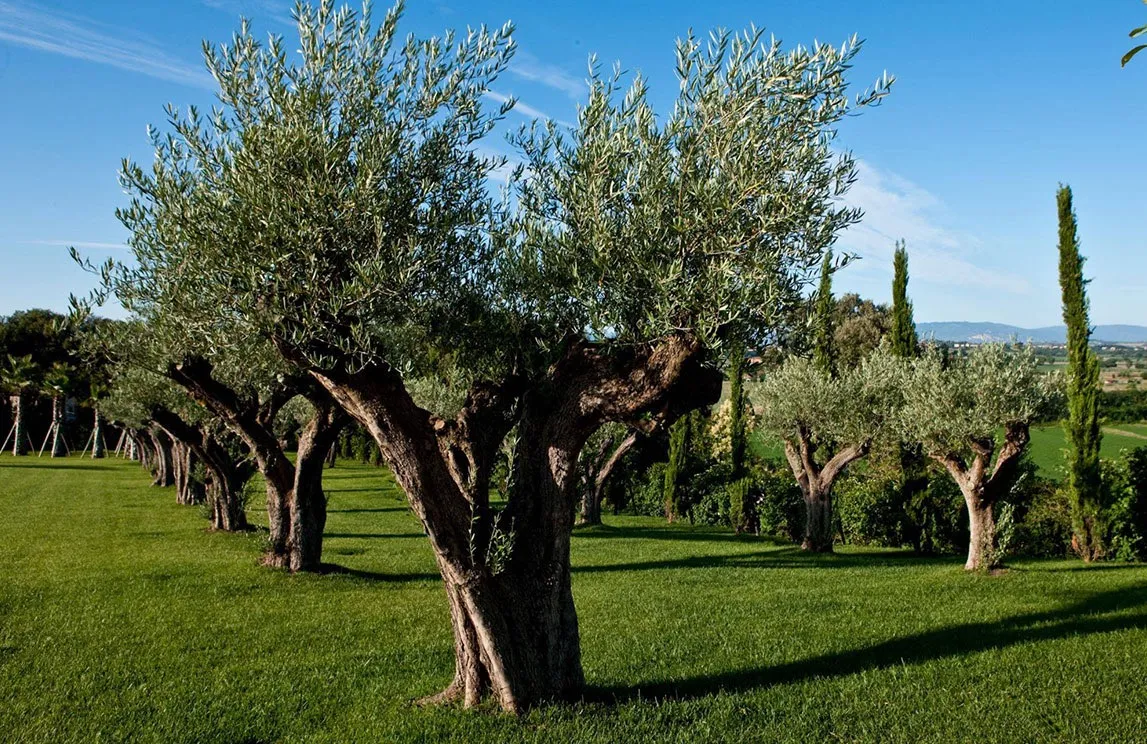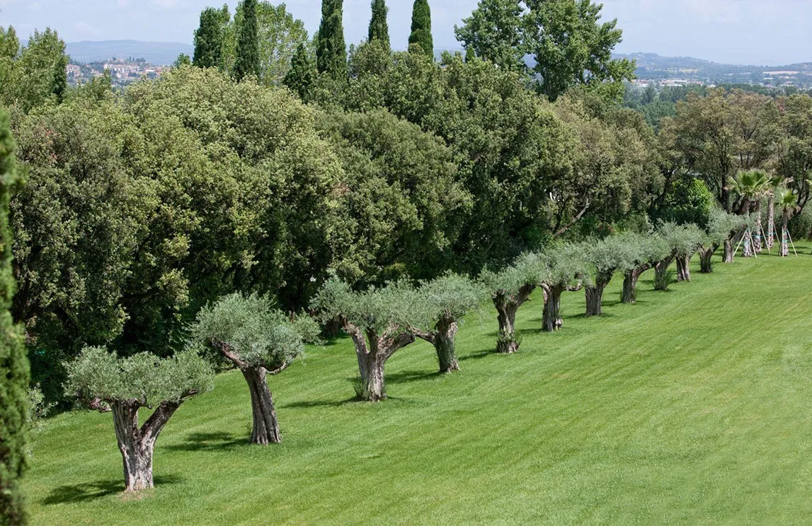 La scelta botanica è ricaduta ovviamente su olivi secolari, palmizi, cipressi, fioriture 4 stagioni e agrumi in vasi di cotto dell’Impruneta.