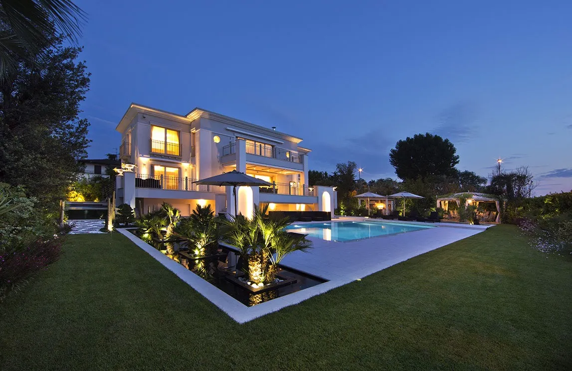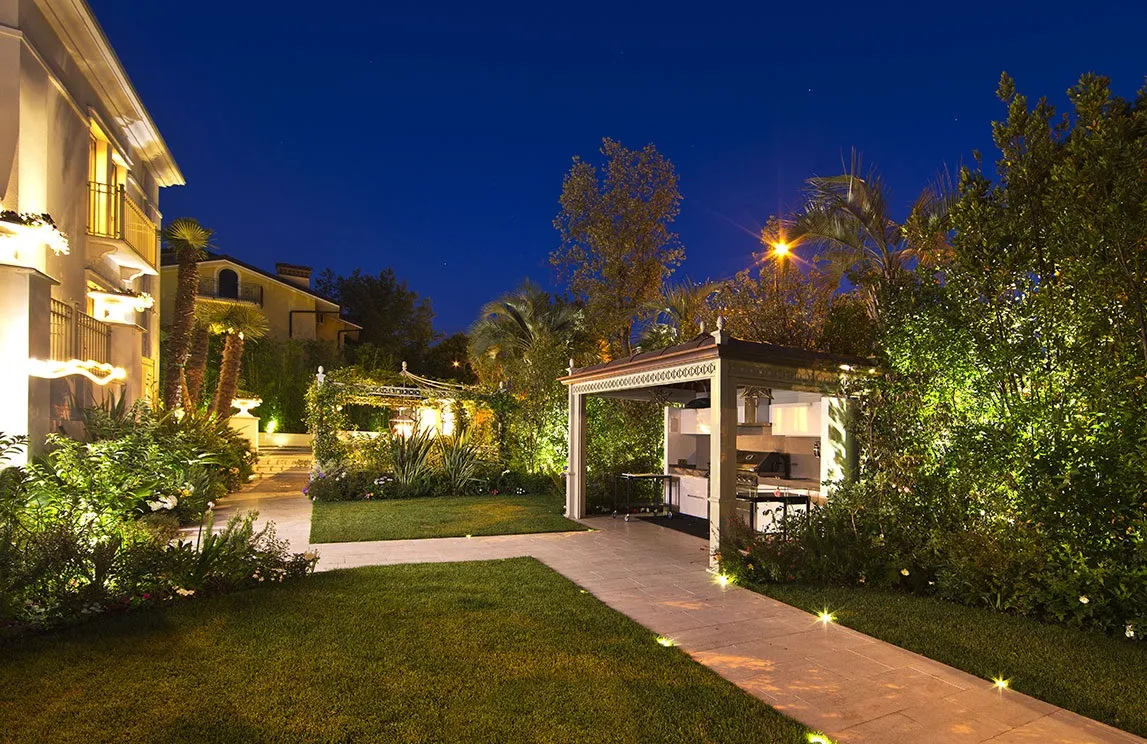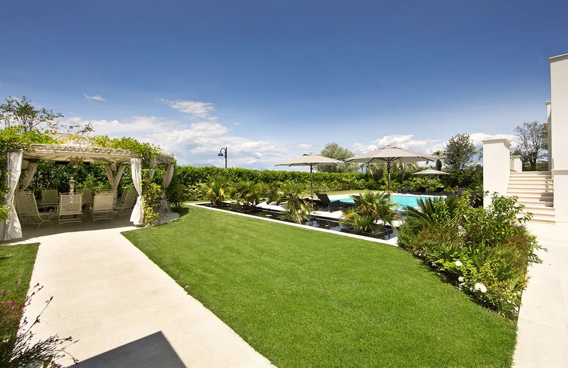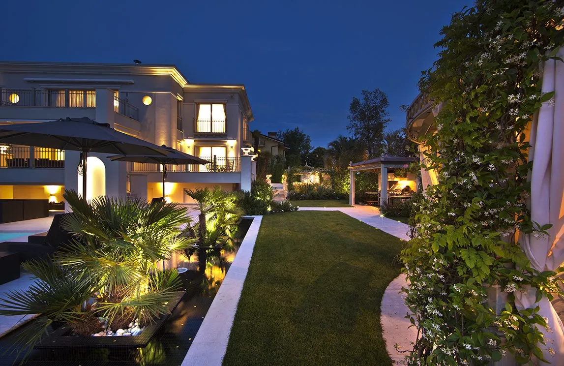 La piscina a sfioro con chiusura a tapparella elettrizzata e idromassaggio incorporato, i percorsi pedonali in marmo di Carrara, le spettacolari fontane rivestite con mosaico e provviste, al loro interno, di fioriere, la fontana d’ingresso con specchio e cascata, la vasca depurata – per la collezione di carpe koi giapponesi – l’angolo nei pressi della vasca delle carpe koi adibito a giardino zen, la cucina e gli arredi da esterno, i pergolati e il gazebo (che funge da struttura per la copertura della cucina esterna) sono i punti focali della realizzazione. Una realizzazione che ha previsto, inoltre, l’utilizzo di materiali di altissima qualità ad alto risparmio idrico e di drenaggi per il recupero delle acque bianche e superficiali – per quanto riguarda l’irrigazione – e l’installazione di un’illuminazione scenografica a basso consumo – tecnologia a LED – e dell’illuminazione di servizio.
