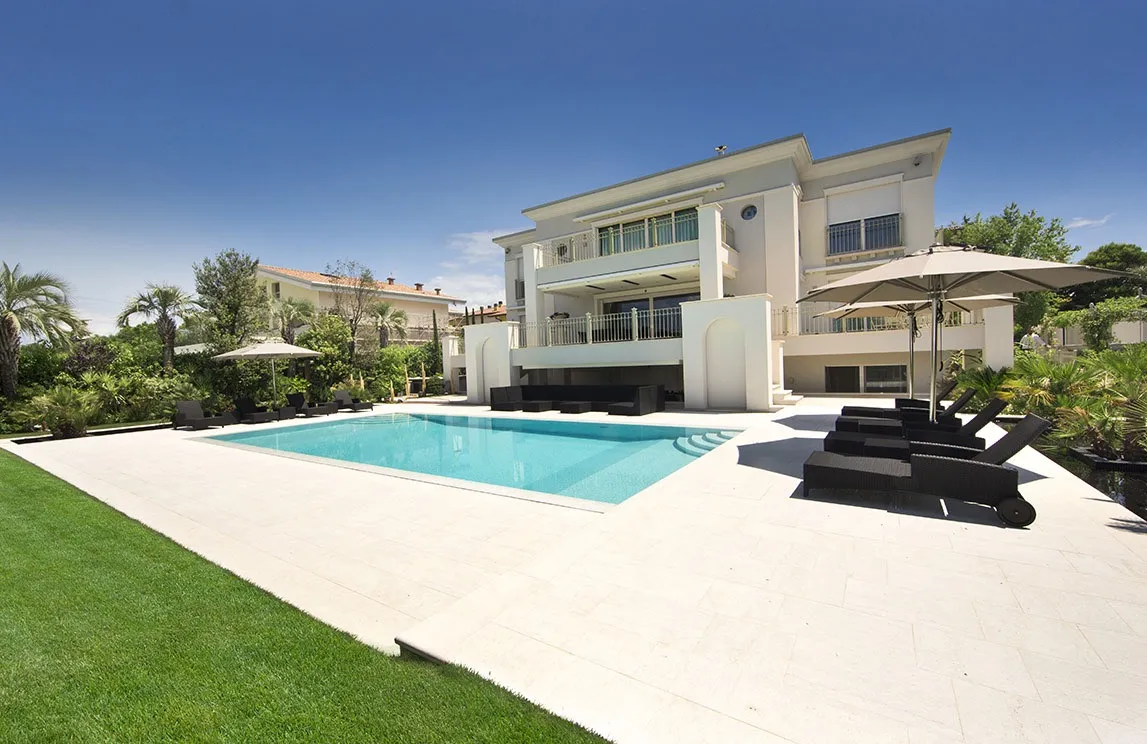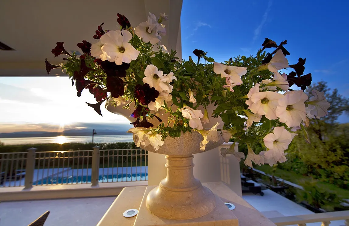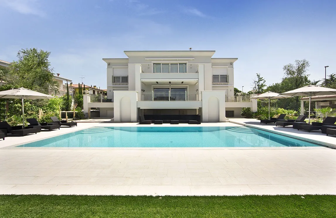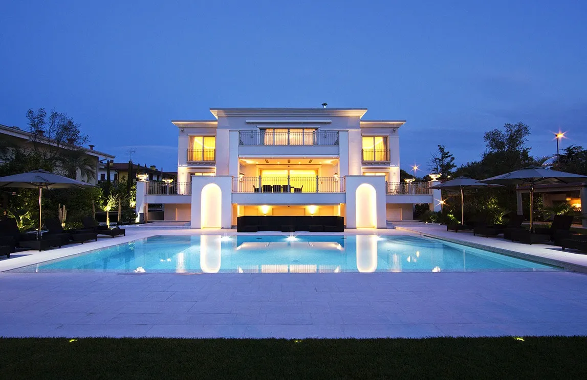 La piscina a sfioro con chiusura a tapparella elettrizzata e idromassaggio incorporato, i percorsi pedonali in marmo di Carrara, le spettacolari fontane rivestite con mosaico e provviste, al loro interno, di fioriere, la fontana d’ingresso con specchio e cascata, la vasca depurata – per la collezione di carpe koi giapponesi – l’angolo nei pressi della vasca delle carpe koi adibito a giardino zen, la cucina e gli arredi da esterno, i pergolati e il gazebo (che funge da struttura per la copertura della cucina esterna) sono i punti focali della realizzazione. Una realizzazione che ha previsto, inoltre, l’utilizzo di materiali di altissima qualità ad alto risparmio idrico e di drenaggi per il recupero delle acque bianche e superficiali – per quanto riguarda l’irrigazione – e l’installazione di un’illuminazione scenografica a basso consumo – tecnologia a LED – e dell’illuminazione di servizio.