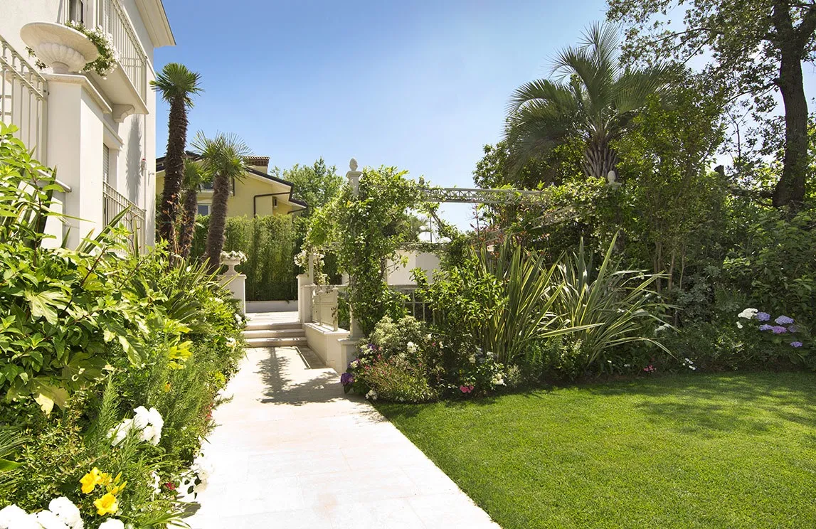 Per la realizzazione del giardino di questa splendida villa sul lungomare, Spazio Verde ha piantumato palme e altre tipologie di piante mediterranee, che si armonizzano perfettamente con il naturale scenario offerto dalla Liguria, meravigliosa terra di montagne imponenti e di dolci colline colorate dal verde della macchia mediterranea, che si affacciano sul mar Ligure con coste alte e frastagliate.