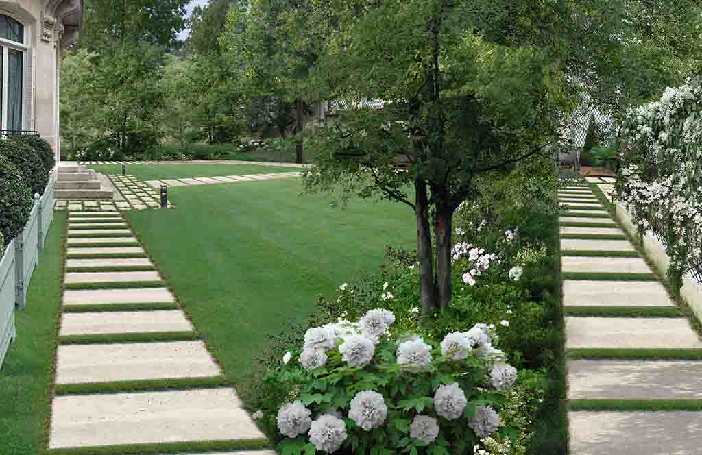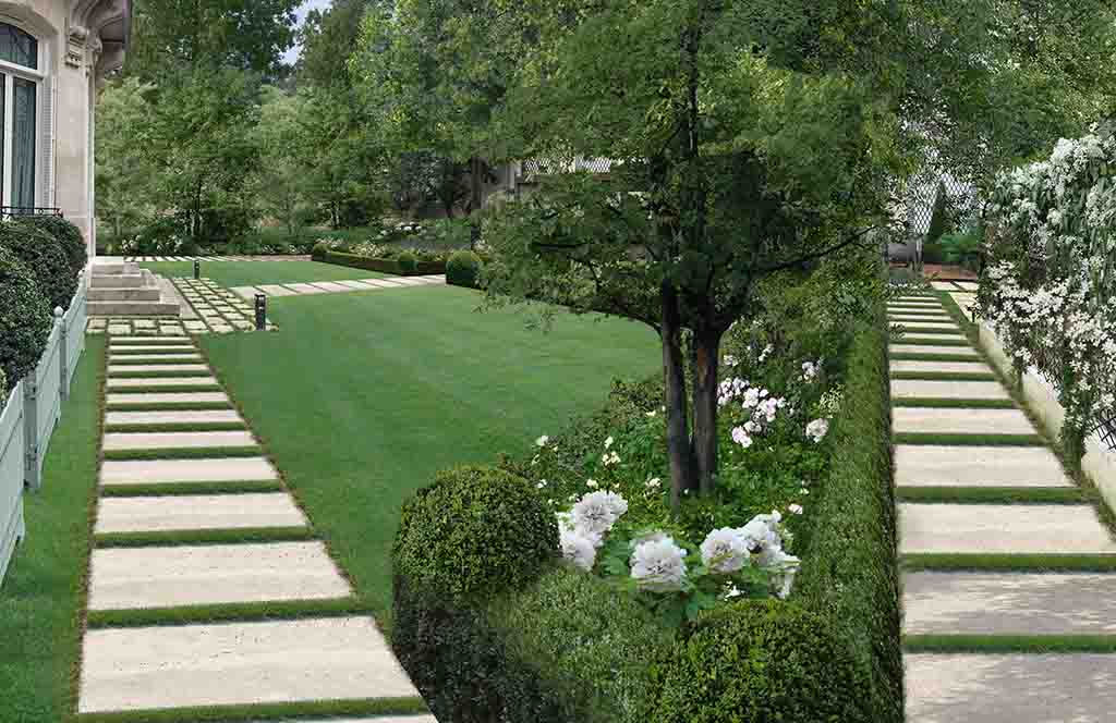 Treillage fatti a mano, fioriere e vasi lavorati, geometrie di aiuole fiorite delimitate da siepi regolari e buxus, uno schema rigoroso e preciso in cui nulla è lasciato al caso.