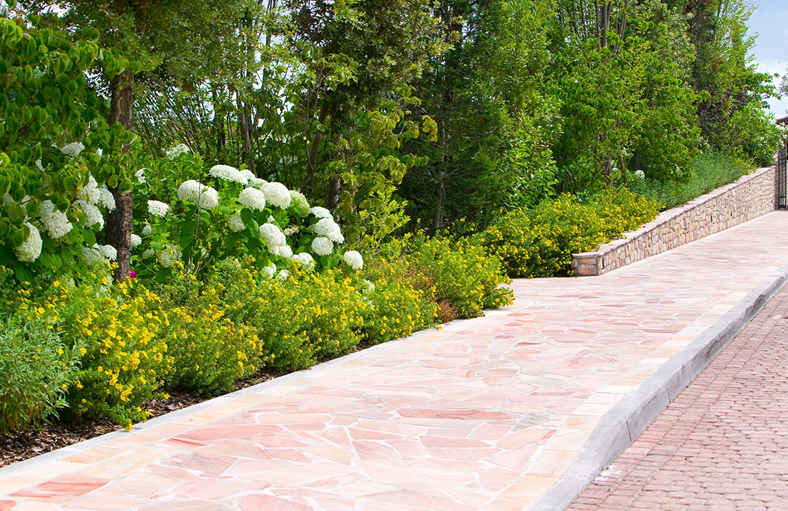 Le strade carrabili sono state eseguite con masselli autobloccanti drenanti, mentre i vialetti pedonali sono in pietra da esterni.