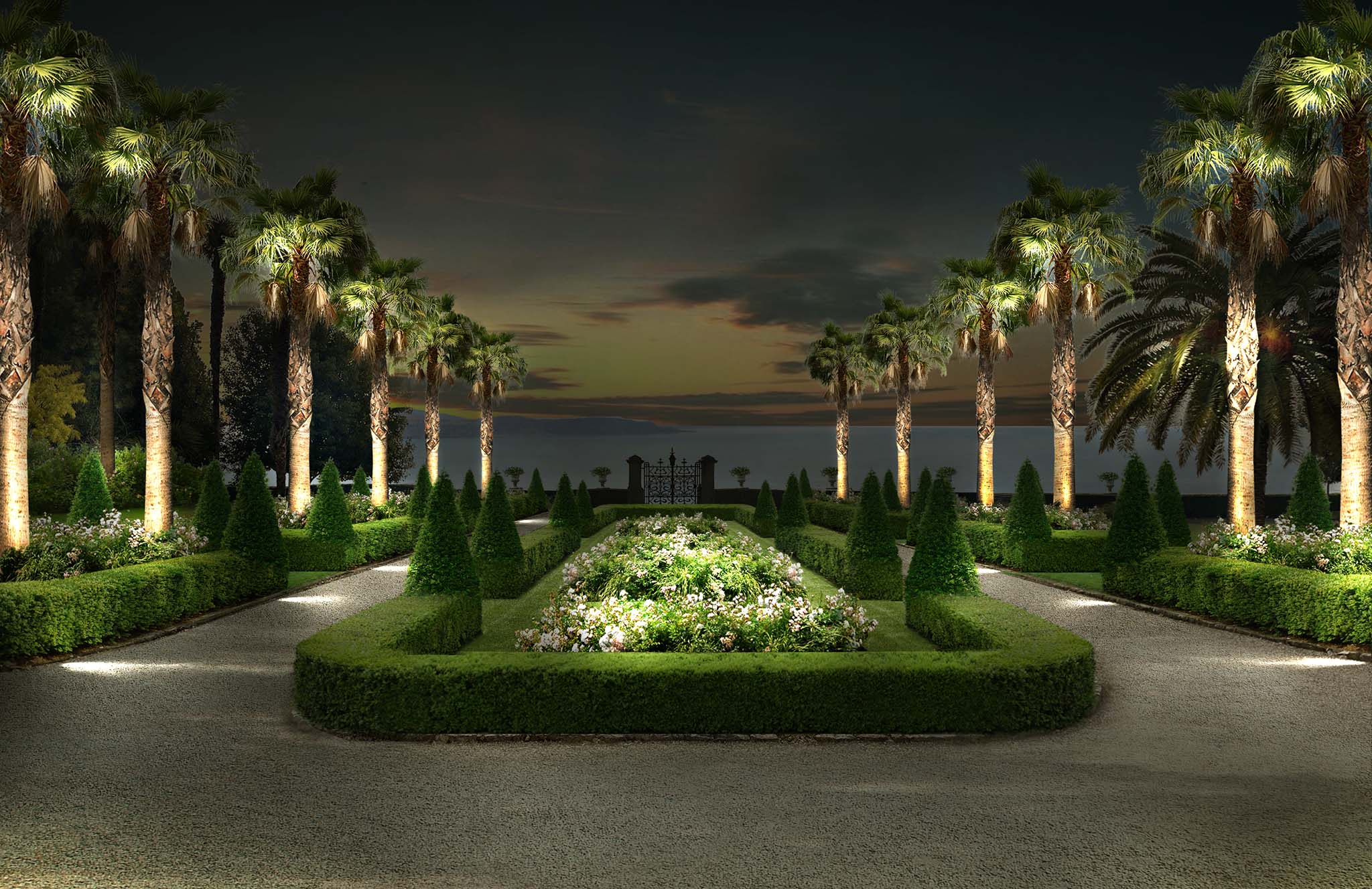 Un elegante giardino all’italiana con palme esemplari che fanno da cornice allo splendido contesto.