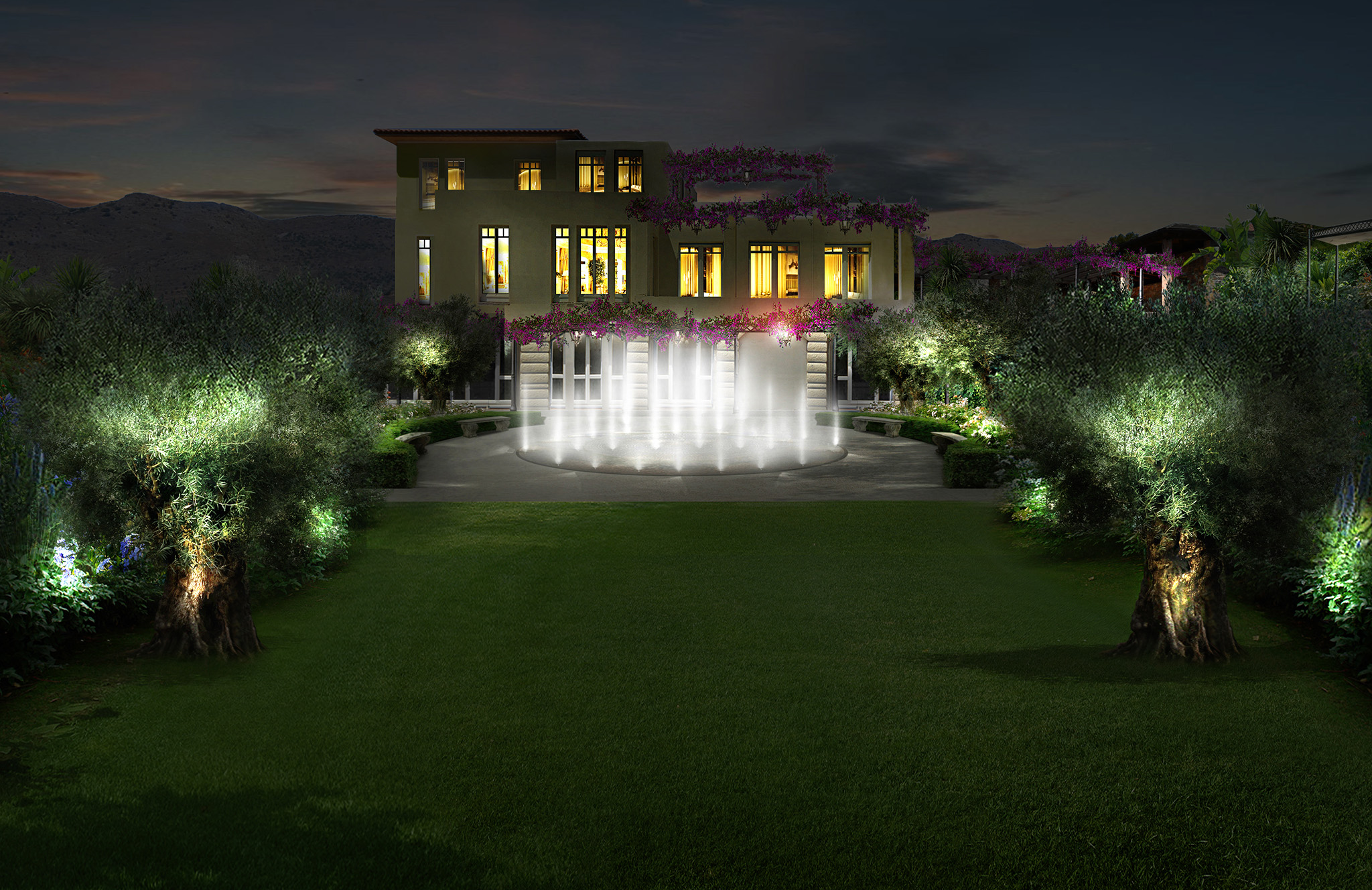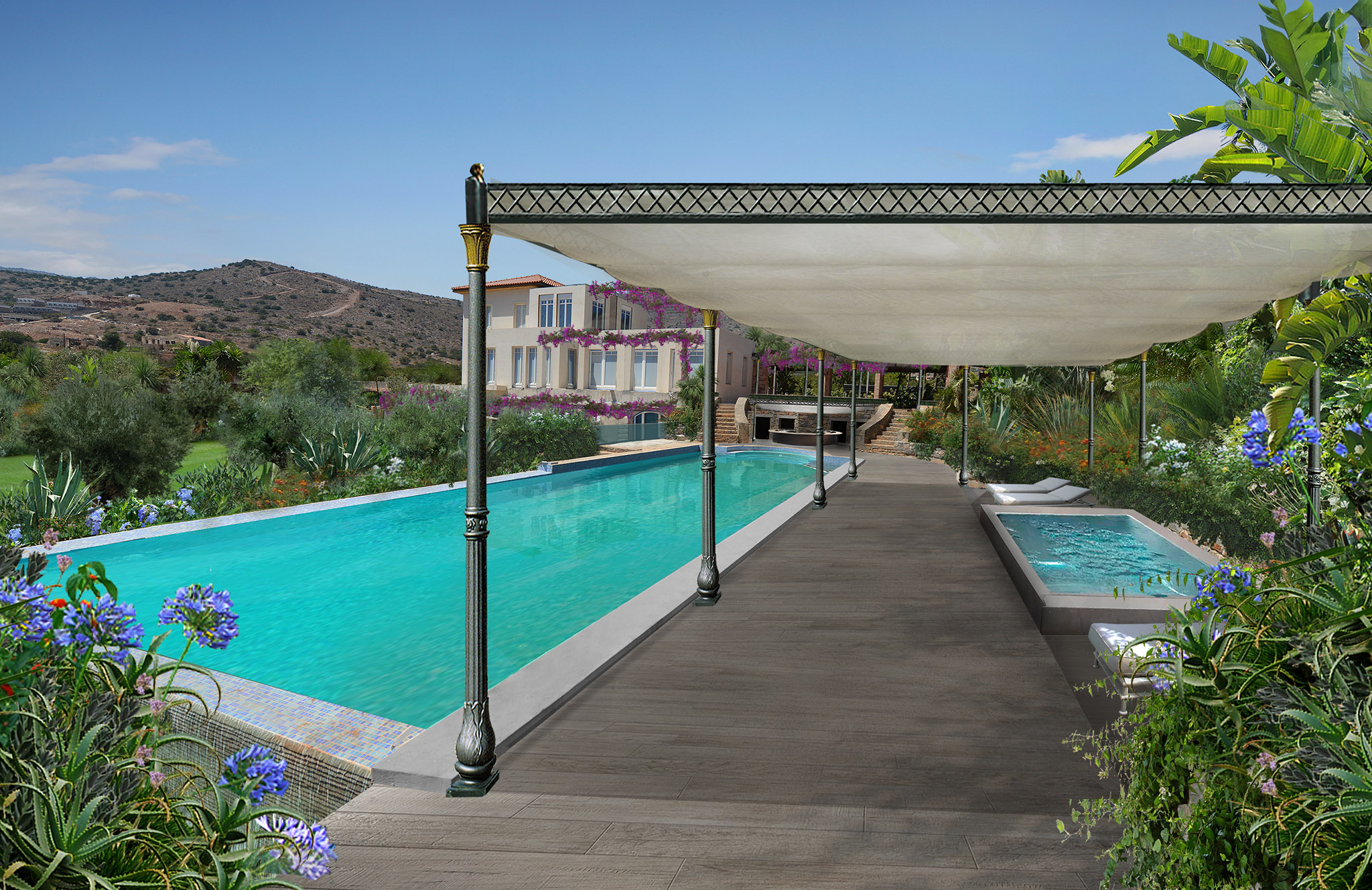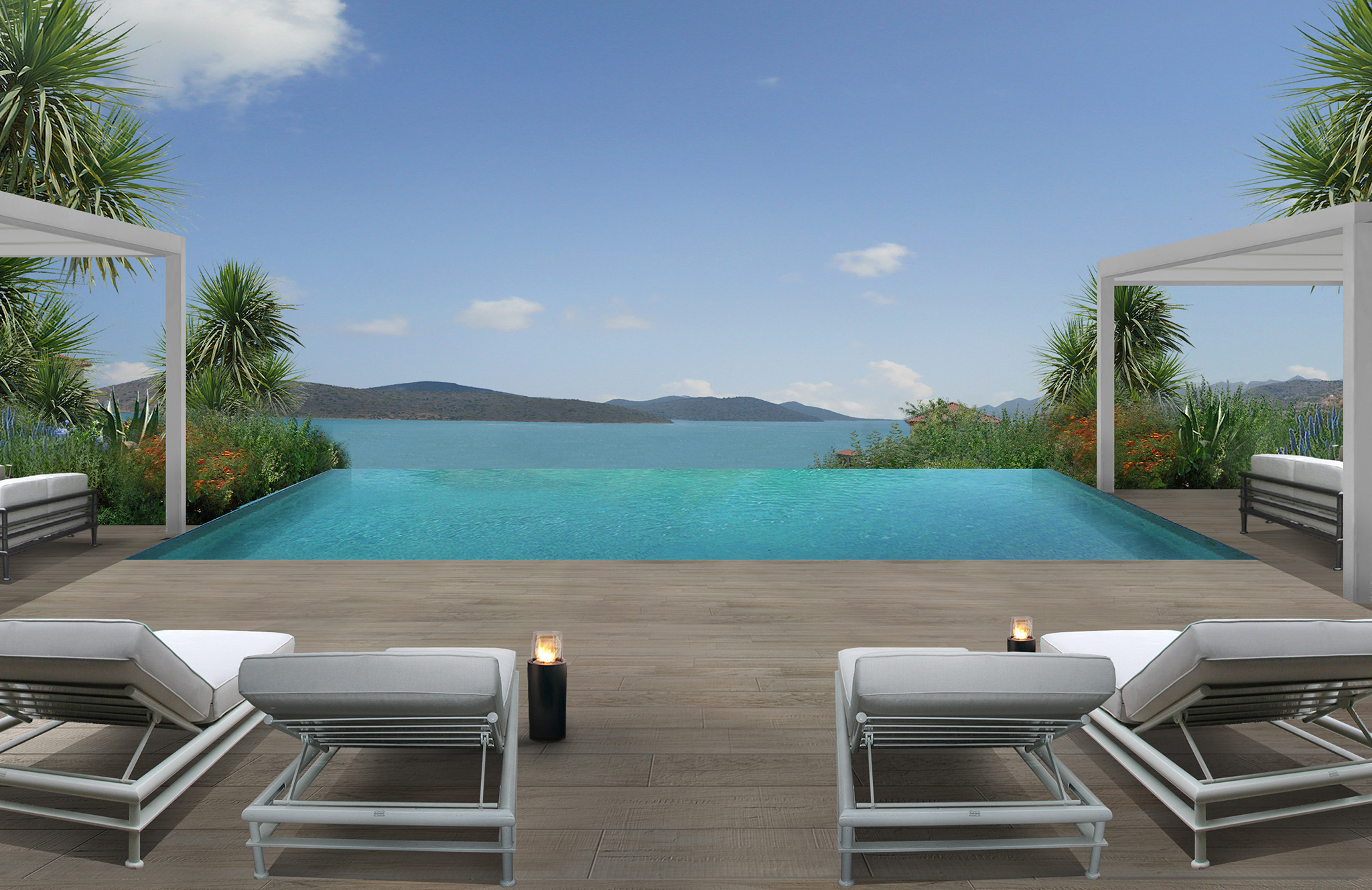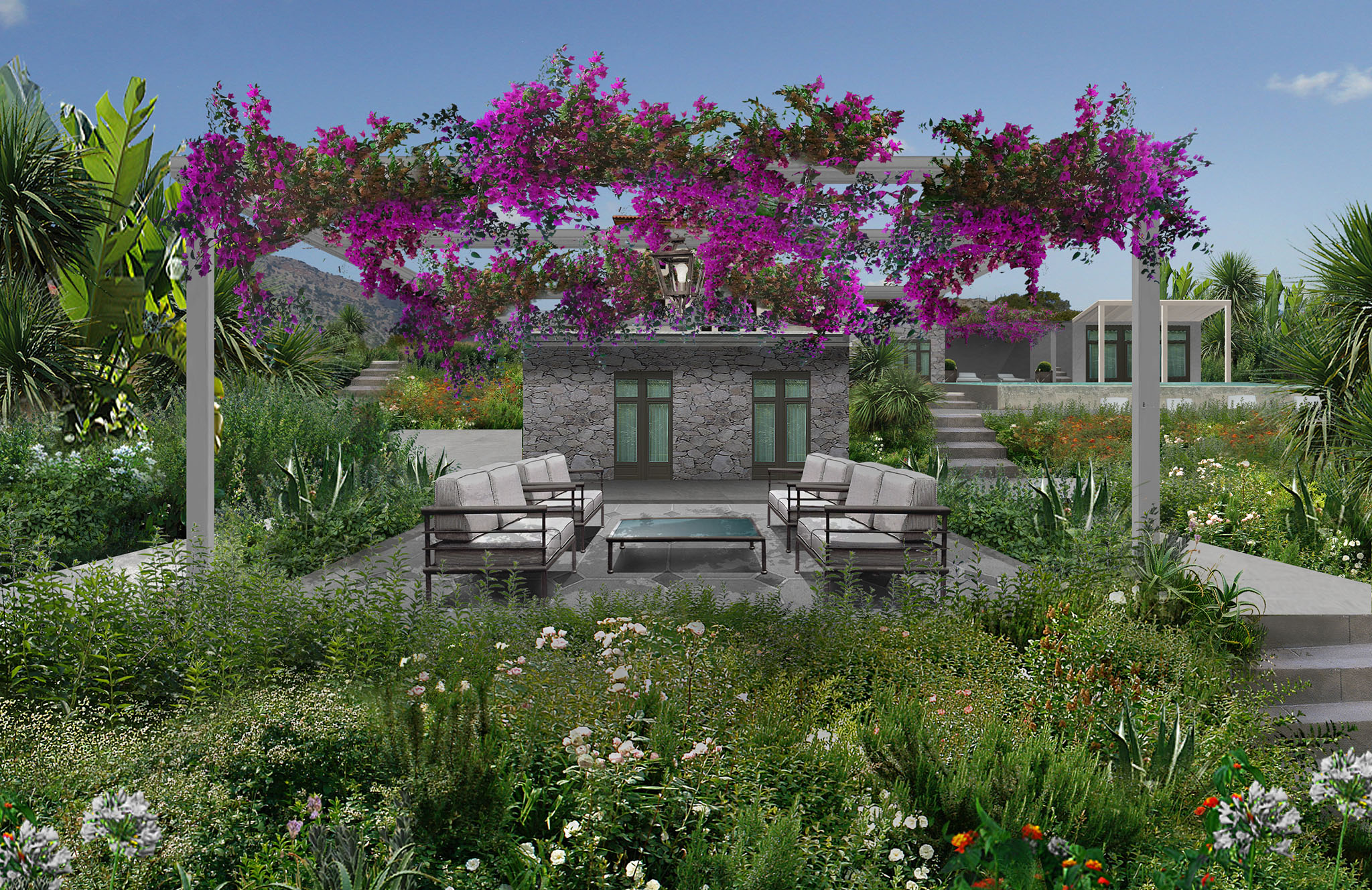 Una progettazione del verde dettagliata e rigogliosa di un complesso di ville sull’isola di Creta.