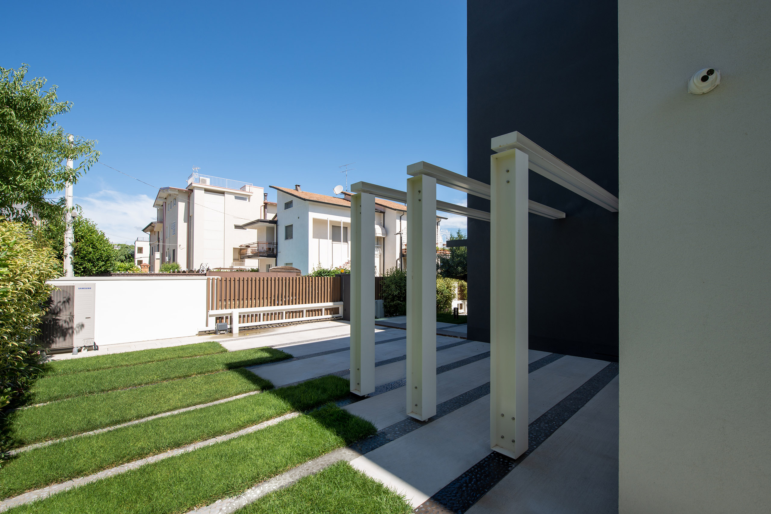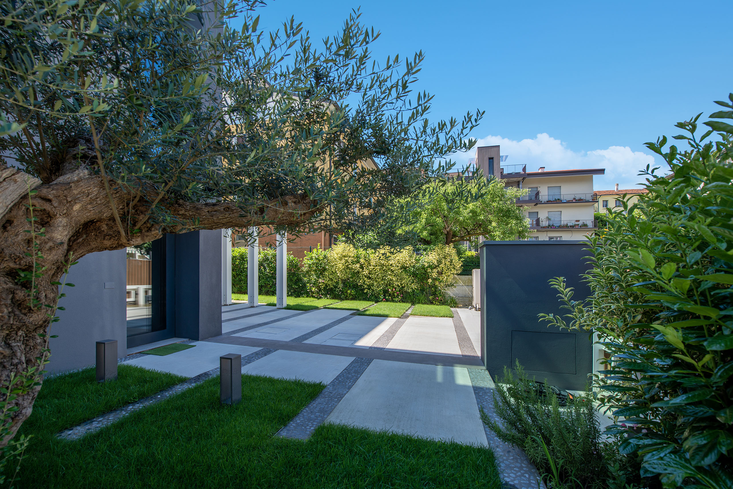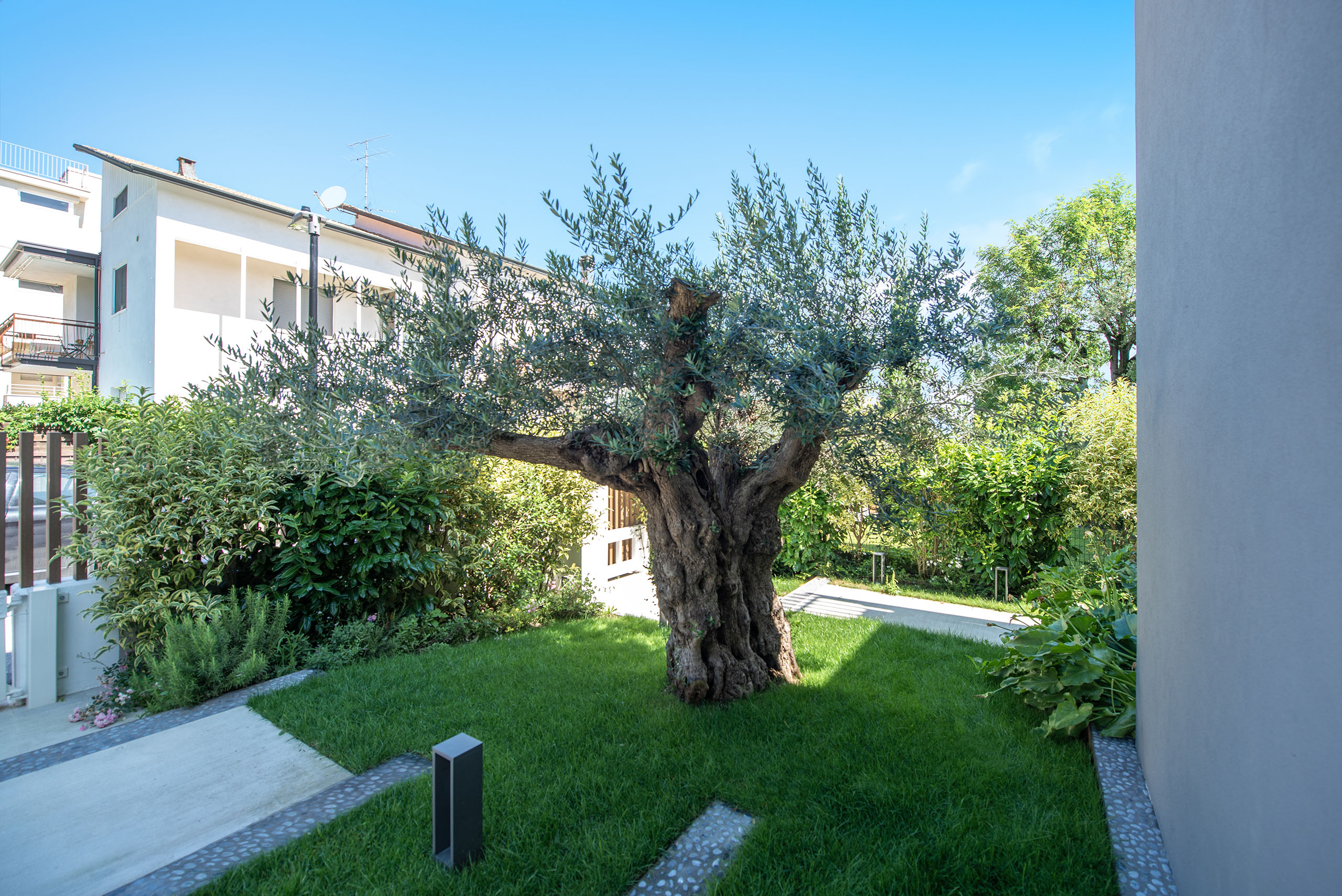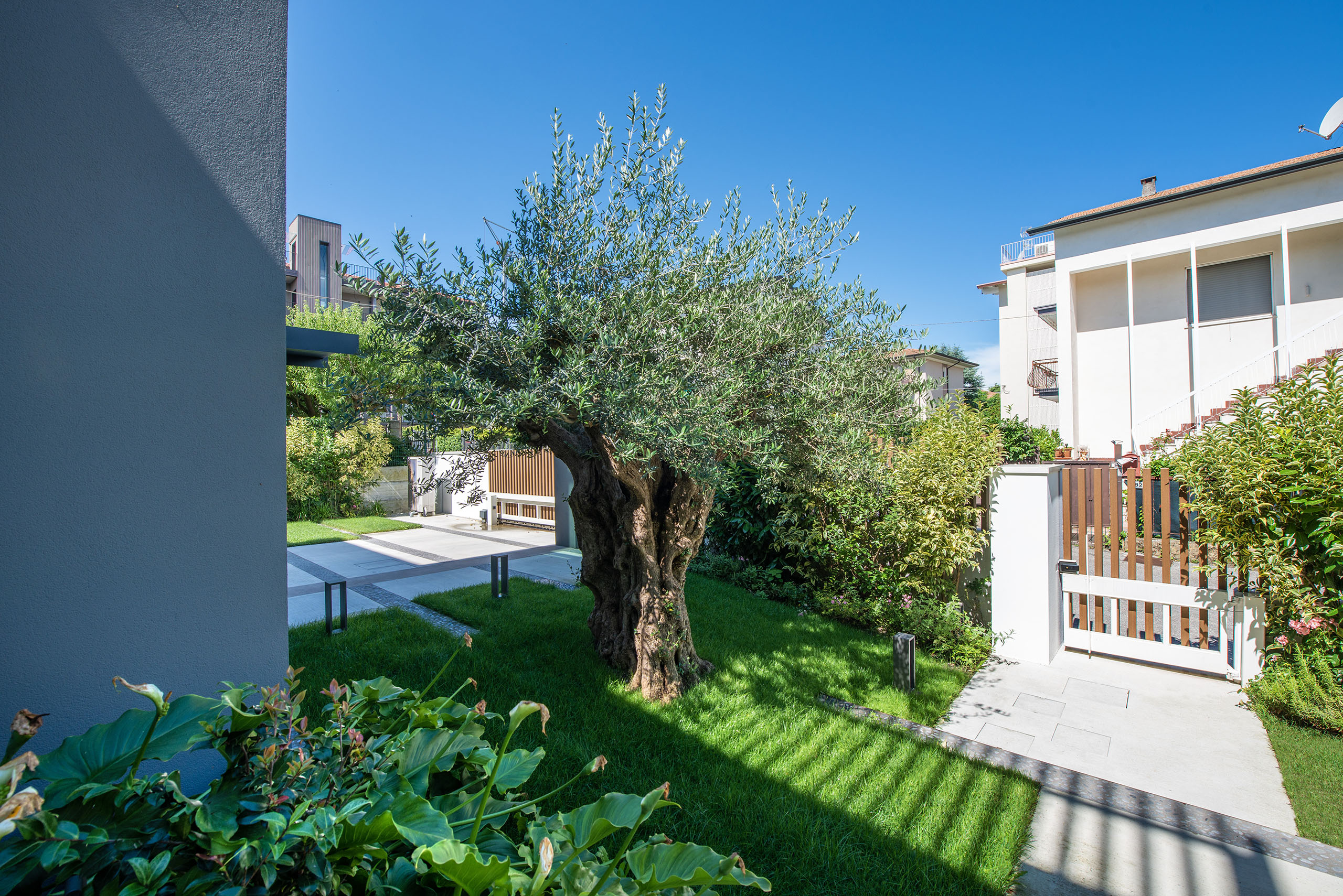 Il giardino di questa villa moderna, situata nel cuore del centro storico, rappresenta un perfetto equilibrio tra design contemporaneo e rispetto per l’ambiente circostante. Lo spazio verde si estende con eleganza attorno alla villa, offrendo un’oasi di tranquillità e bellezza in un contesto urbano.