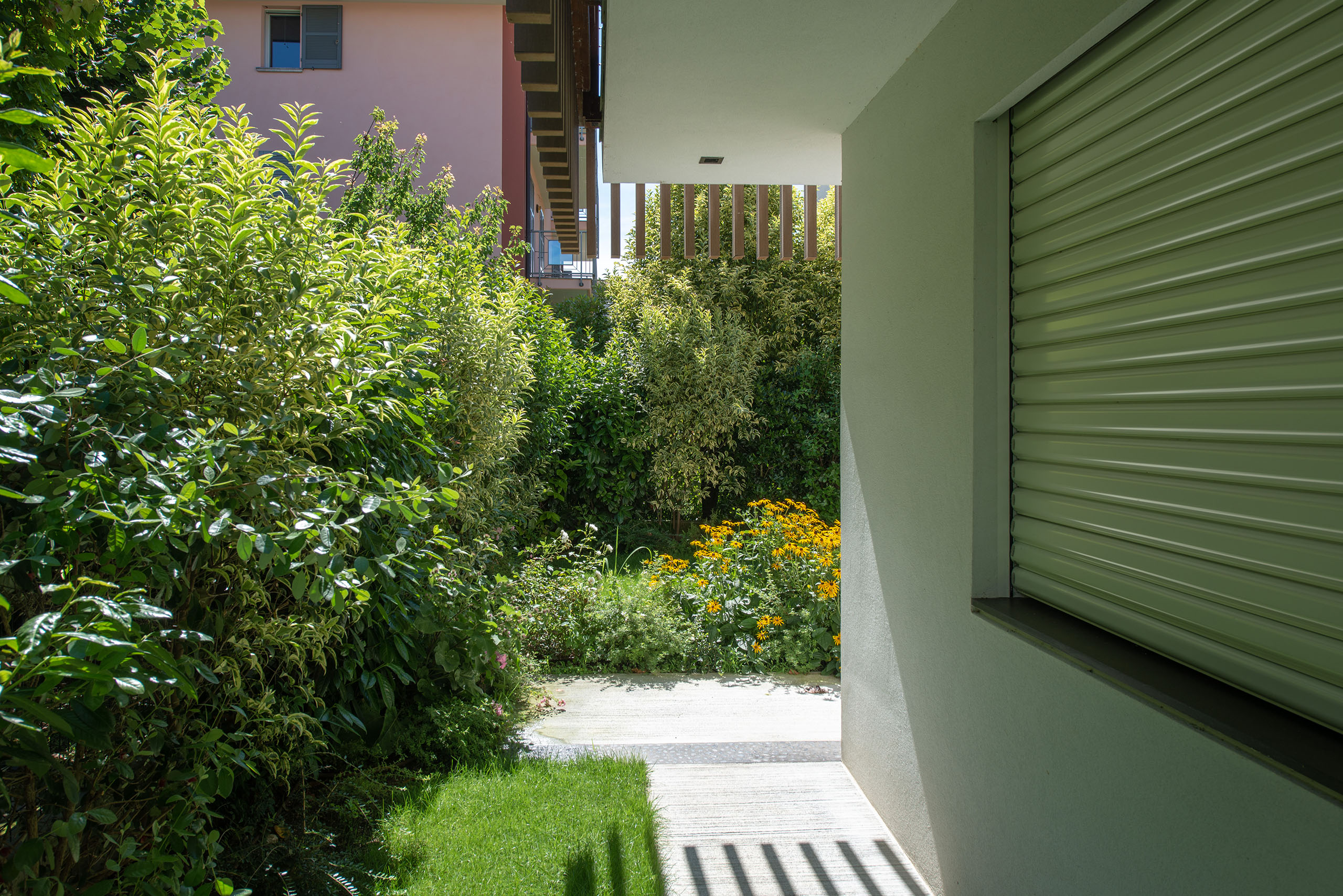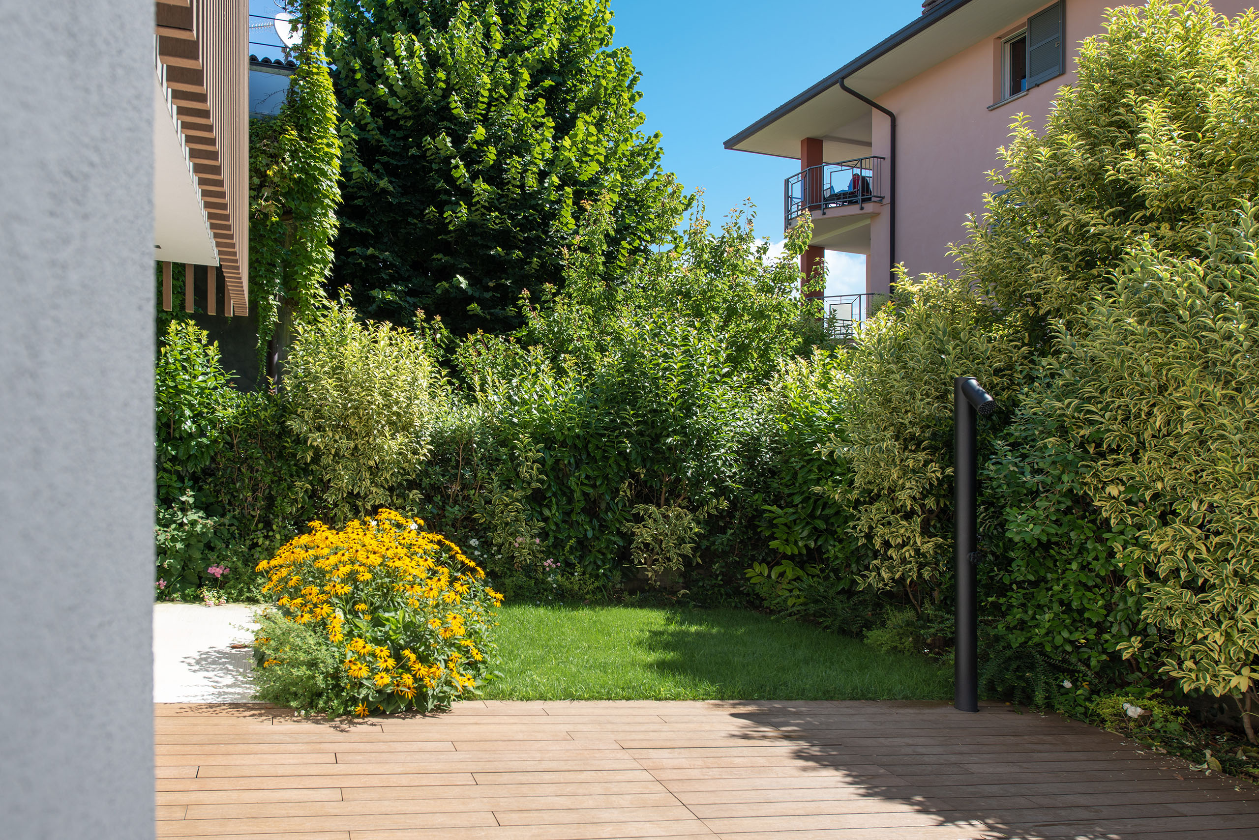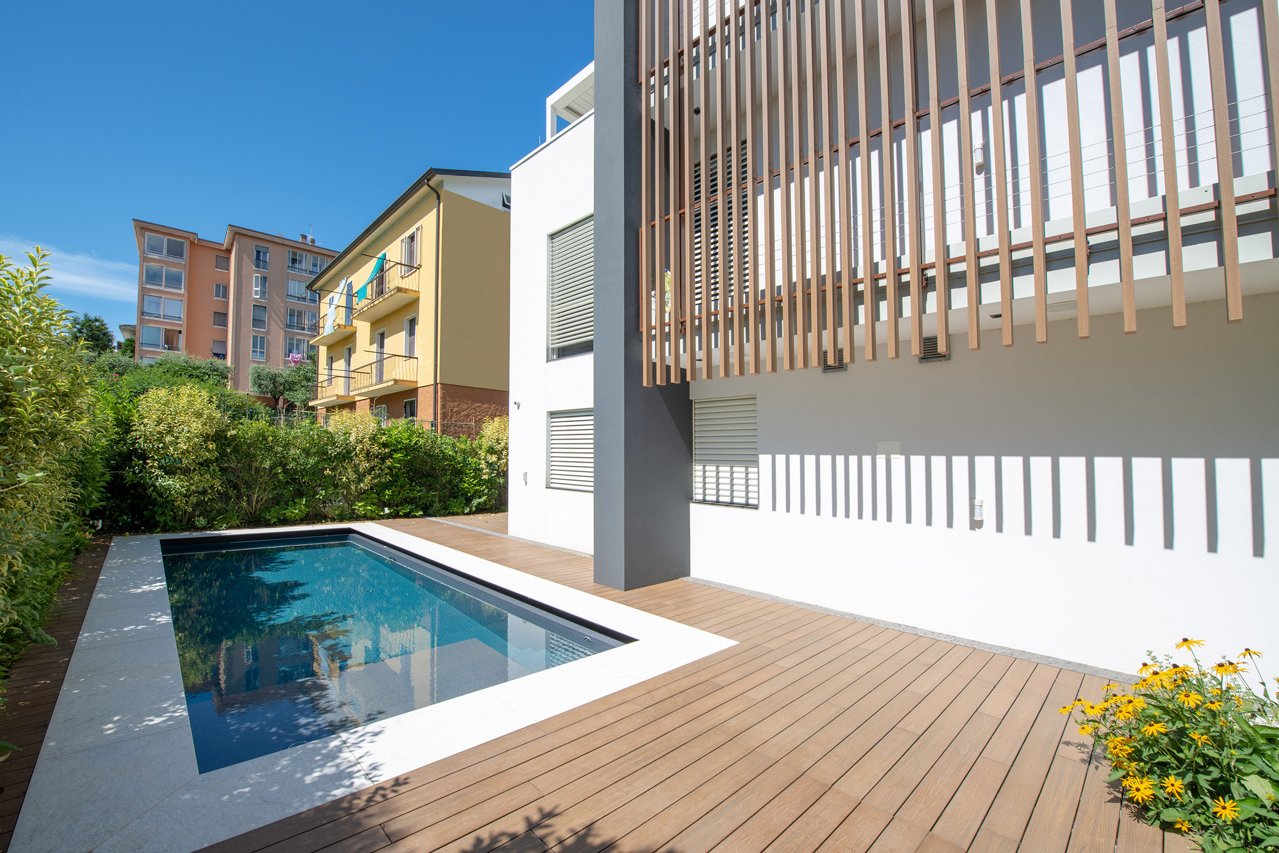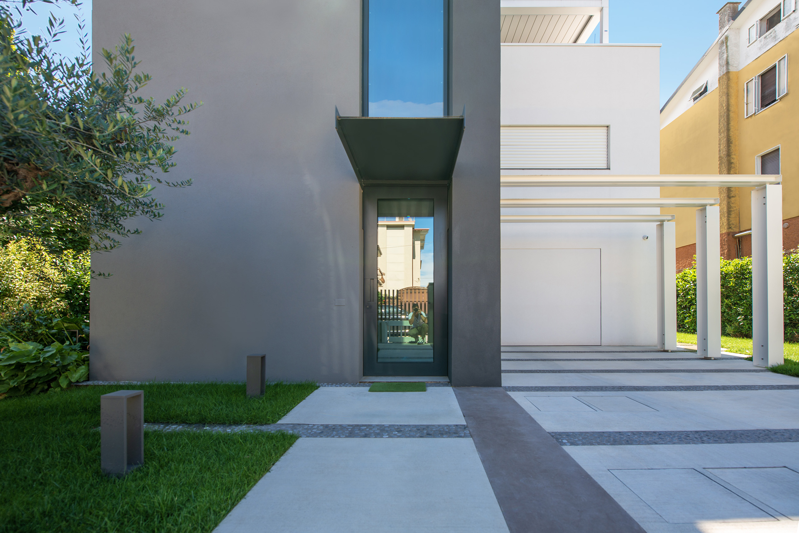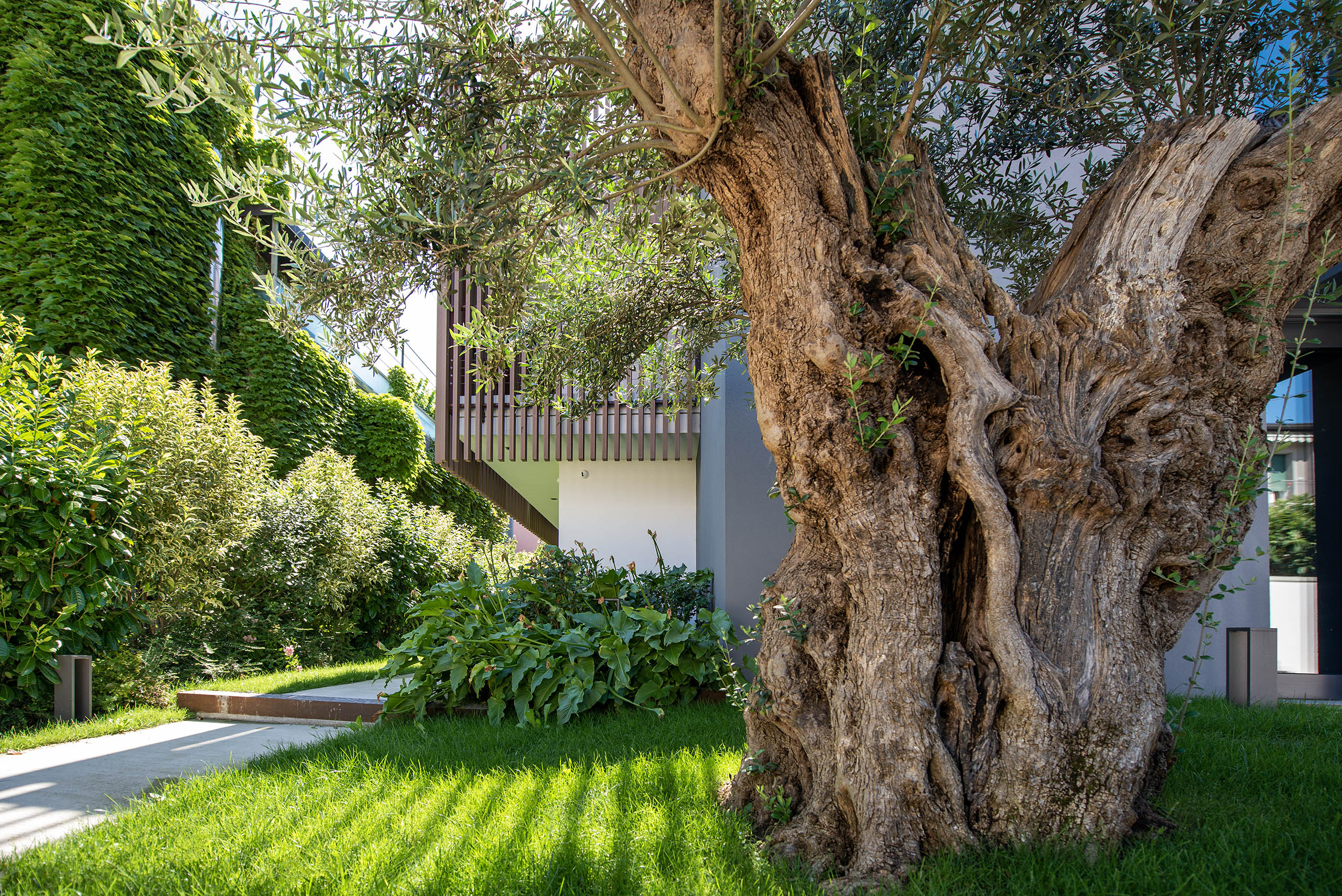 Il giardino di questa villa moderna, situata nel cuore del centro storico, rappresenta un perfetto equilibrio tra design contemporaneo e rispetto per l’ambiente circostante. Lo spazio verde si estende con eleganza attorno alla villa, offrendo un’oasi di tranquillità e bellezza in un contesto urbano.