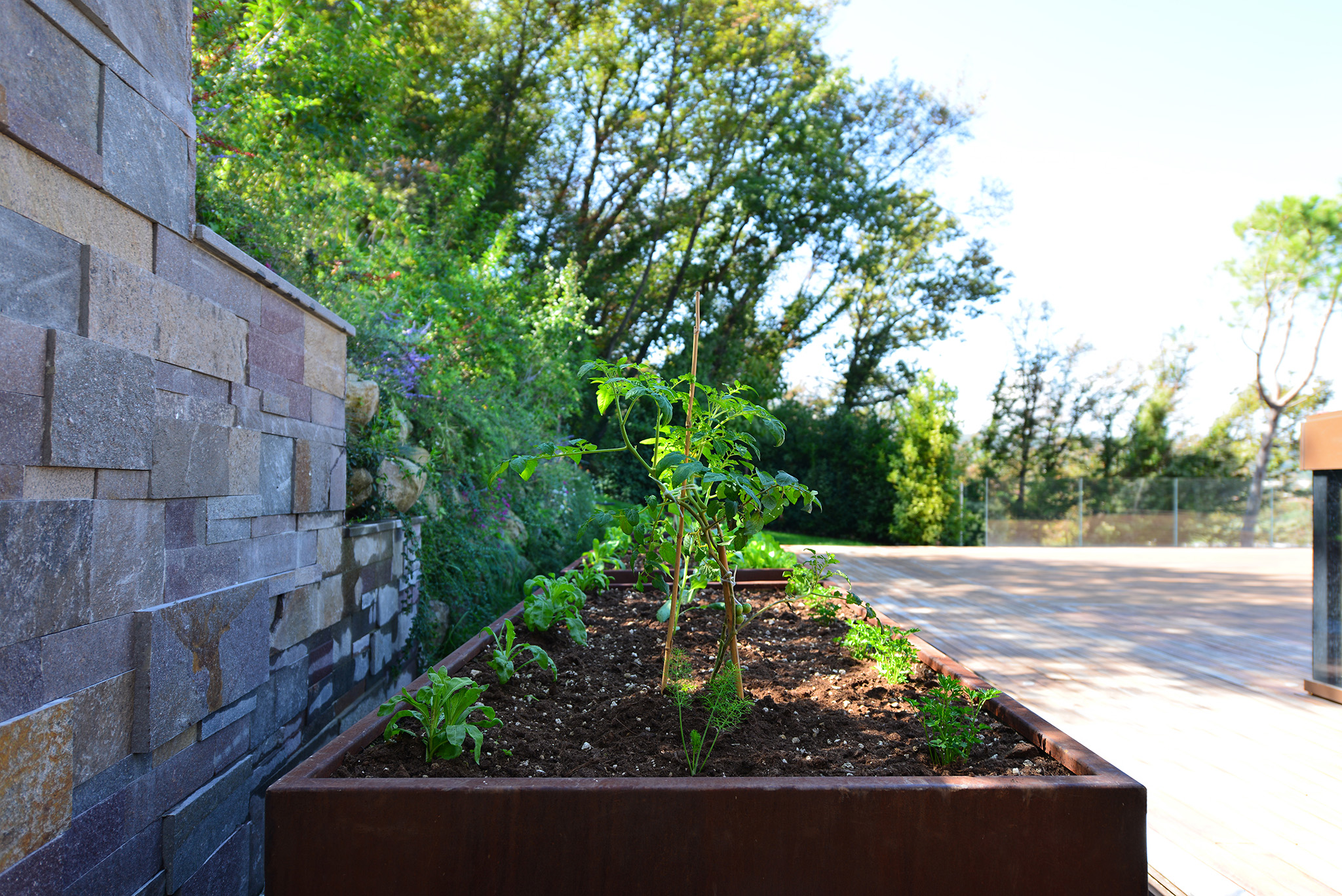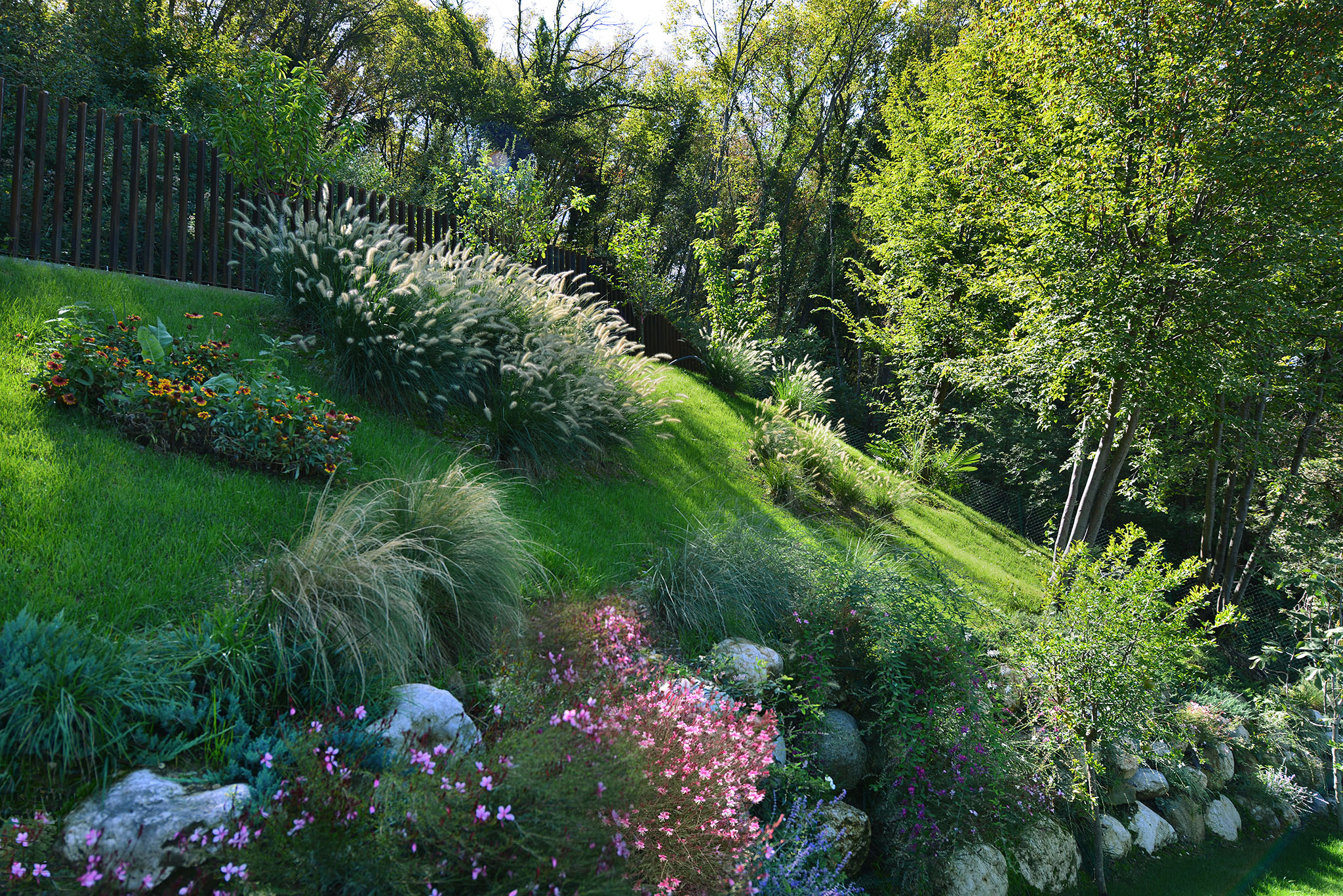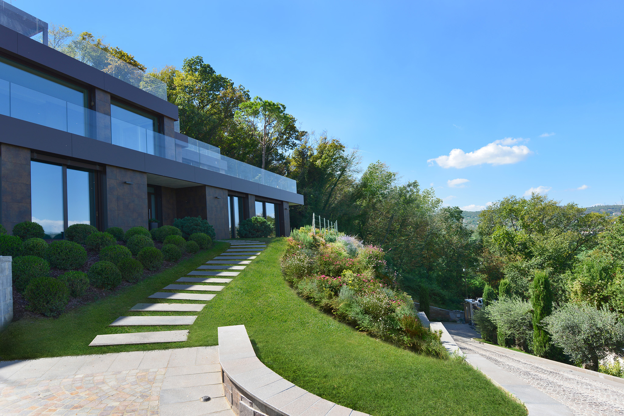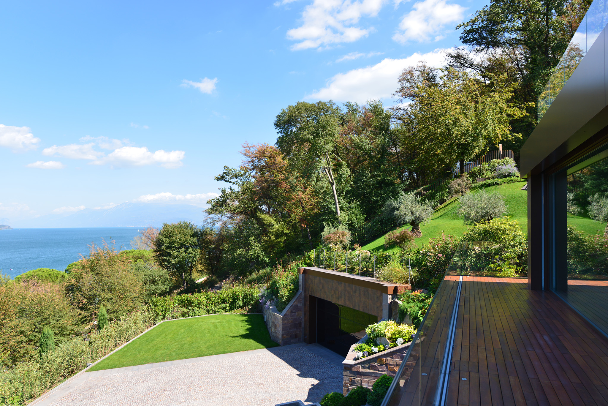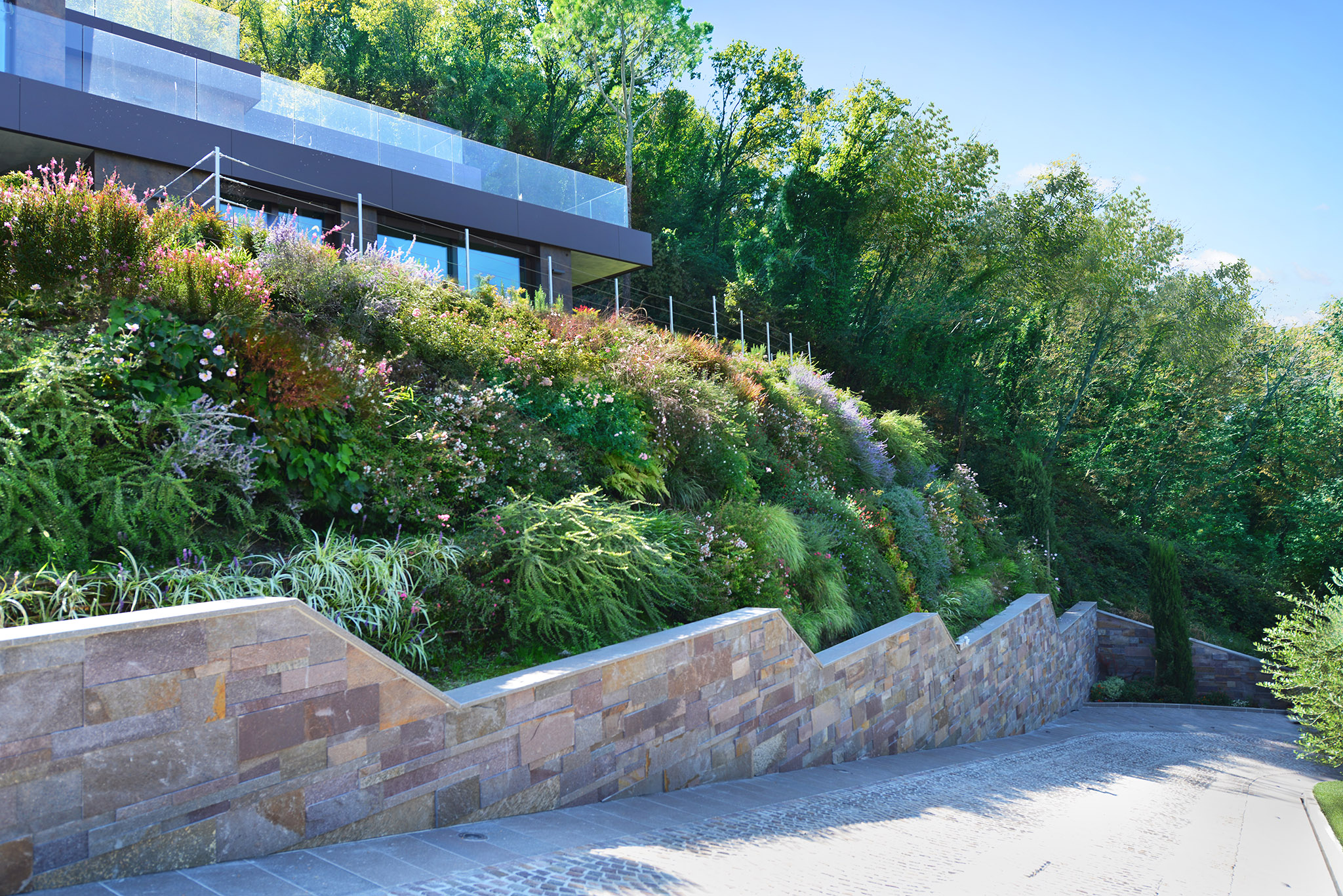 I muri in terra rinforzata, valorizzati con in nostro verde, creano uno splendido giardino verticale come in questa villa mozzafiato sul Lago di Garda.