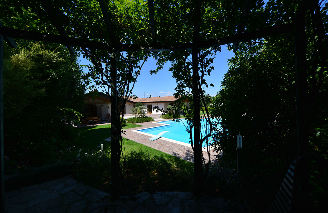 Le pavimentazioni pedonali sono state eseguite in porfido, mentre per il prendisole della piscina – che è a skimmer con sistema di filtrazione a sale – si è adoperato il marmo di Botticino.
