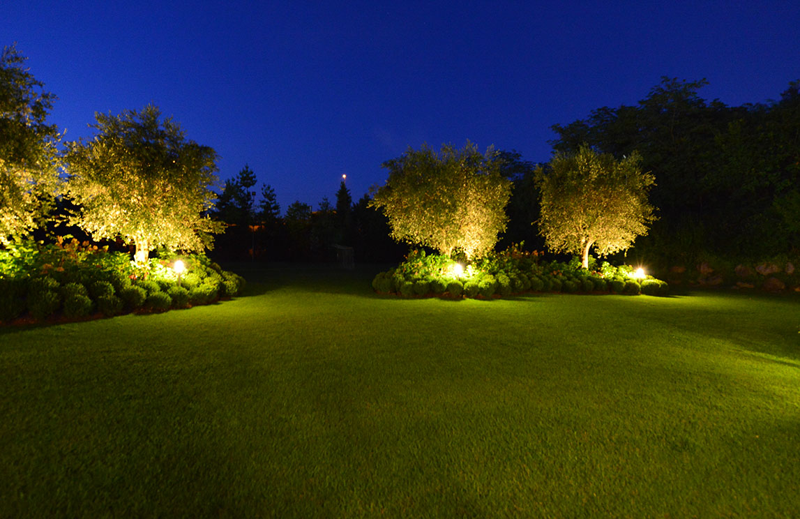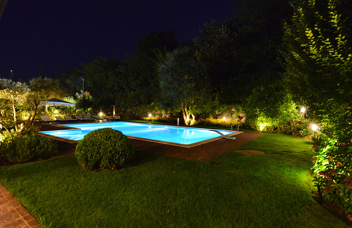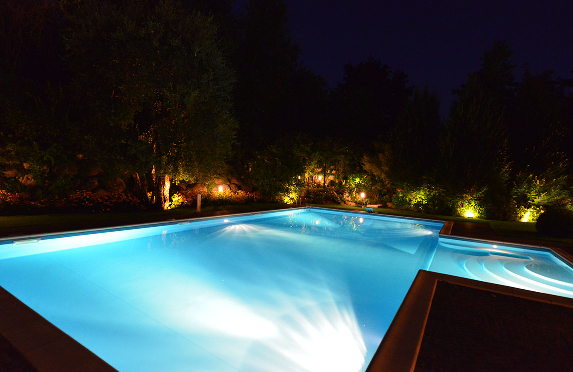 Per quanto riguarda l’impianto d’irrigazione, ne è stato realizzato uno automatico domotizzato con materiali di primissima qualità Toro®, mentre per l’illuminazione ne è stata realizzata una scenografica domotizzata, con fari ad incasso per le piante e le aiuole, con fari spot a fiammifero e fari a immersione per la piscina.