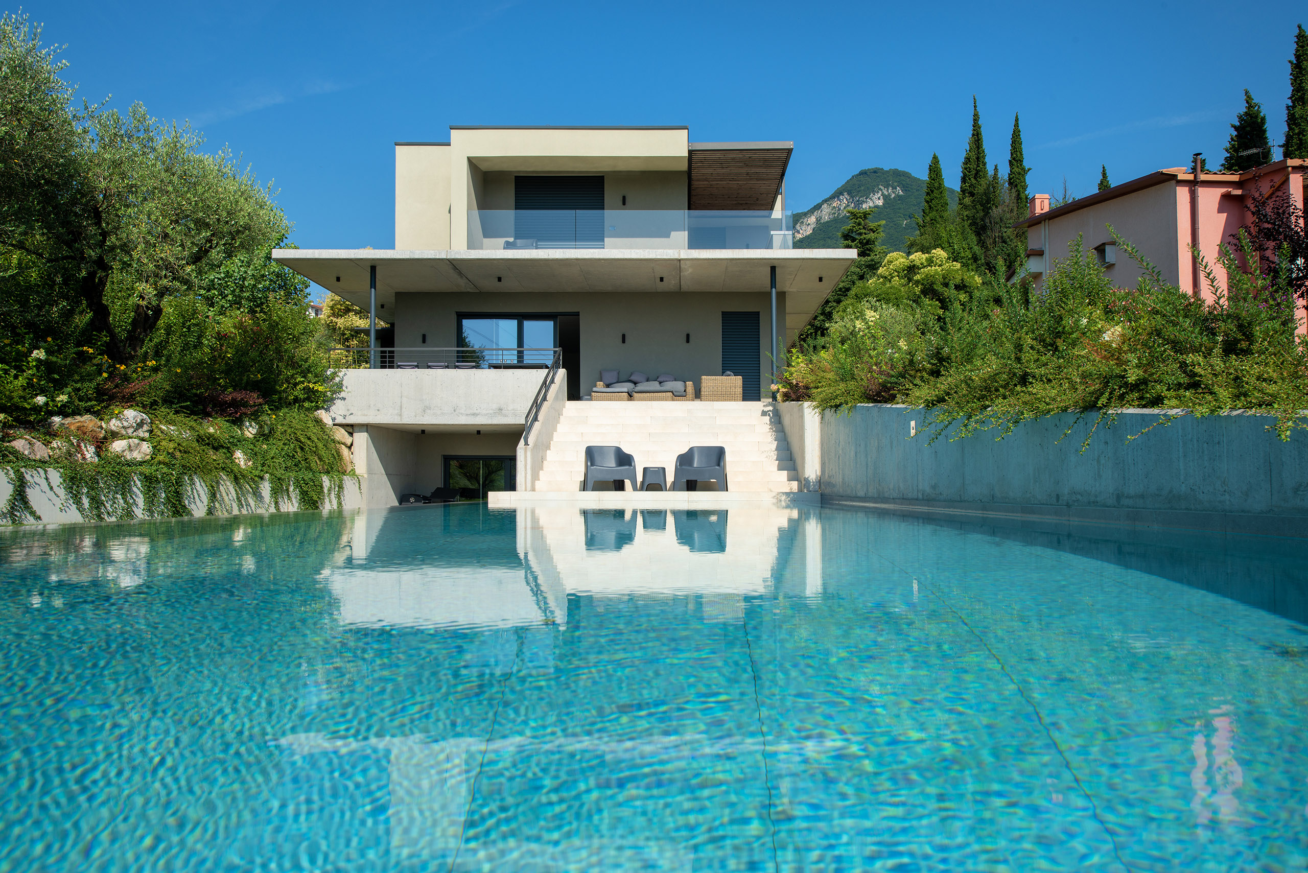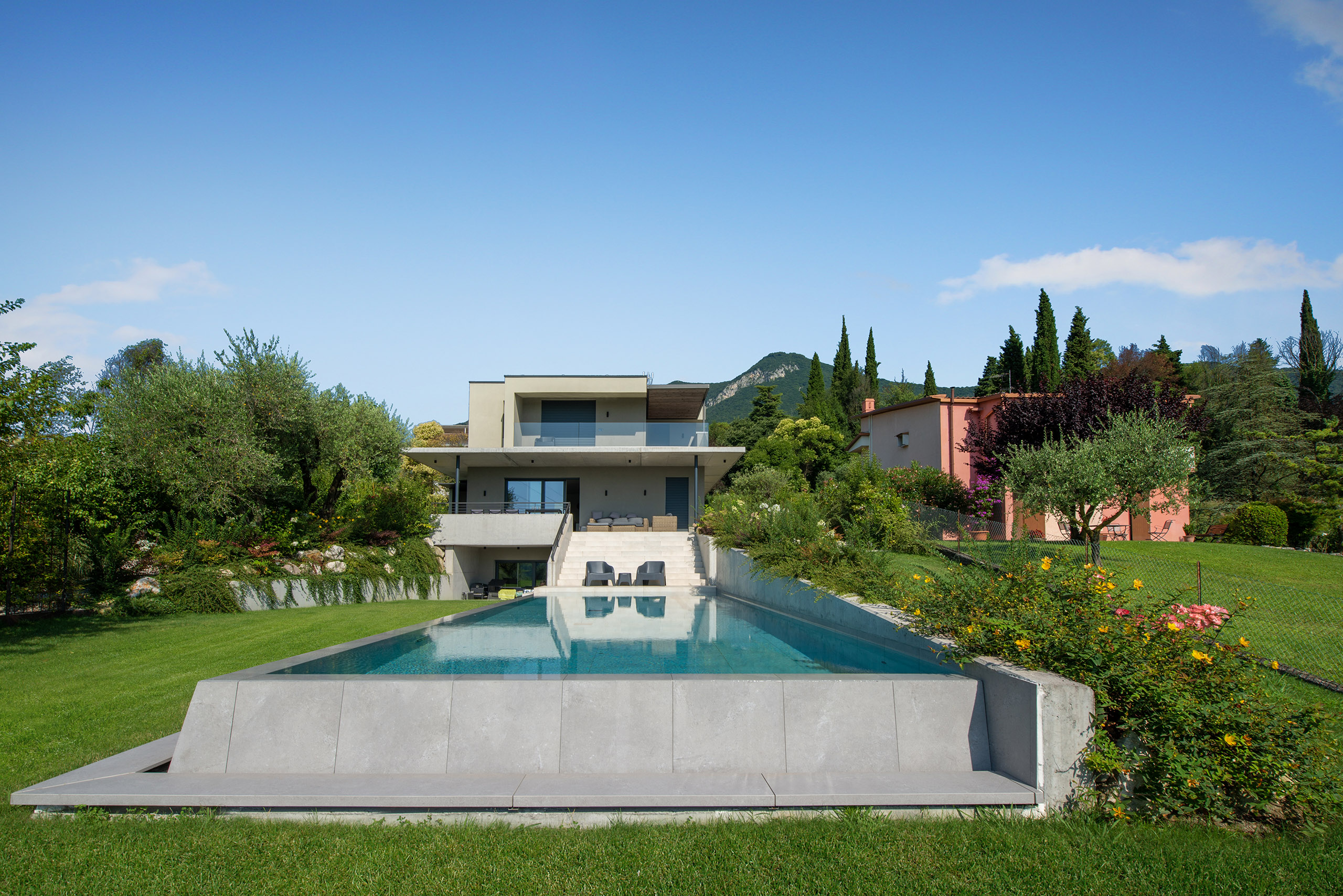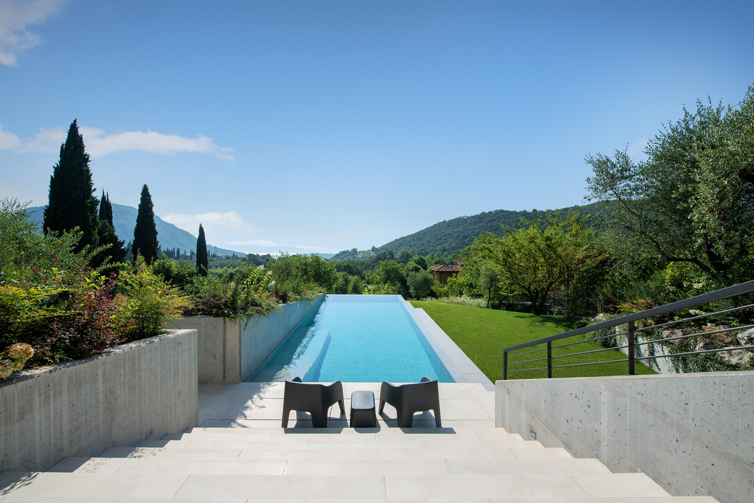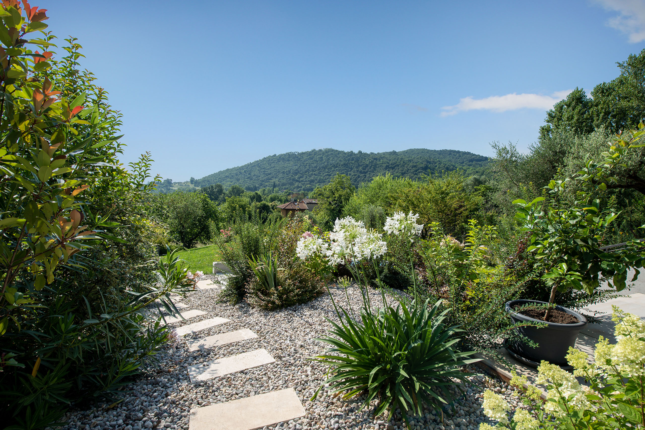 Il giardino di questa villa, situata in un piccolo borgo rurale del Lago di Garda, si estende su una dolce collina che scende verso le acque cristalline del Lago di Garda, offrendo una vista panoramica mozzafiato. È un luogo che sembra uscito da un dipinto, dove ogni elemento è curato con attenzione per creare un ambiente sereno e accogliente.